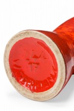 West German Mid-Century hourglass-form ceramic vase with a red and orange speckled glaze. (SCHEURICH, mark on bottom, W. GERMANY 244-17).