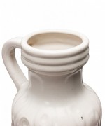 West German Mid-Century white cermaic pitcher with an incised pattern consisting of multi-level ovals between vertical wavy lines called "Koralle" below a horizontally ribbed lip and handle. (SCHEURICH, mark on bottom, W. GERMANY 488-26)