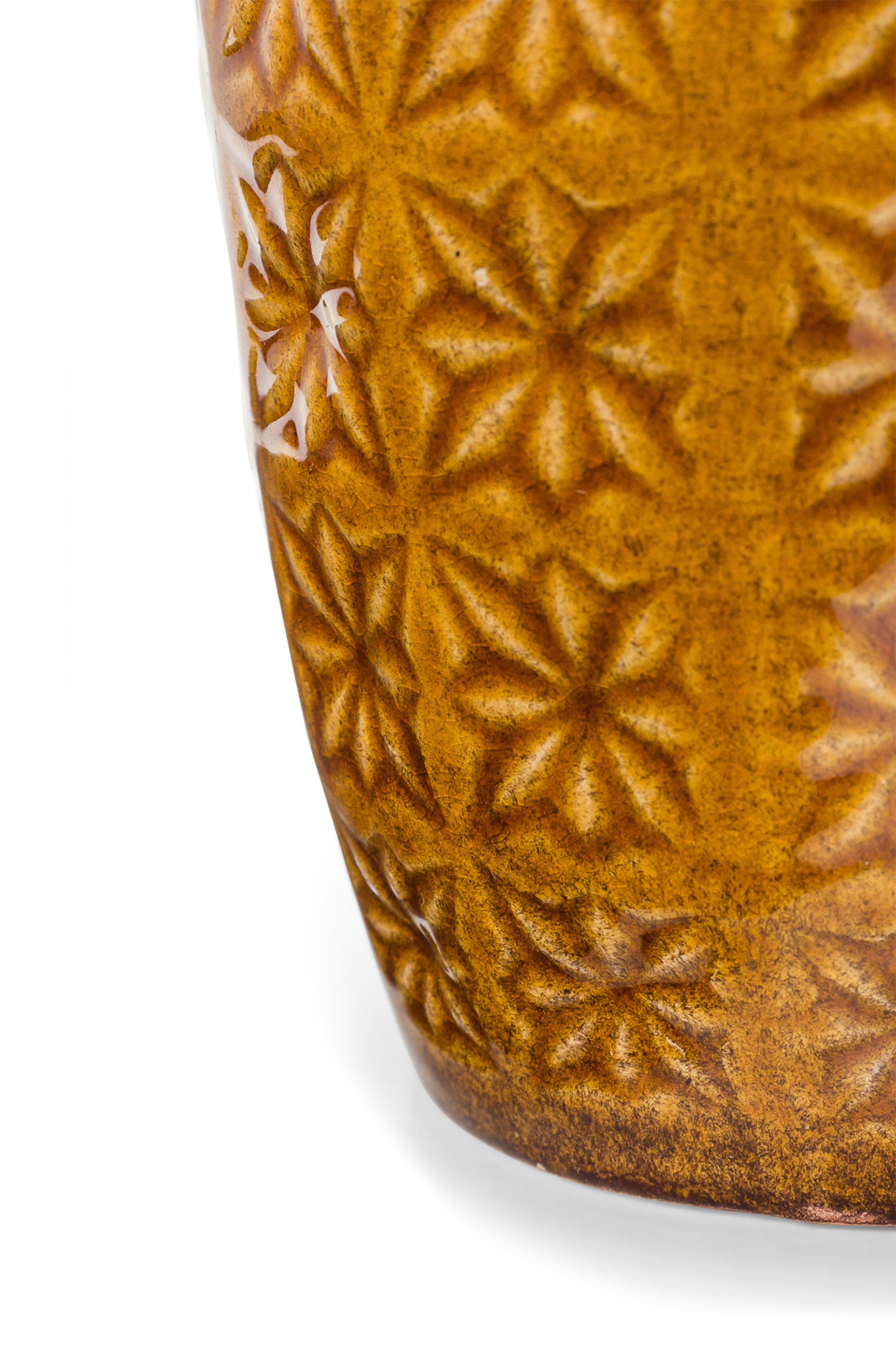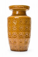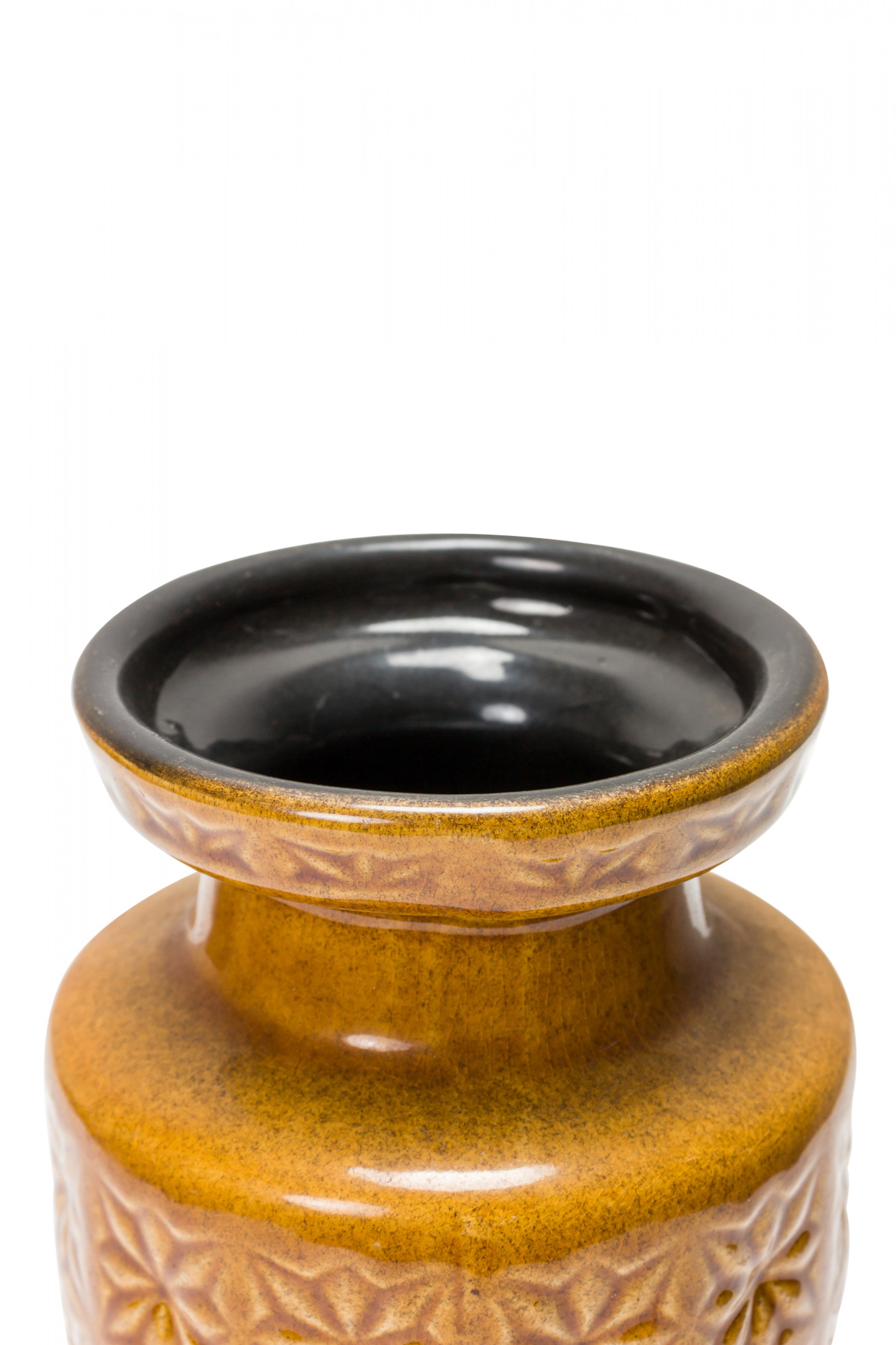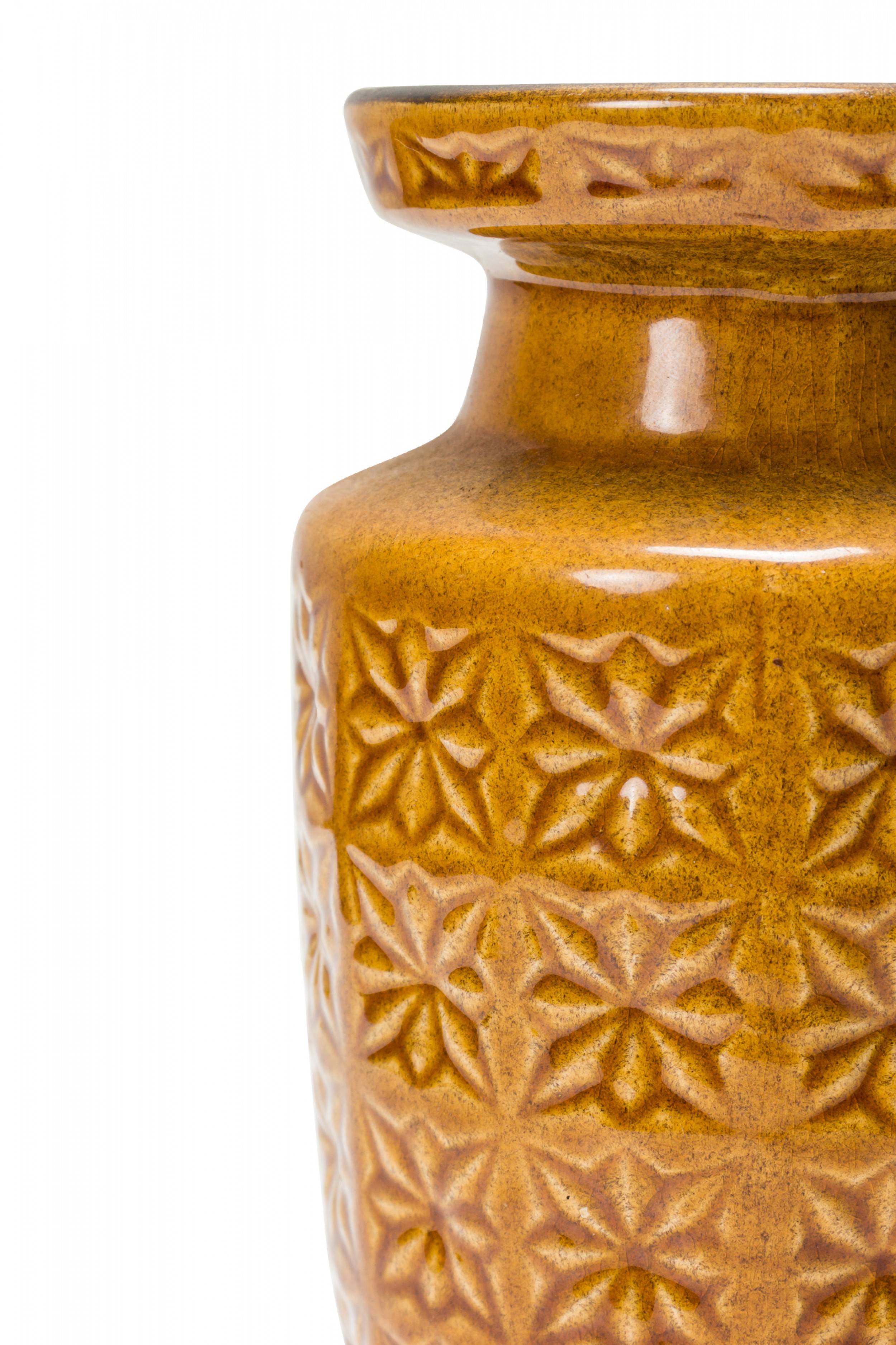 West German Mid-Century ceramic vase with an evenly spaced incised floral 'Prisma' design around the tapered body and a gold and brown glaze. (SCHEURICH, mark on bottom, W. GERMANY 261-18)