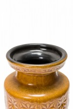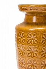 West German Mid-Century ceramic vase with an evenly spaced incised floral 'Prisma' design around the tapered body and a gold and brown glaze. (SCHEURICH, mark on bottom, W. GERMANY 261-18).