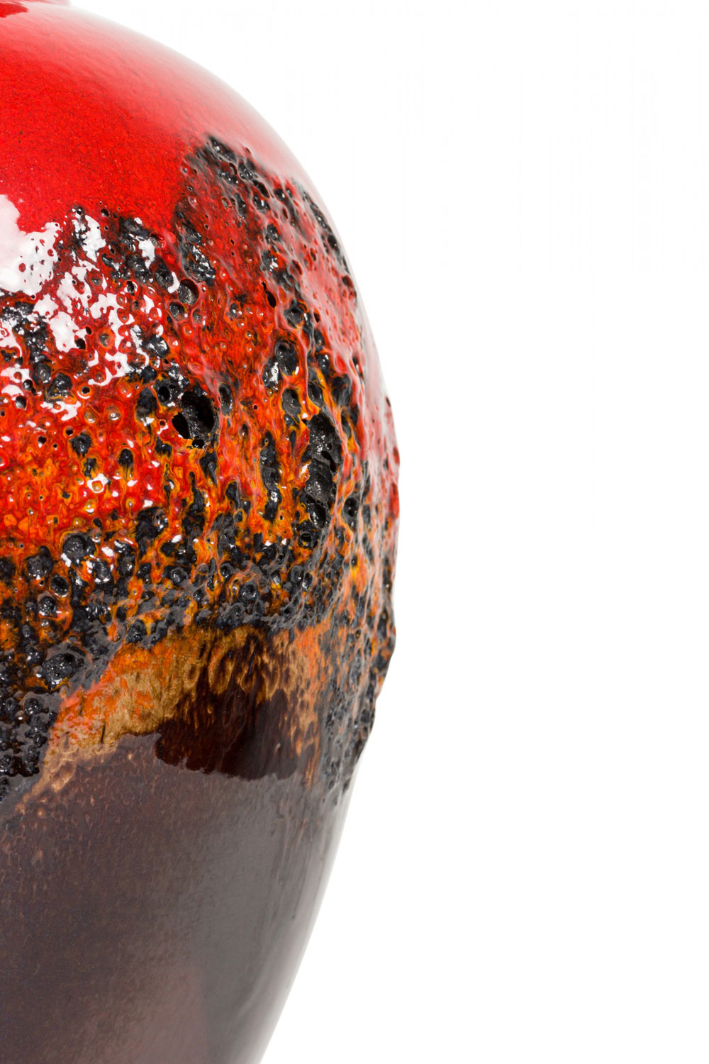 West German Mid-Century ceramic vase with a round bulbous form extending to a narrower neck with a pronounced lip and a pitted fat lava glaze that is red on top and black on the bottom. (SCHEURICH, mark on bottom, W. GERMANY 486-38)