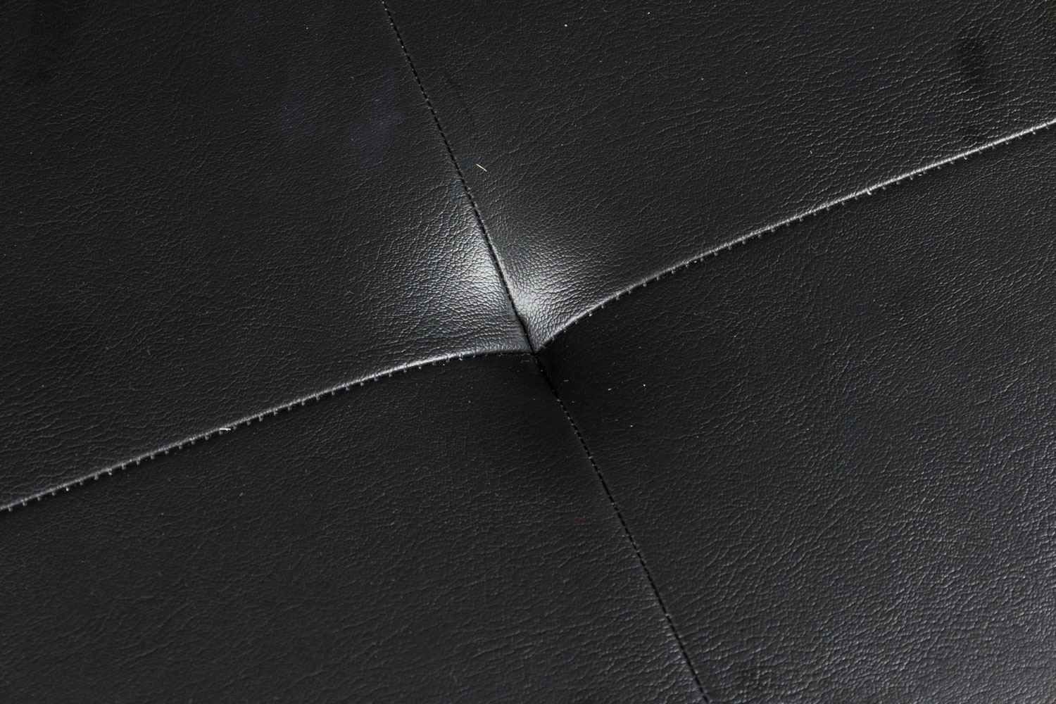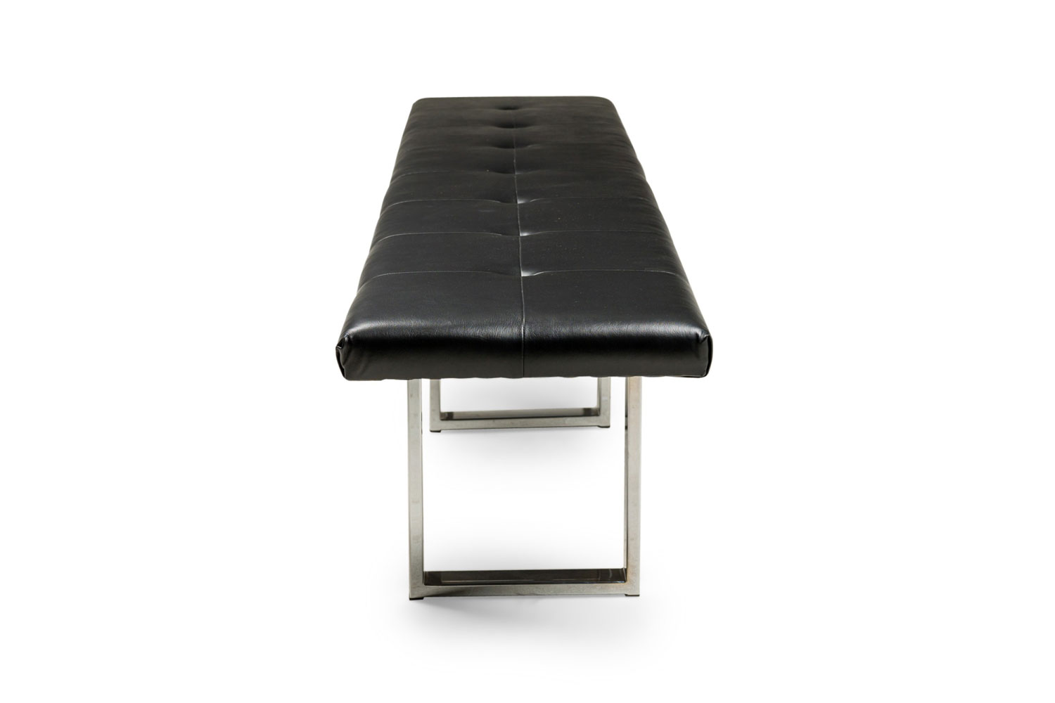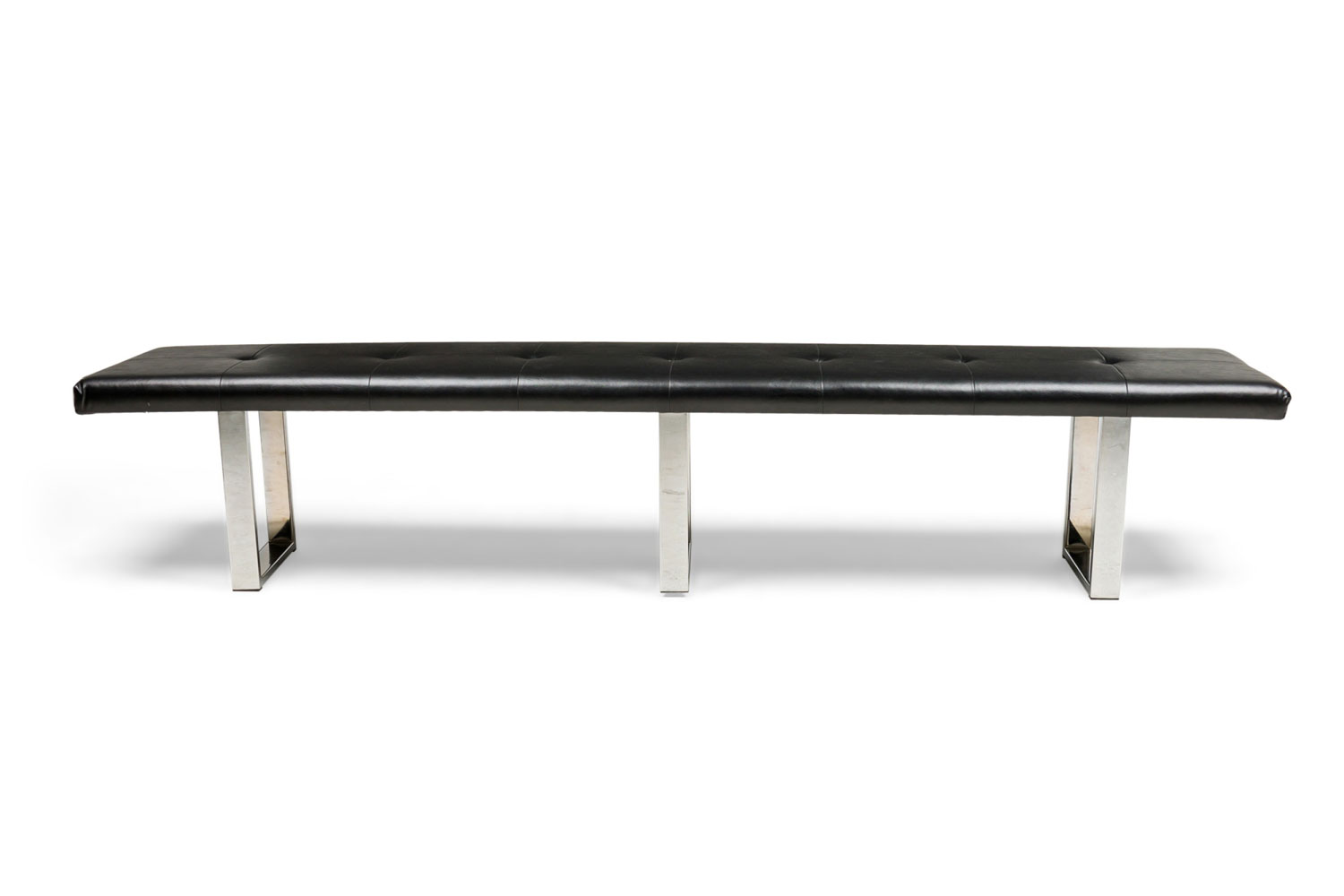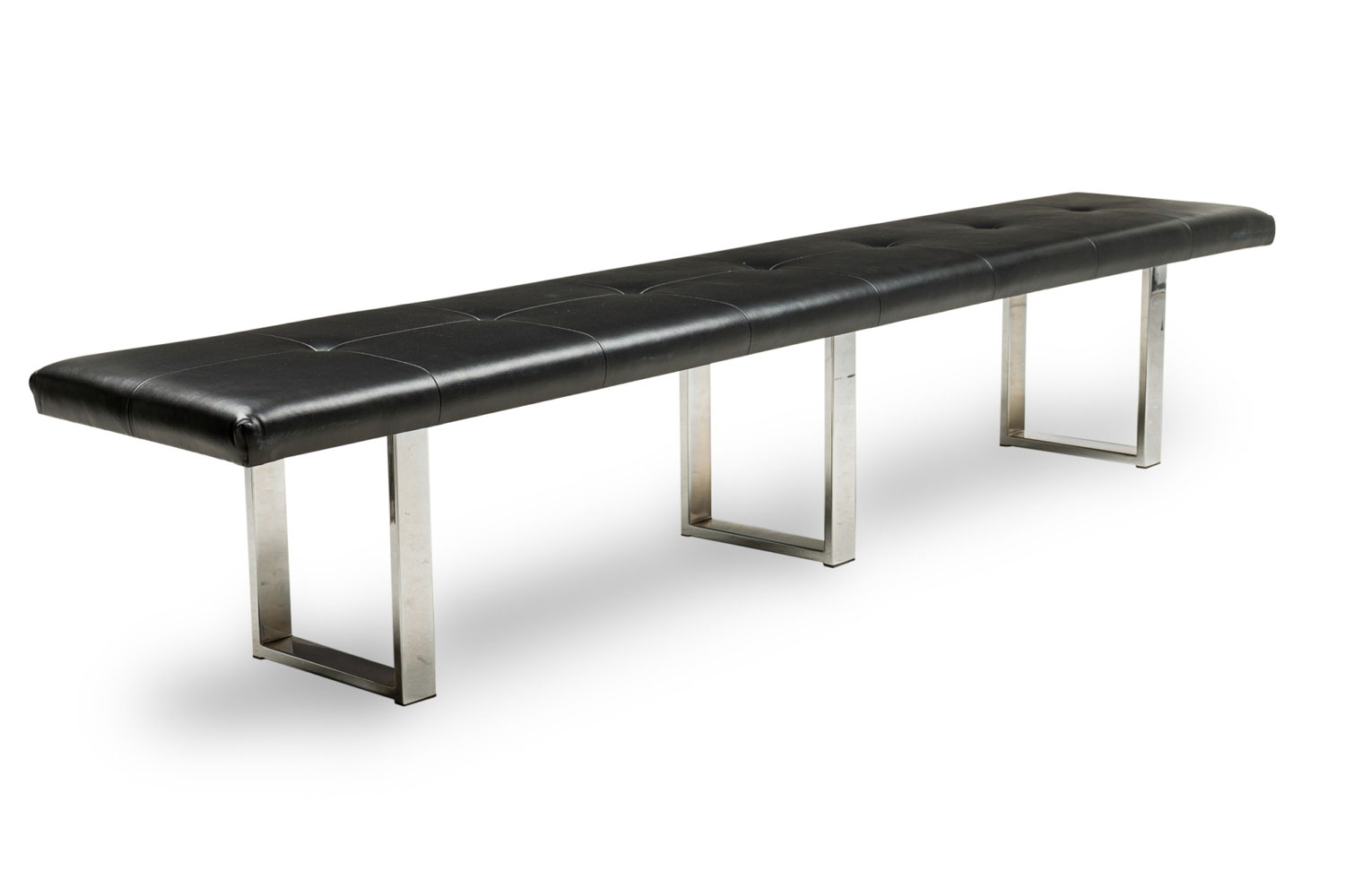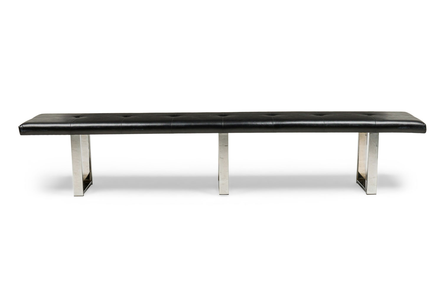 12 American Mid-Century large museum benches with a black tufted faux leather seat resting on three squared chrome support legs (PRICED EACH).