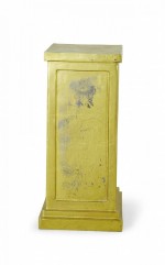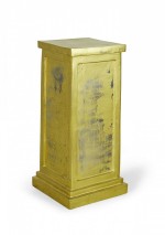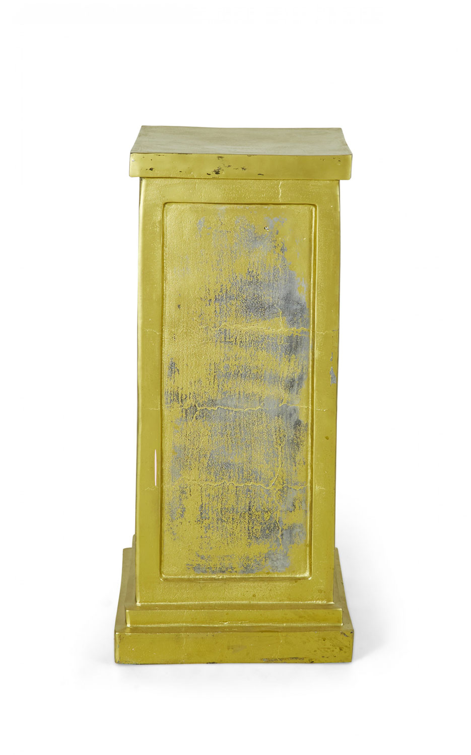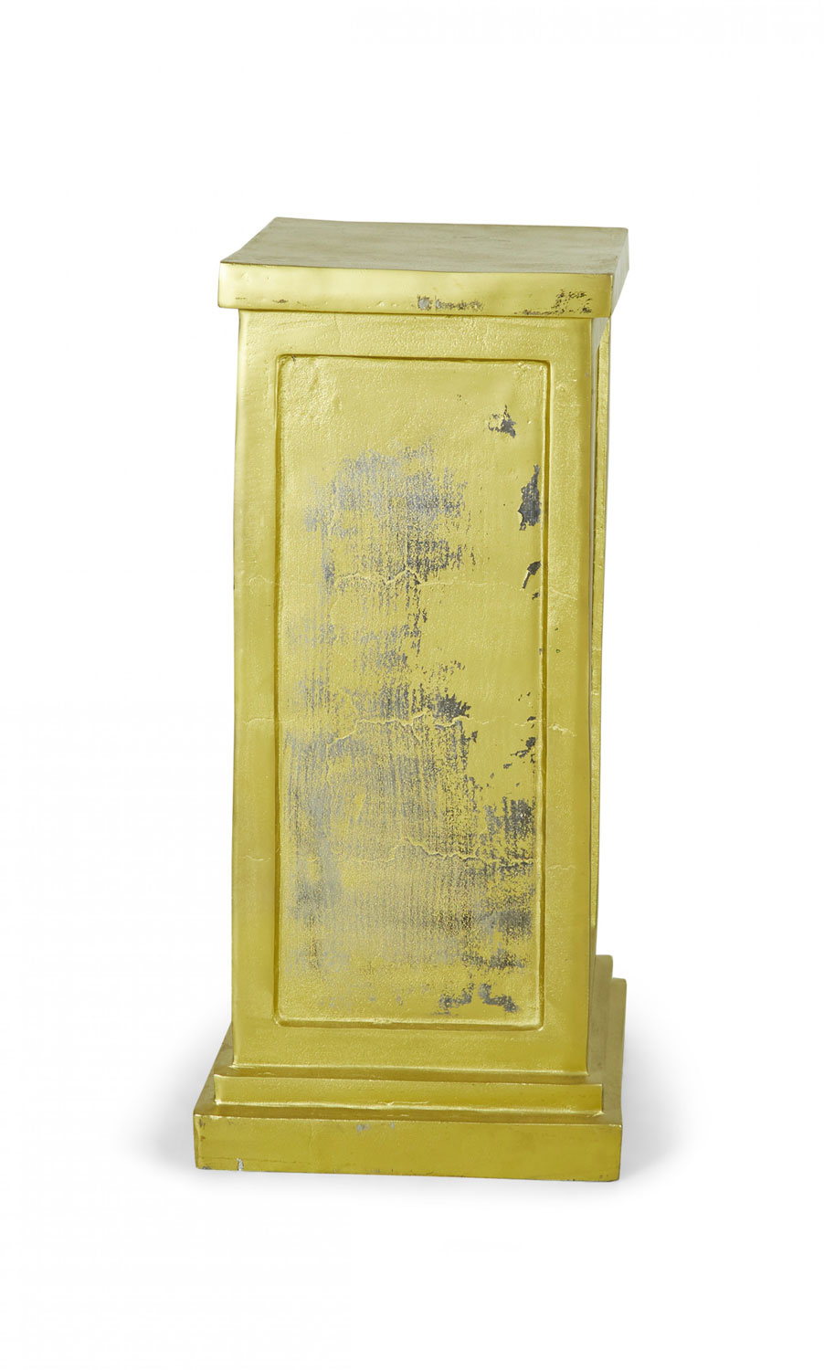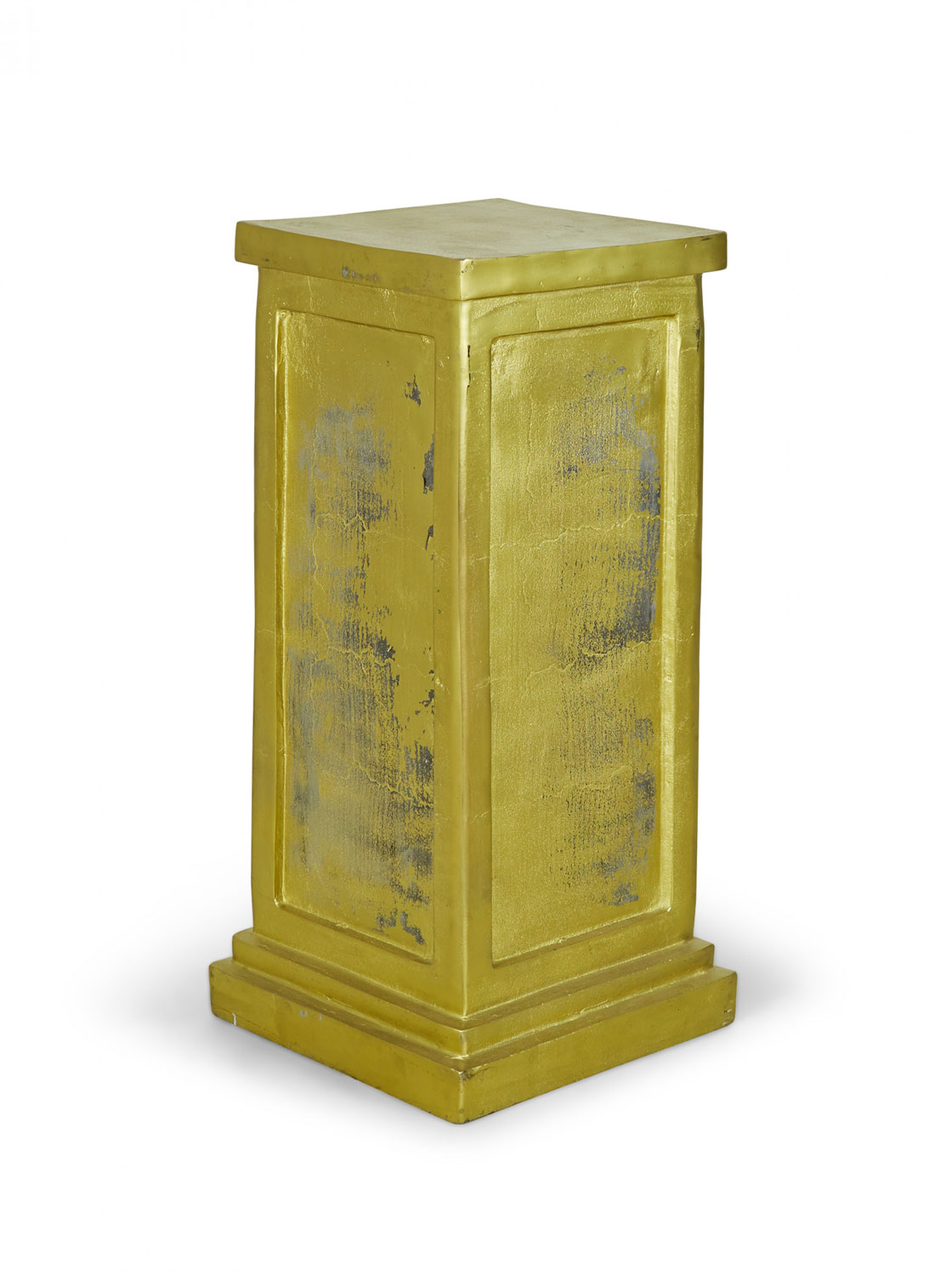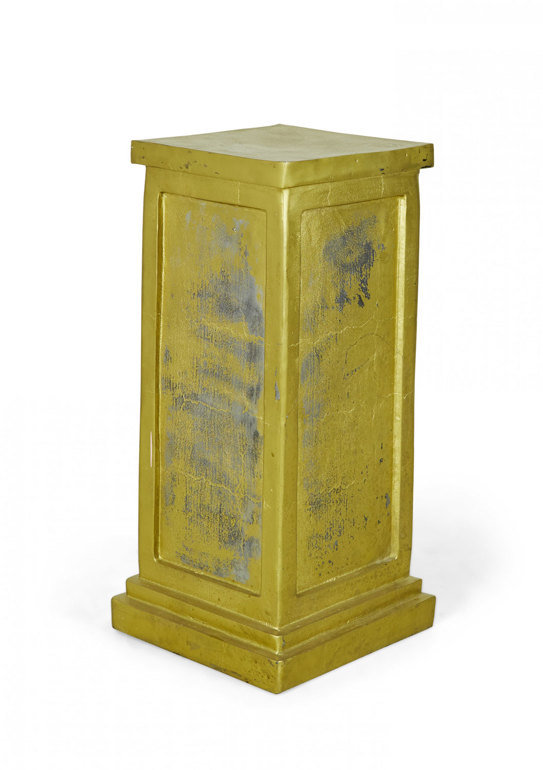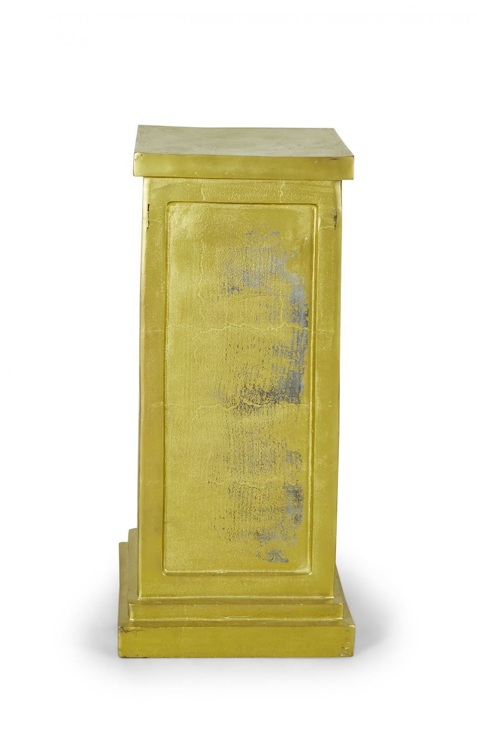 3 Contemporary square metal pedestals with a gold painted finish, a stepped base, and inset rectangular sides. (PRICED EACH).