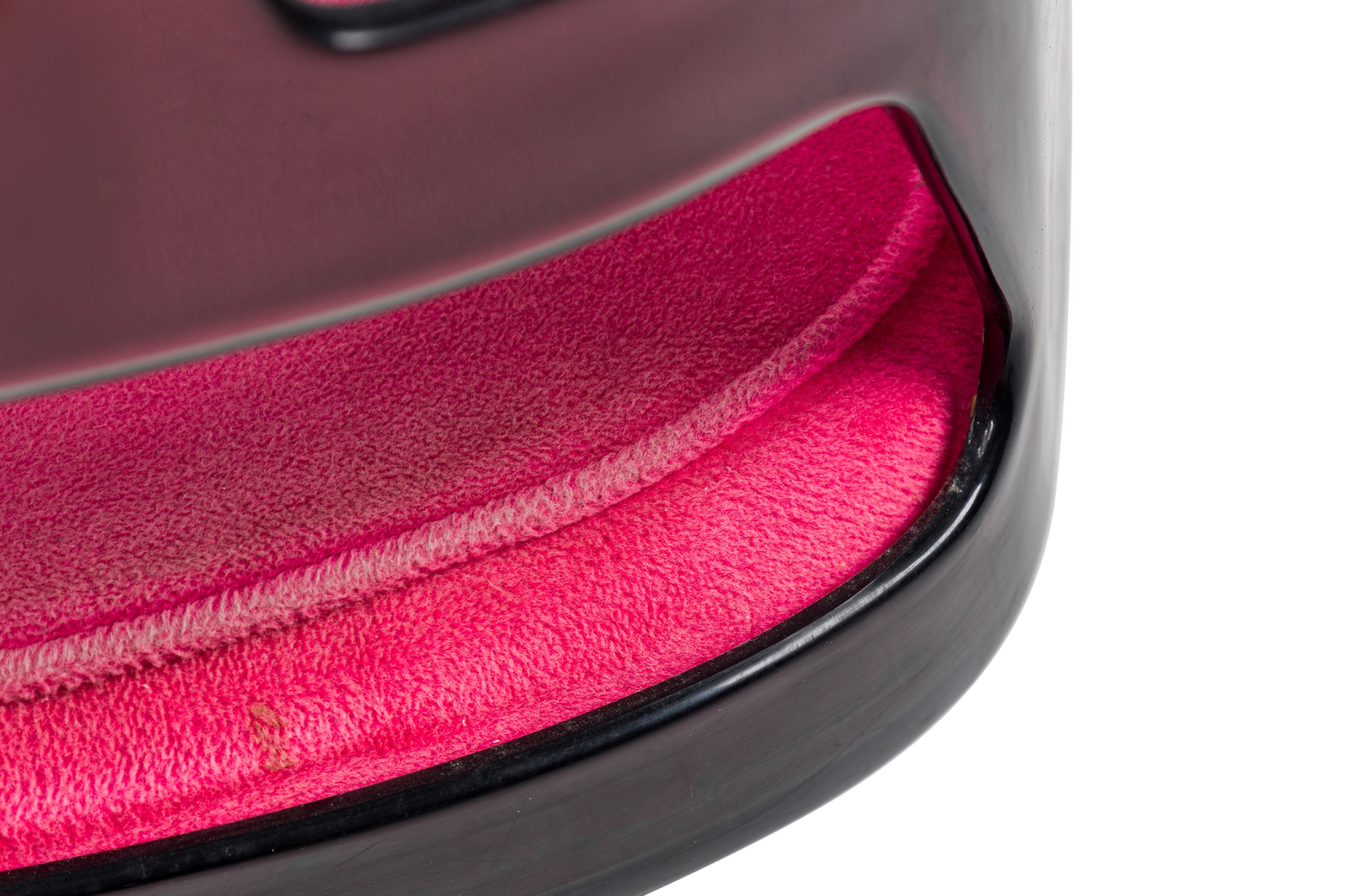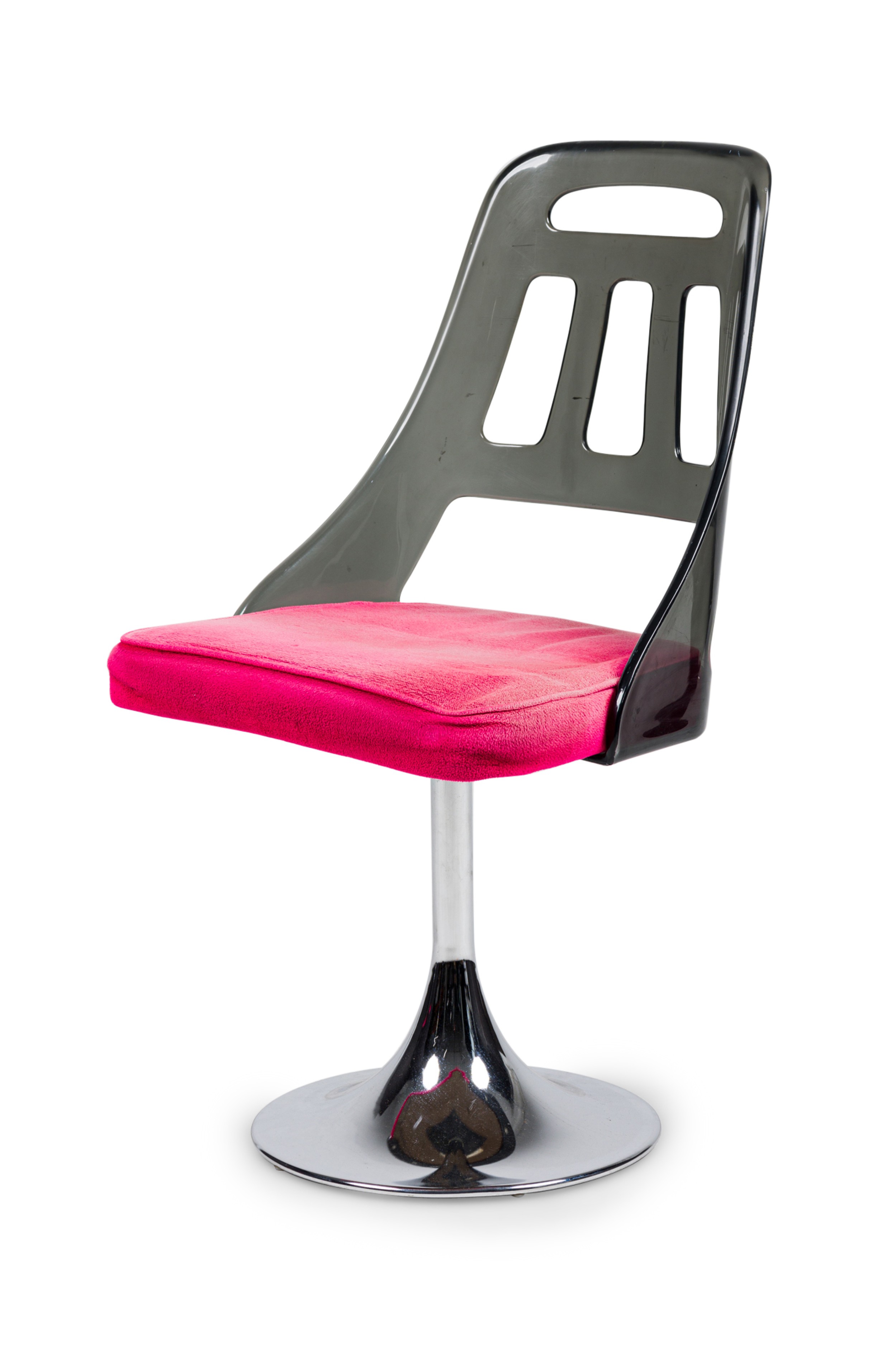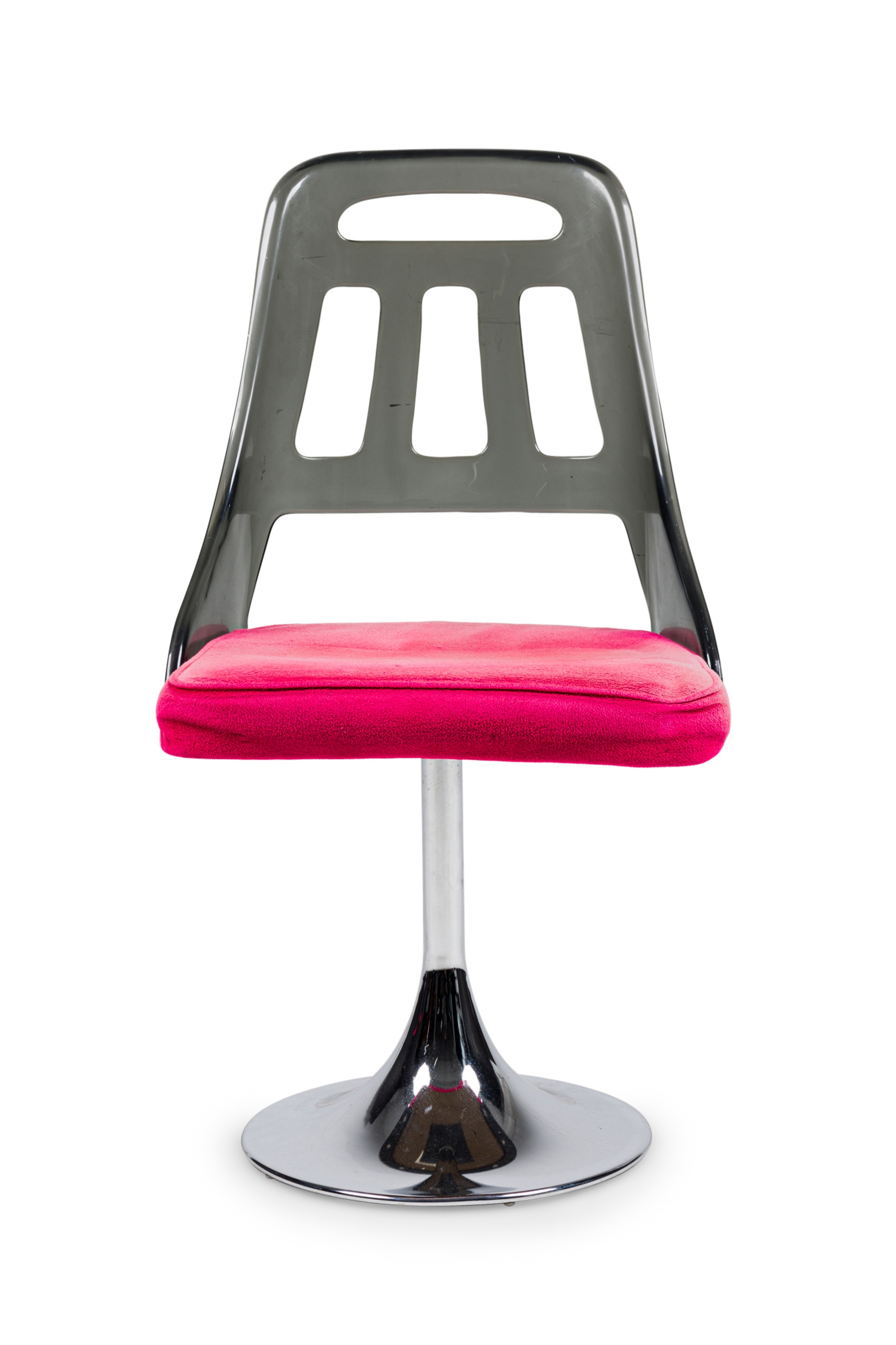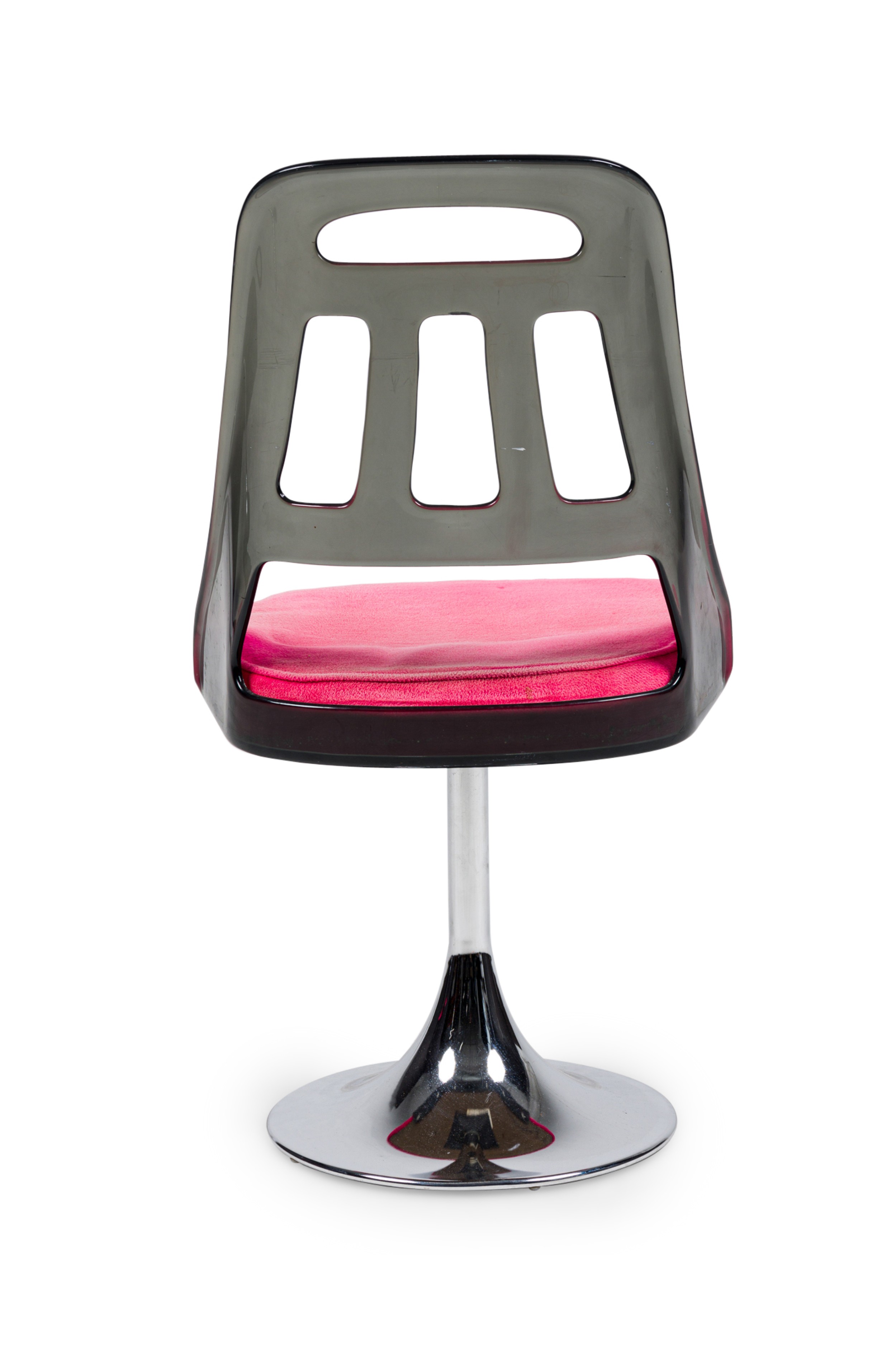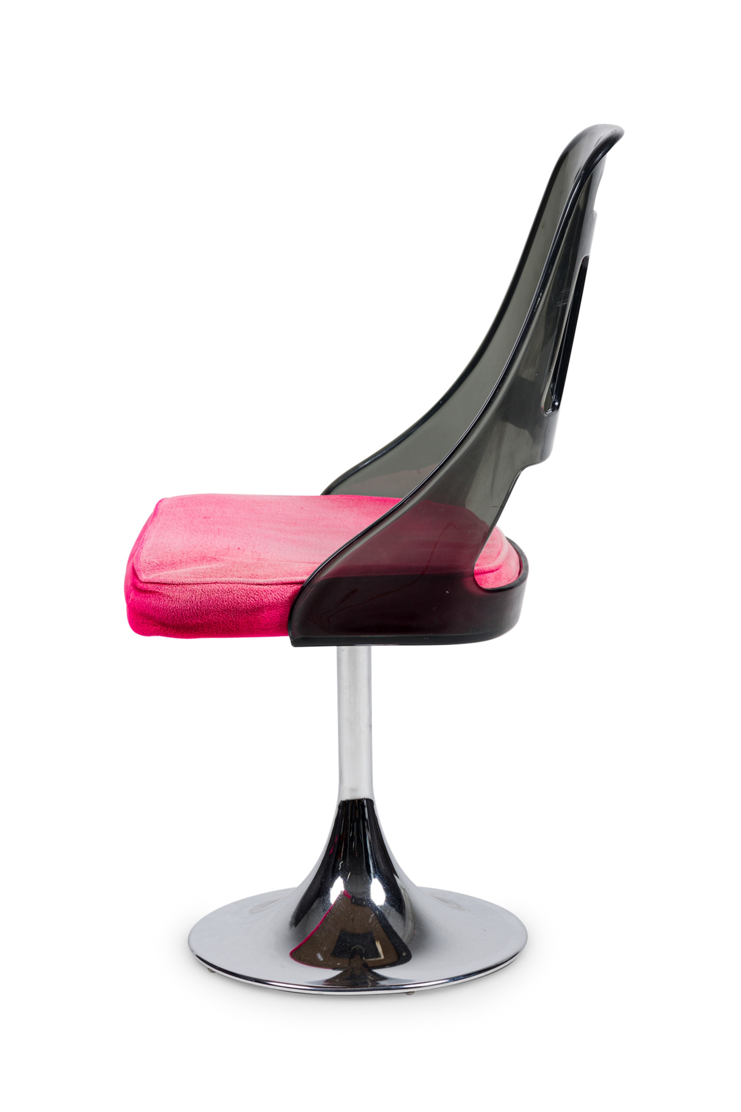 SET of 4 American Mid-Century smoky lucite swivel side chairs with pink velvet seats and chrome tulip base (Matching Dining Table: NWL7629)(PRICED AS SET)