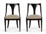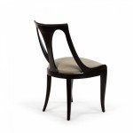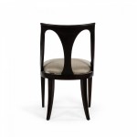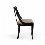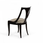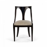 SET of 4 Contemporary Empire-style black lacquer dining chairs with a sleigh design open back with a cream & blue shot raw silk upholstered seats.