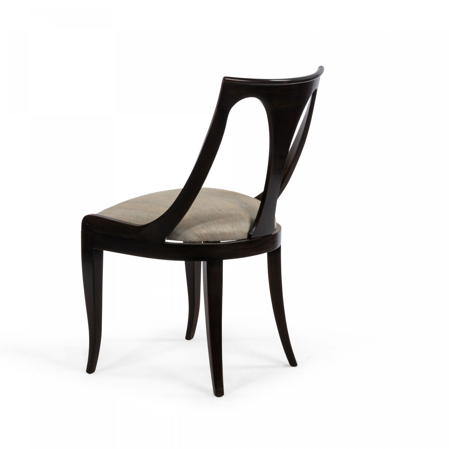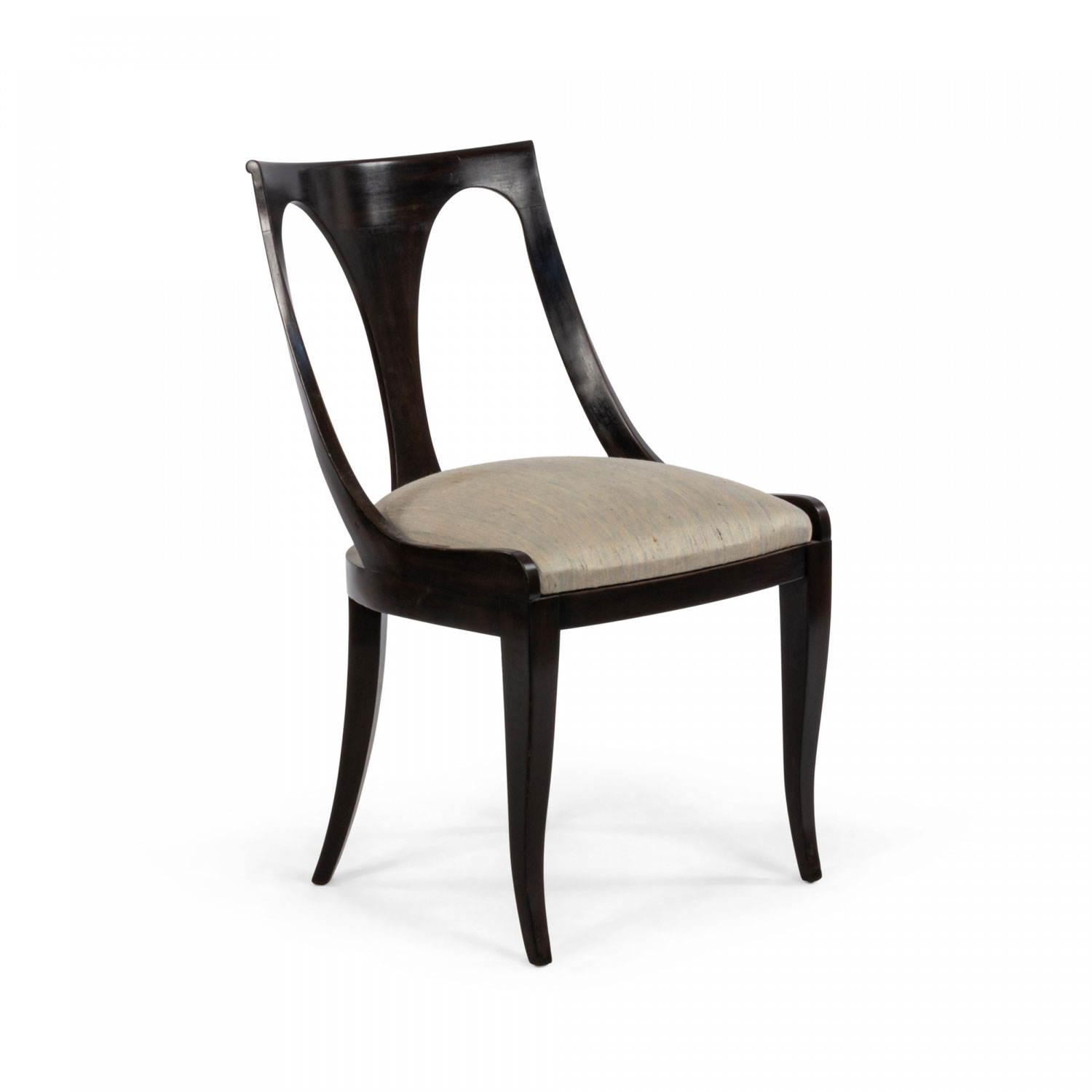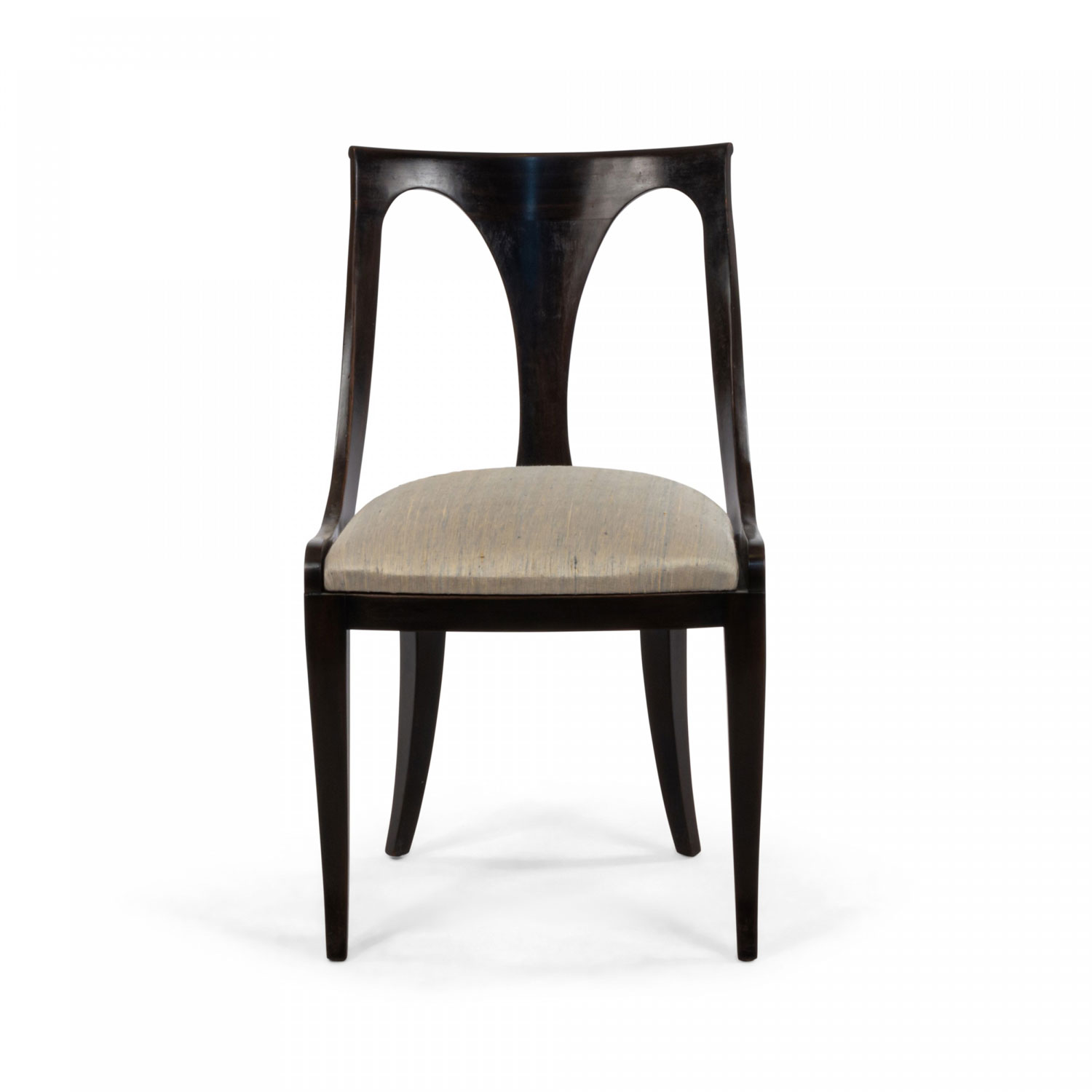 SET of 4 Contemporary Empire-style black lacquer dining chairs with a sleigh design open back with a cream & blue shot raw silk upholstered seats..