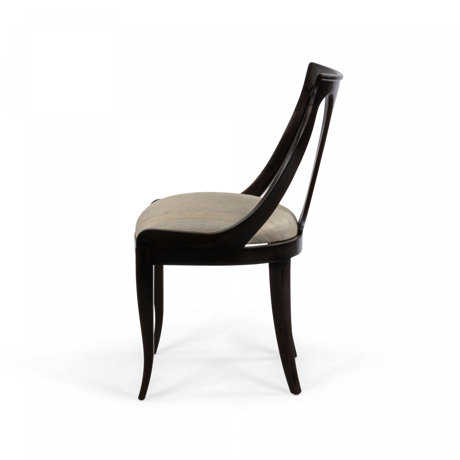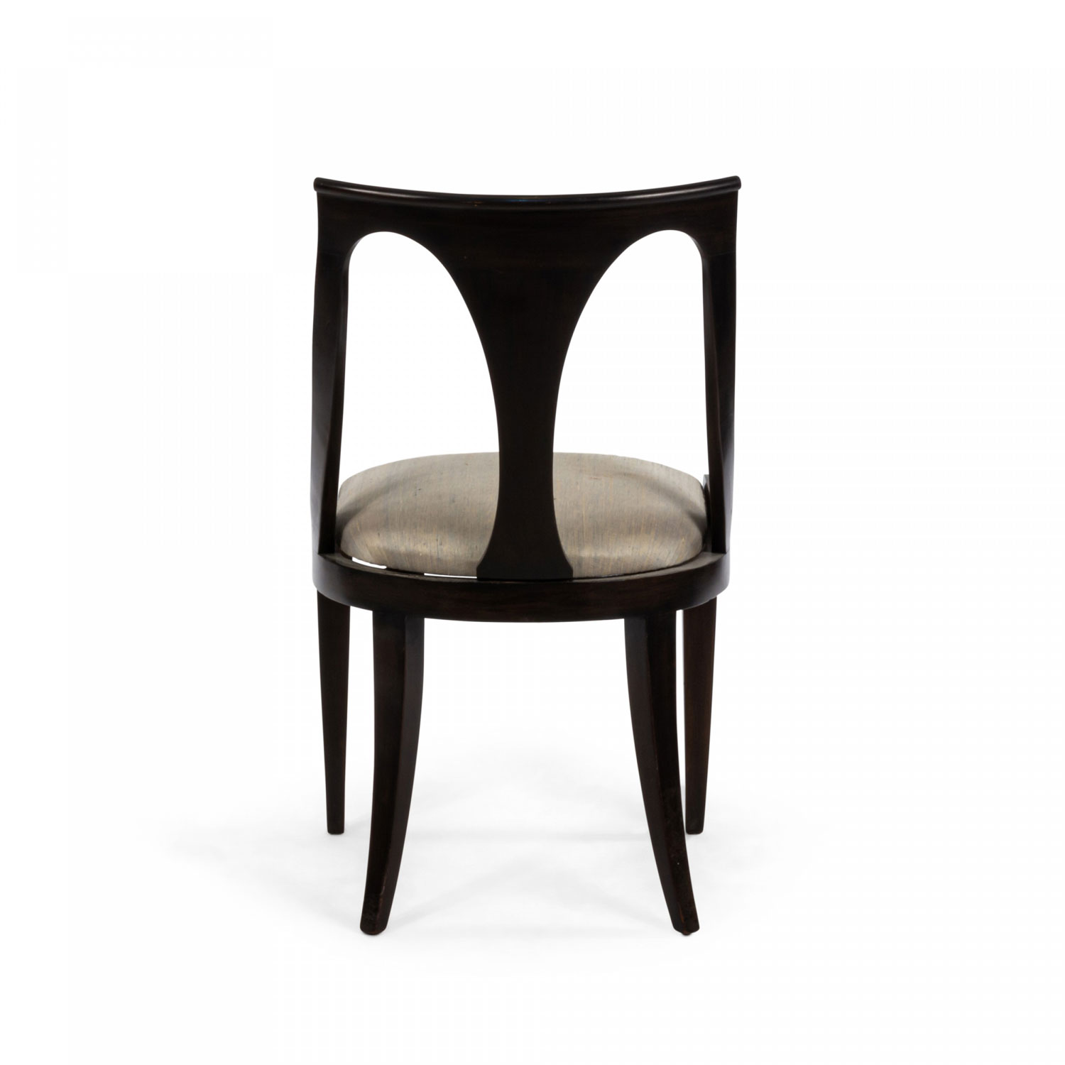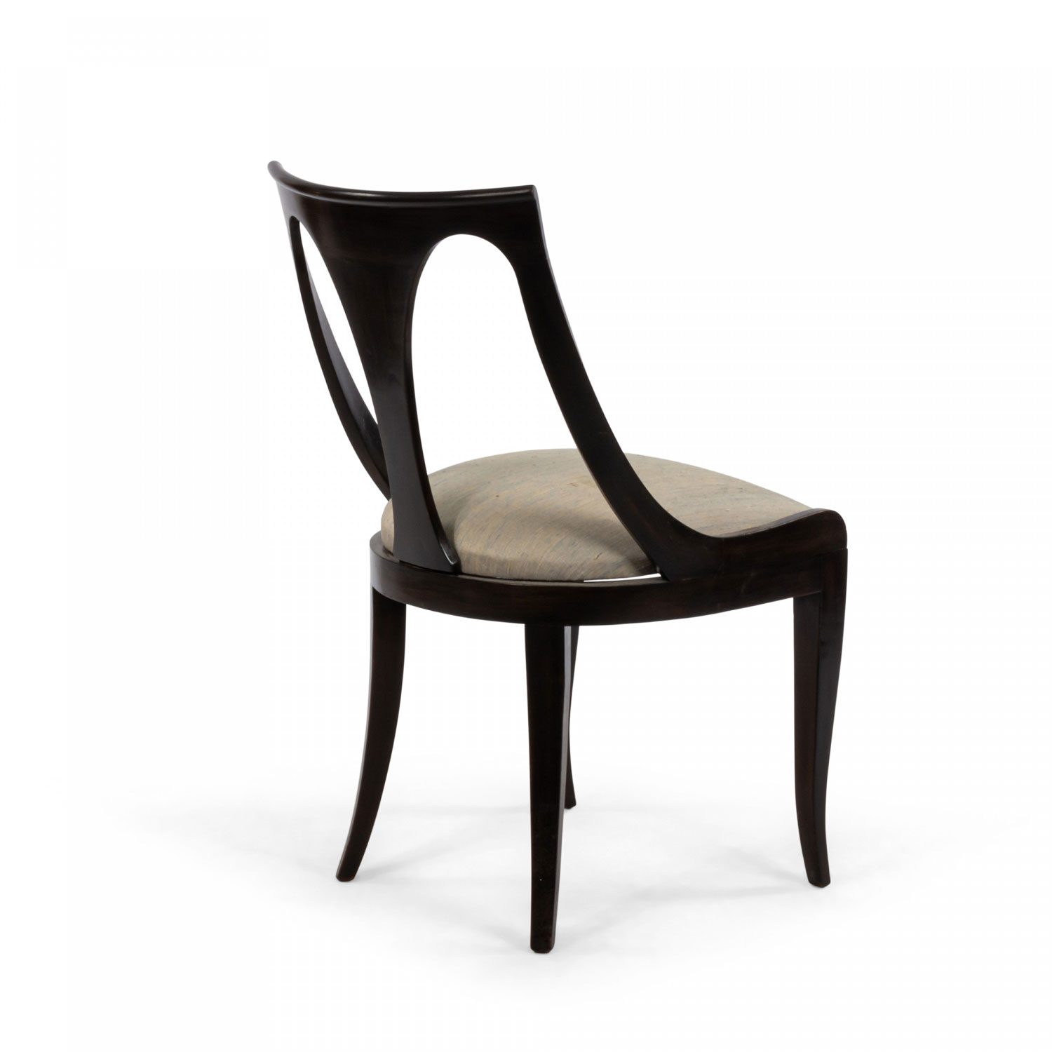 SET of 4 Contemporary Empire-style black lacquer dining chairs with a sleigh design open back with a cream & blue shot raw silk upholstered seats..