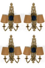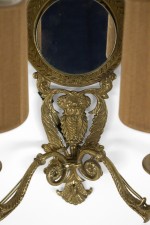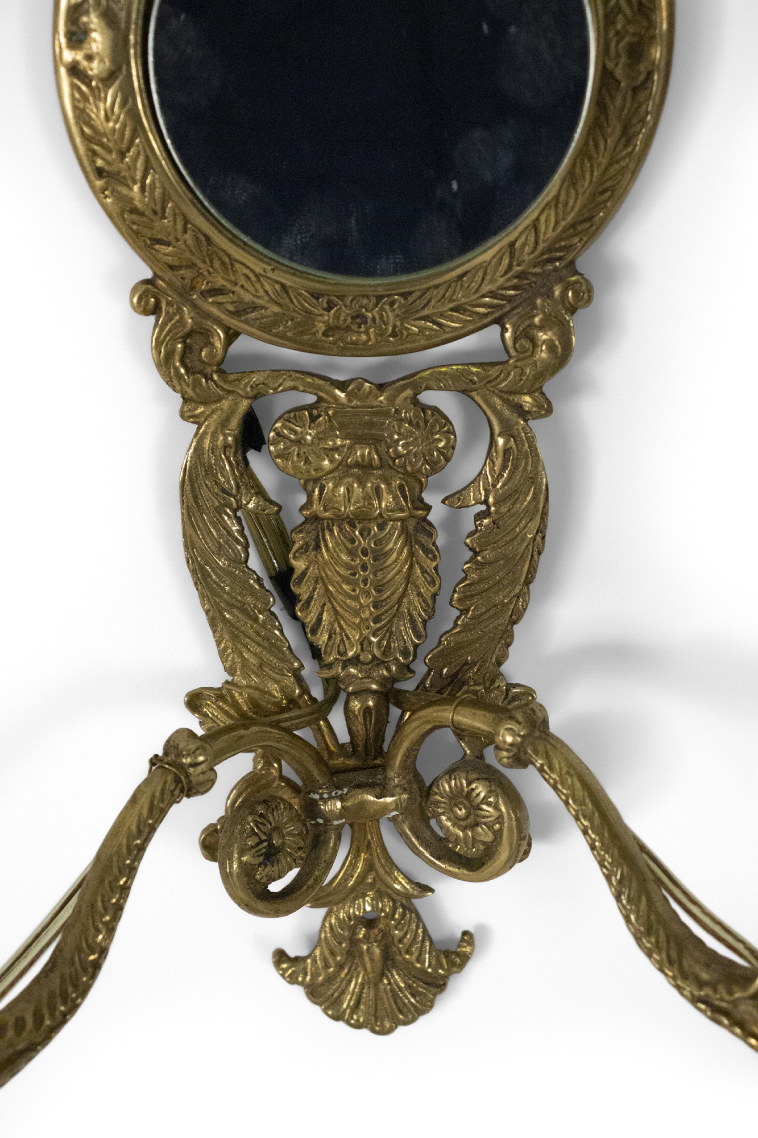 Set of 4 French Directoire style (mid-20th Century) bronze wall sconces with fleur-de-lis motif, central circular mirror, and two electrified lights with bronze colored fabric and thread shades. (PRICED AS SET)