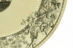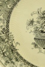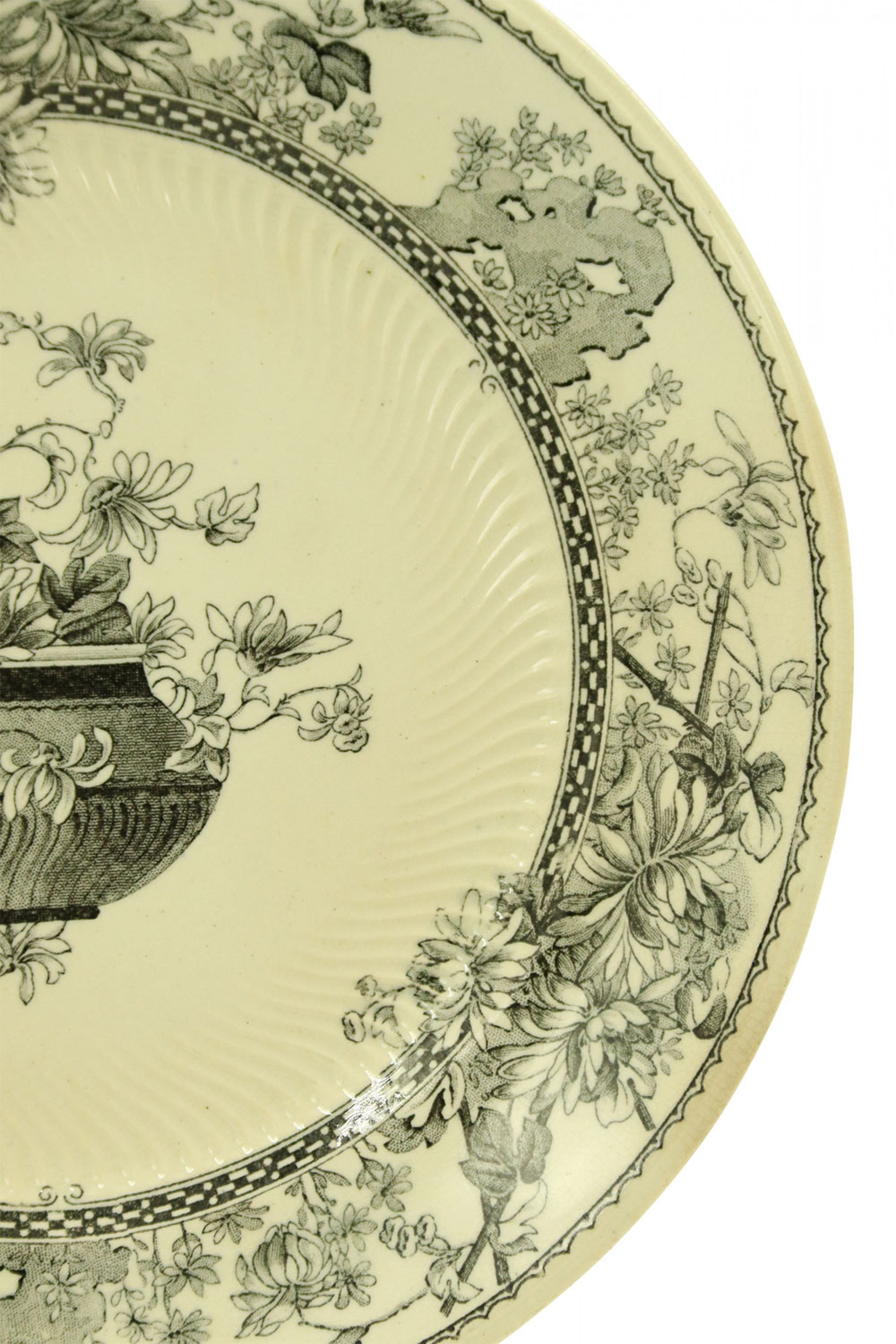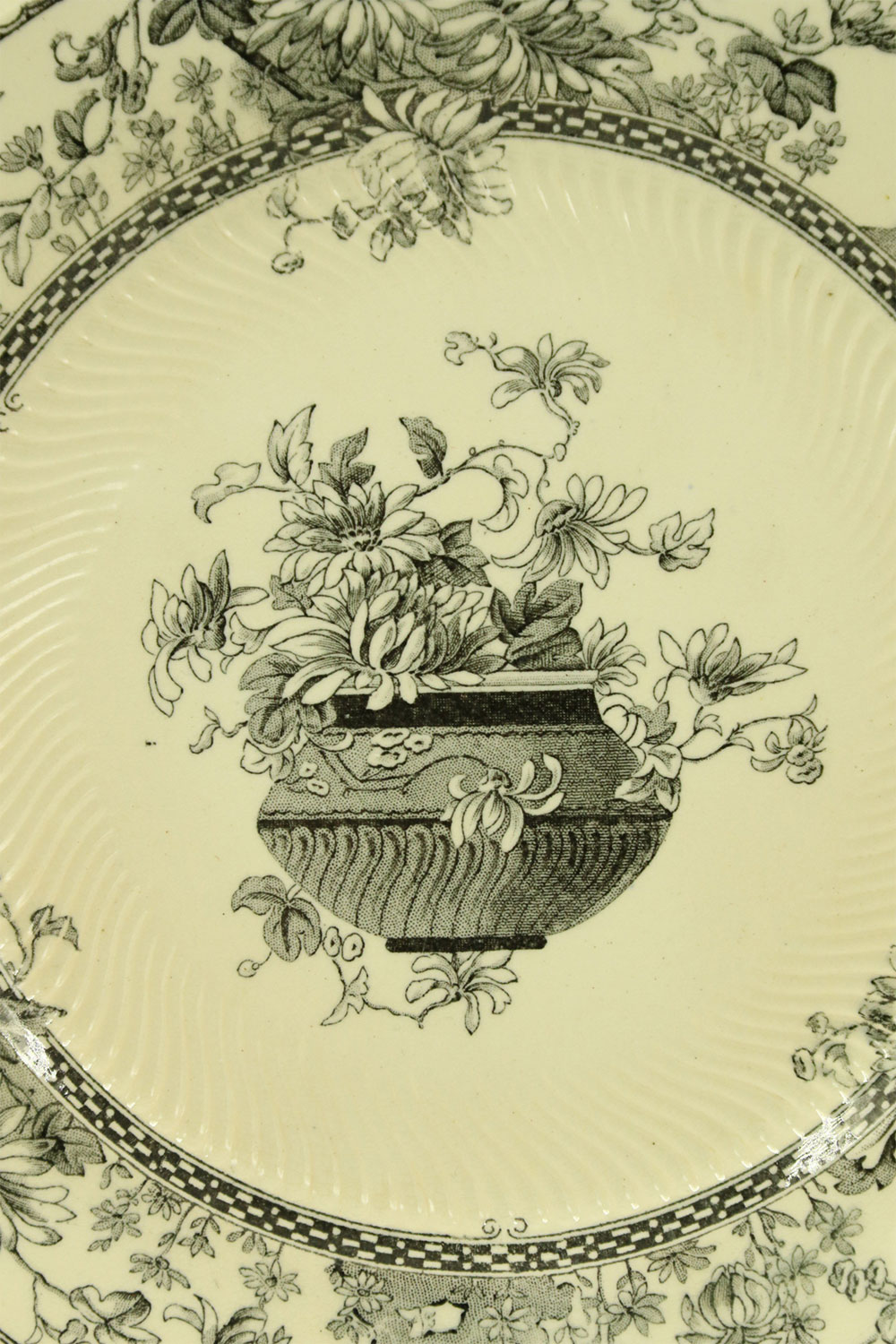 Set of 7 English (19th Century) black and cream floral transferware plates with center depiction of a vase of flowers. (DOUTON'S ELAINE) (PRICED AS SET)