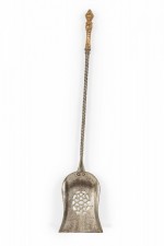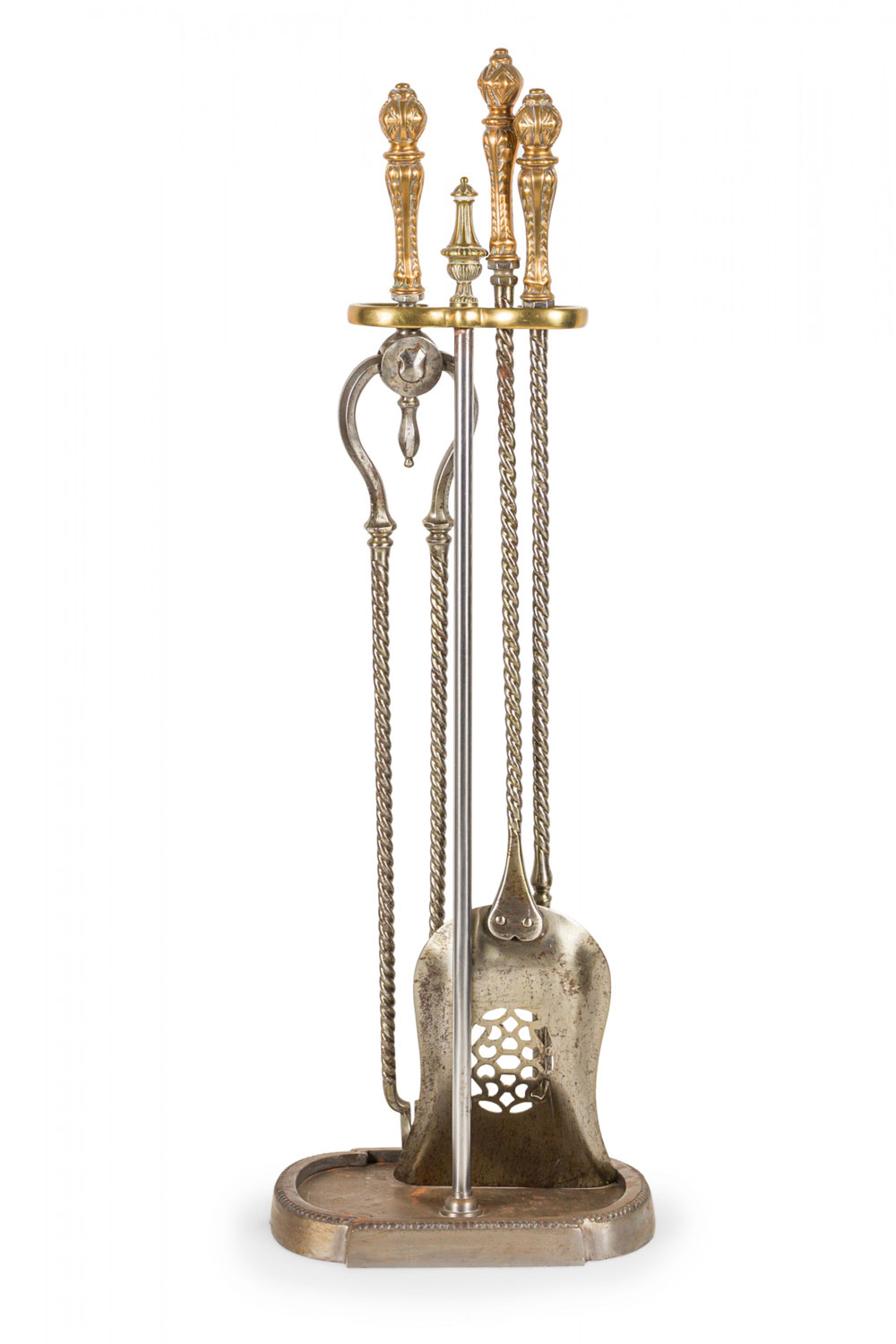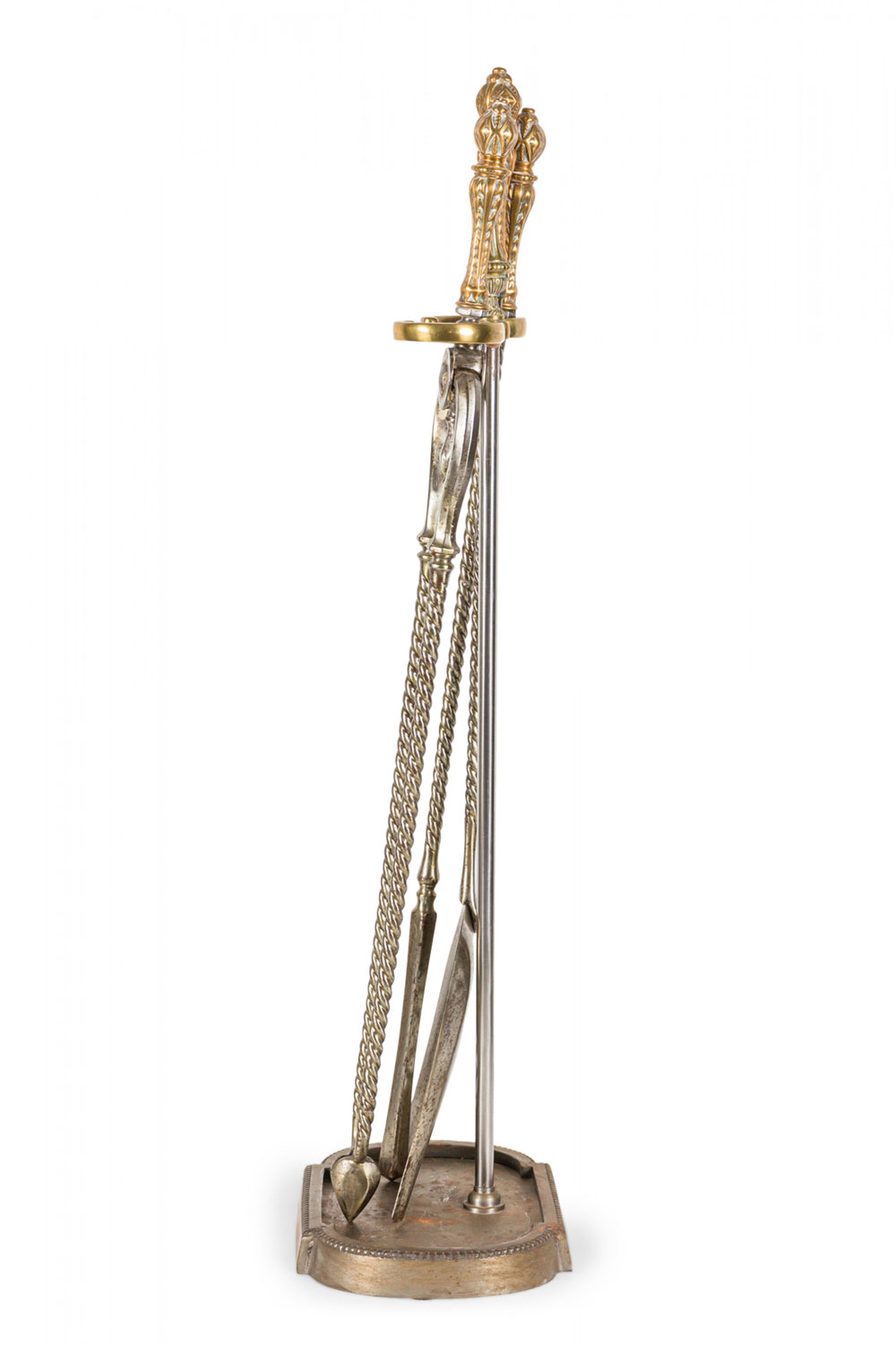 Set of French Victorian-style (1st quarter 20th Century) fire tools with rods in a twisted steel rope design topped with bronze finials. Set includes: shovel with reticulated central design, tongs, and poker..