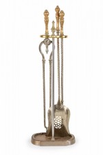 Set of French Victorian-style (1st quarter 20th Century) fire tools with rods in a twisted steel rope design topped with bronze finials. Set includes: shovel with reticulated central design, tongs, and poker.
