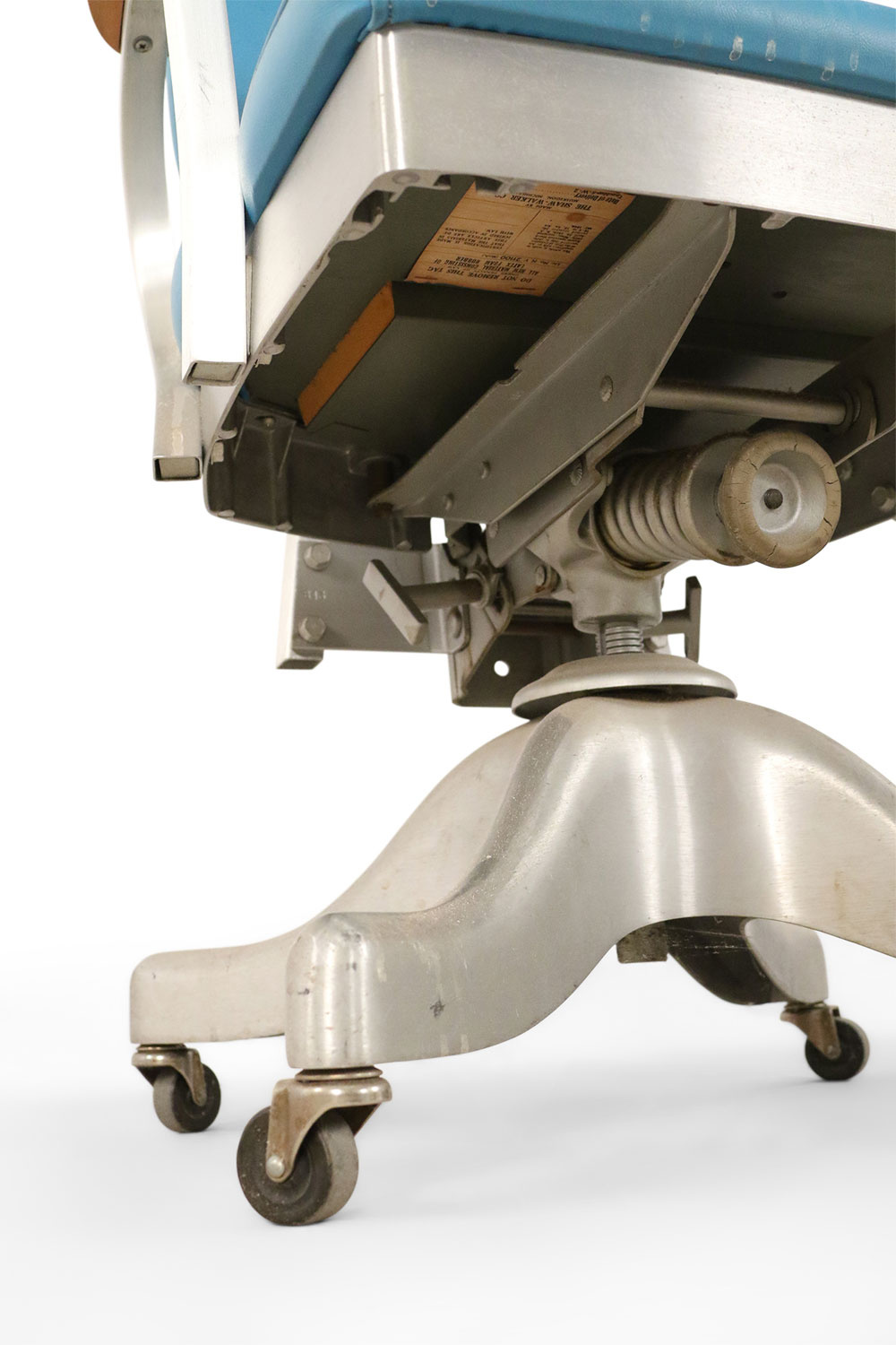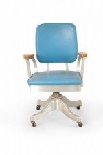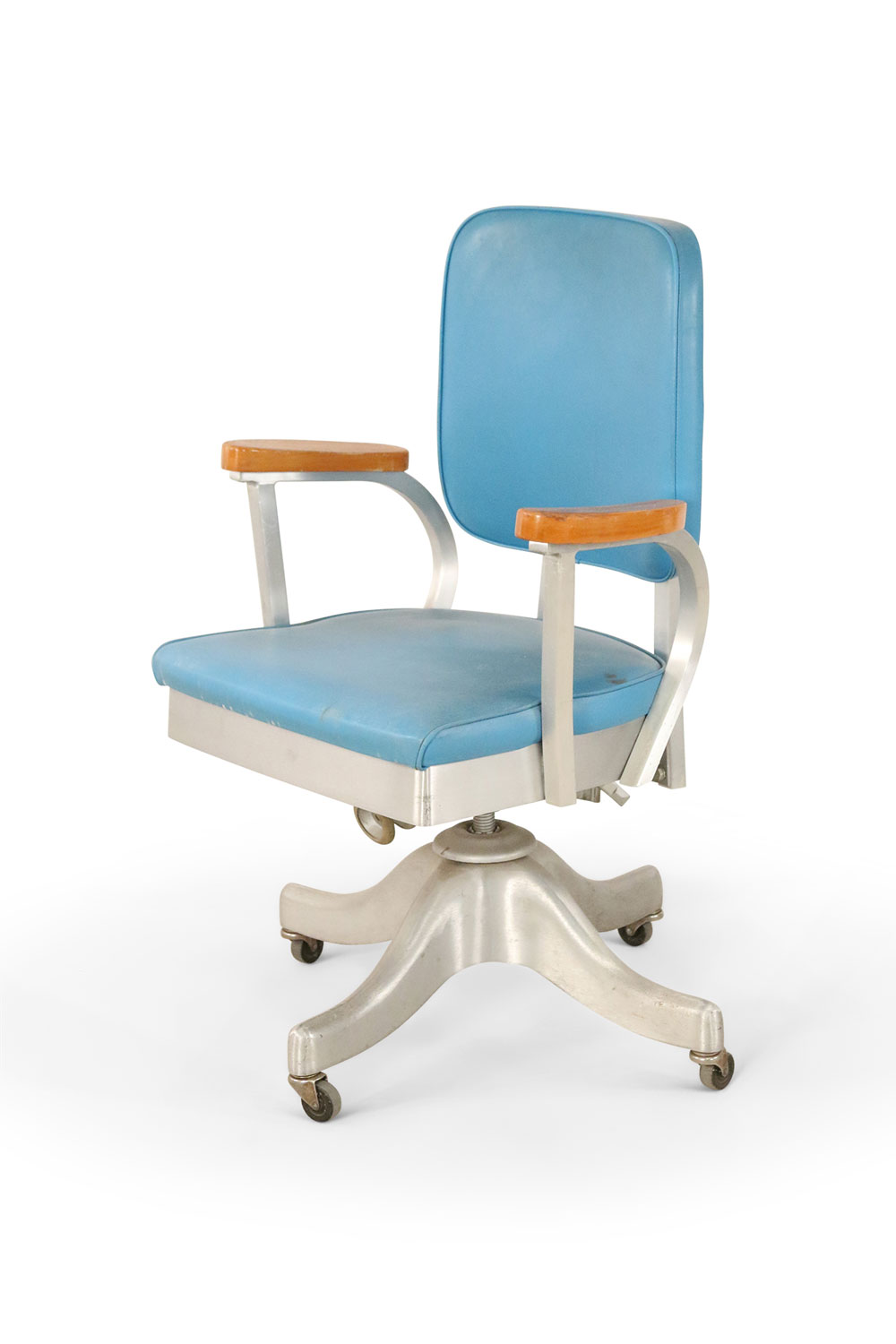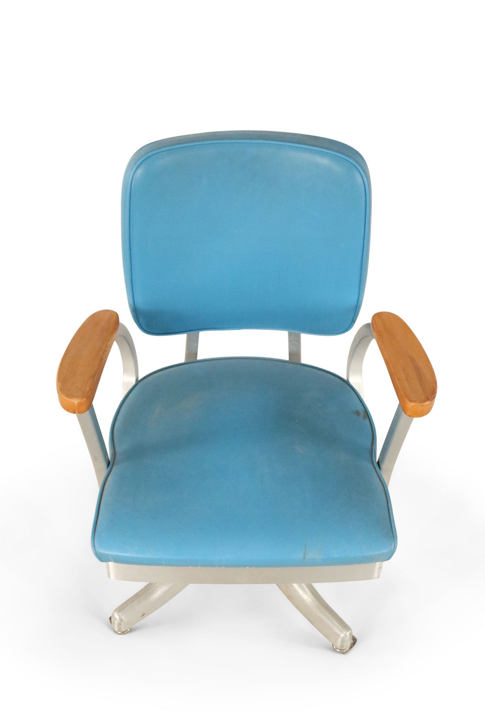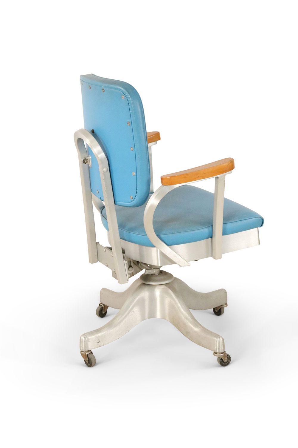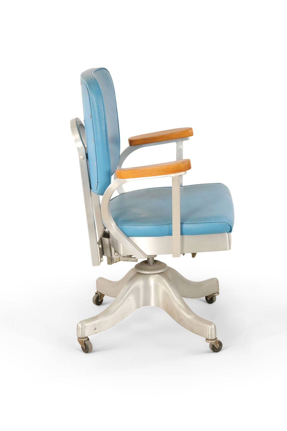 American Mid-Century rolling adjustable office chair with blue vinyl upholstery, silver metal frame with four wheels, and wooden armrests. (SHAW WALKER CO.)