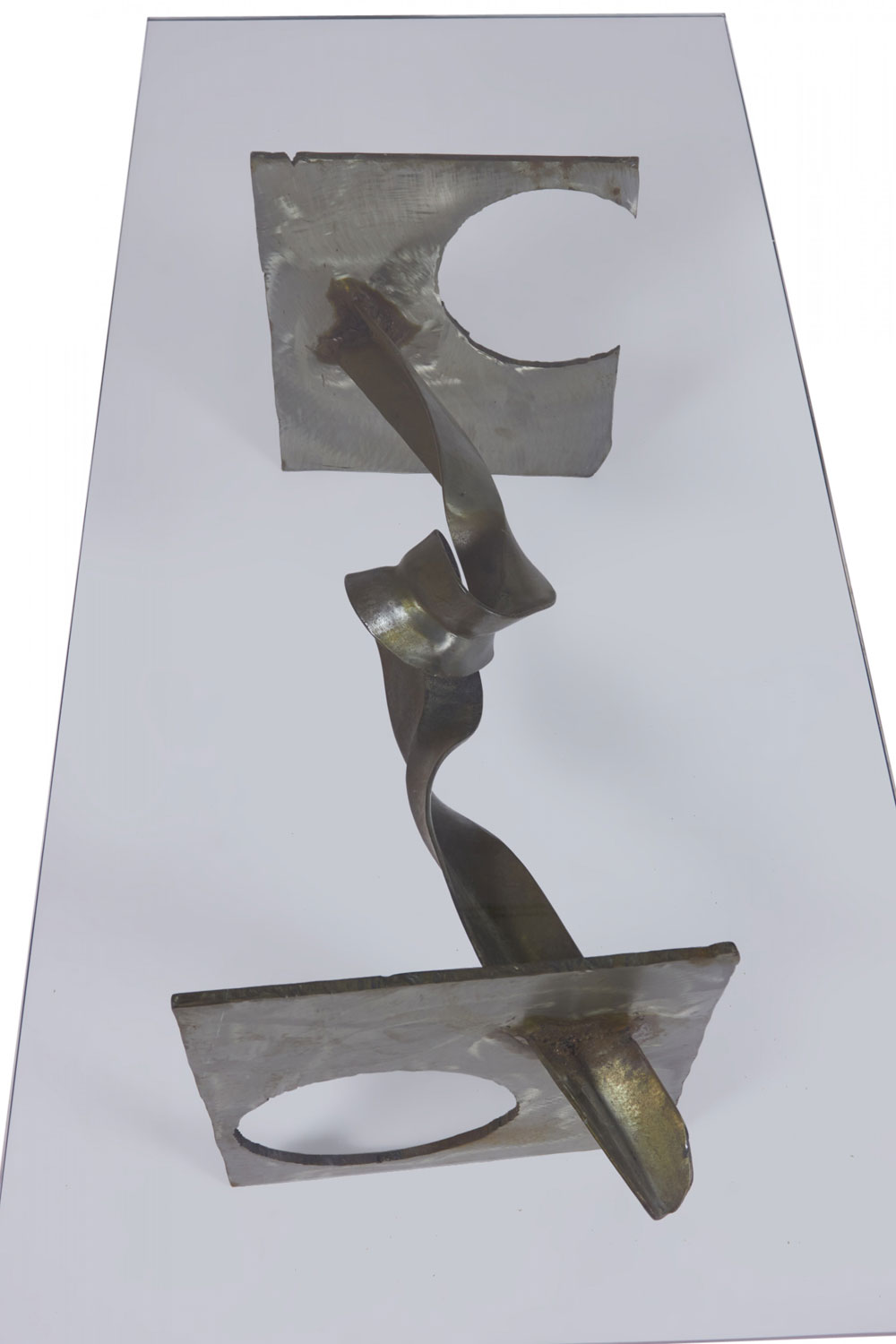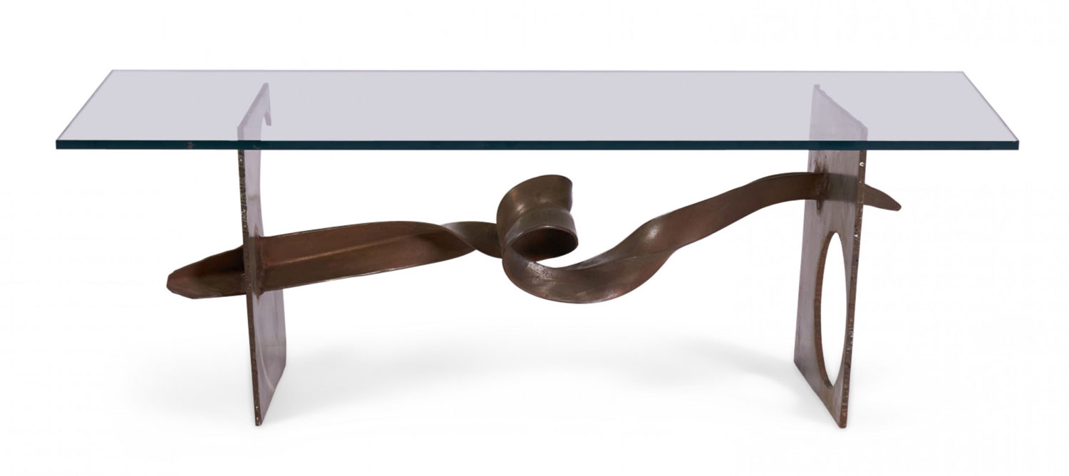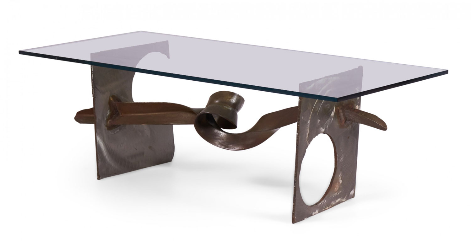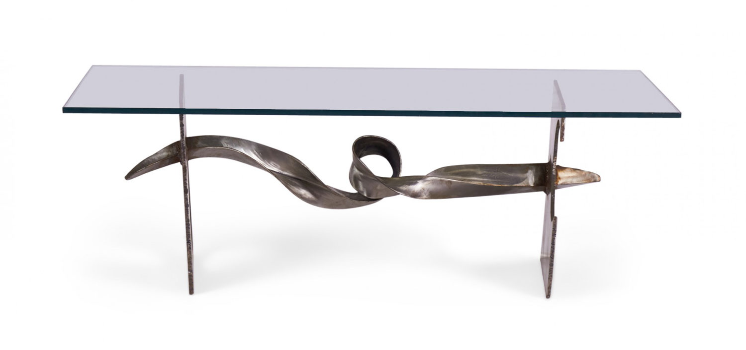 American Mid-Century Brutalist (1974) 'Tortured' ribbon steel coffee table with a rectangular clear glass table top. (signed, SILAS SEANDEL, '74).