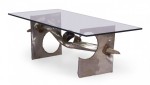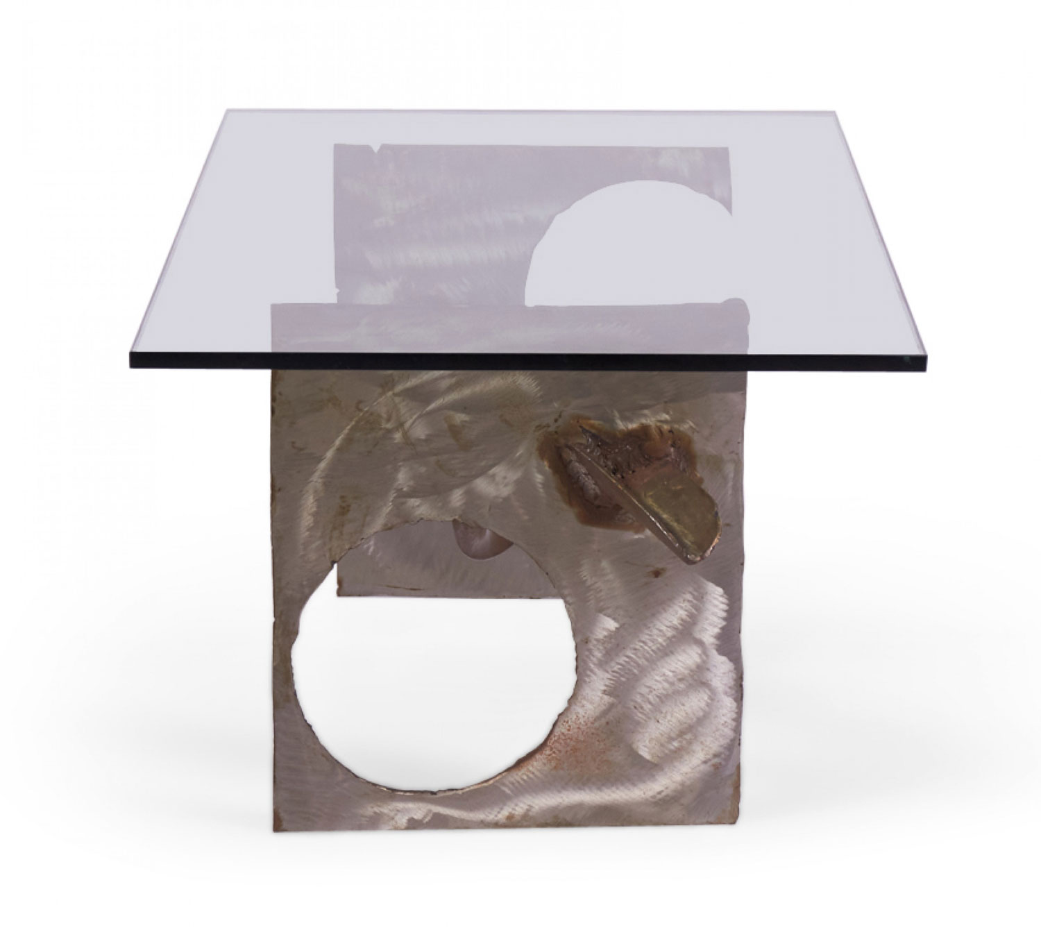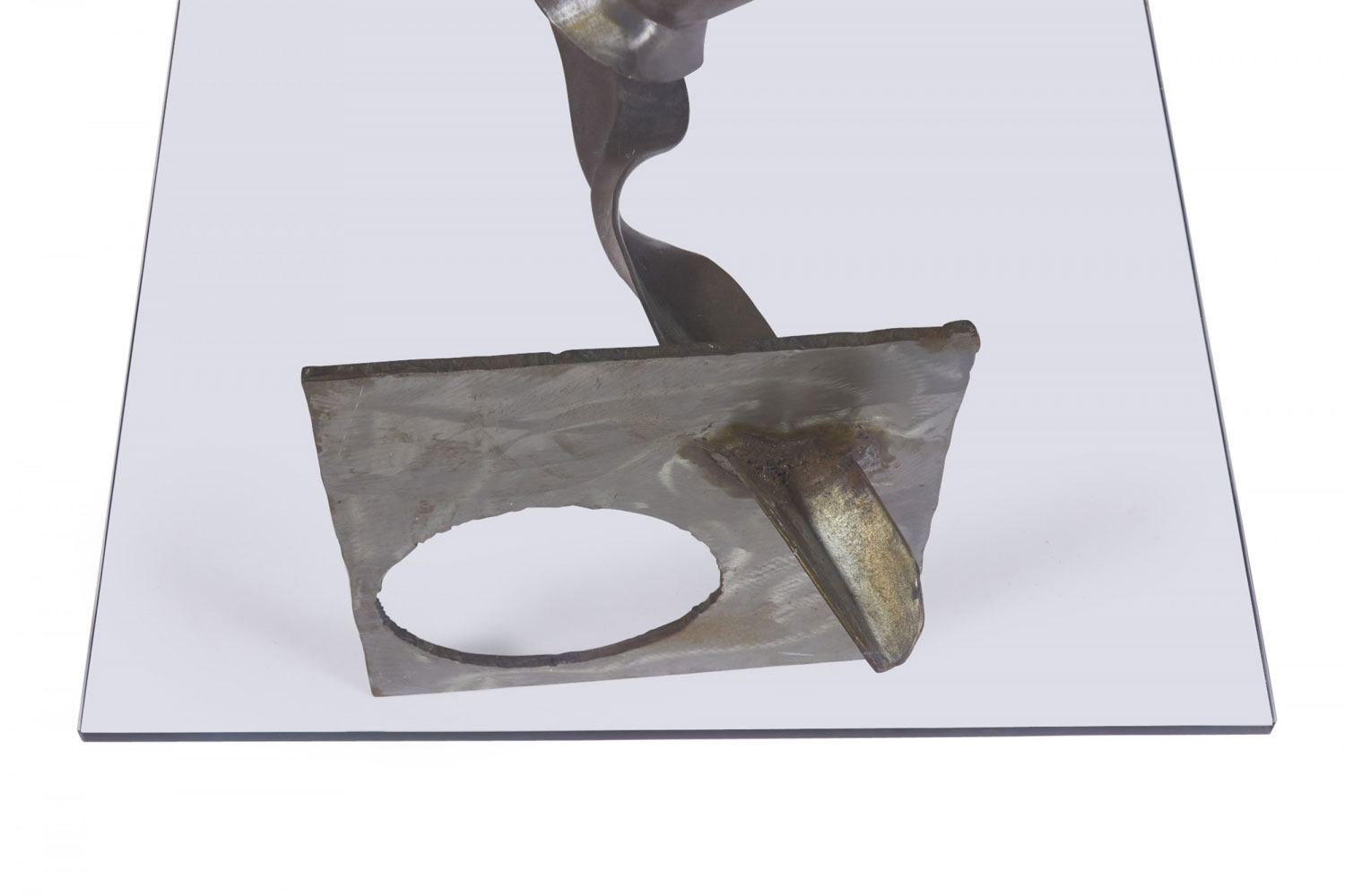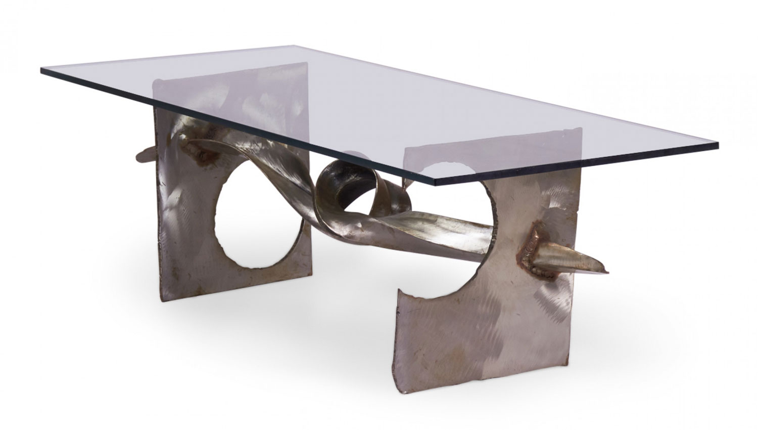 American Mid-Century Brutalist (1974) 'Tortured' ribbon steel coffee table with a rectangular clear glass table top. (signed, SILAS SEANDEL, '74).