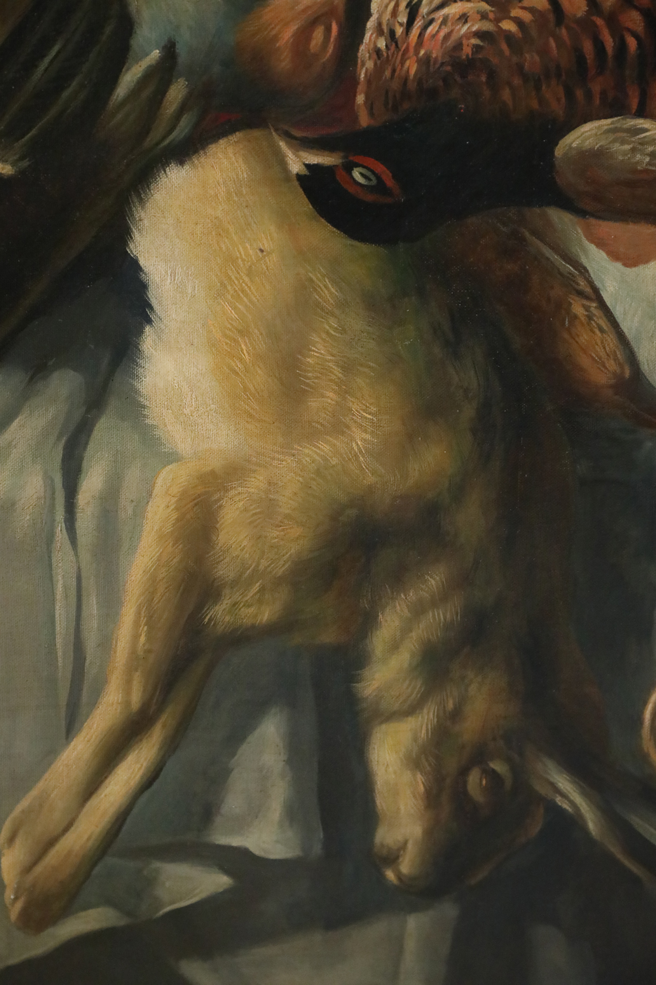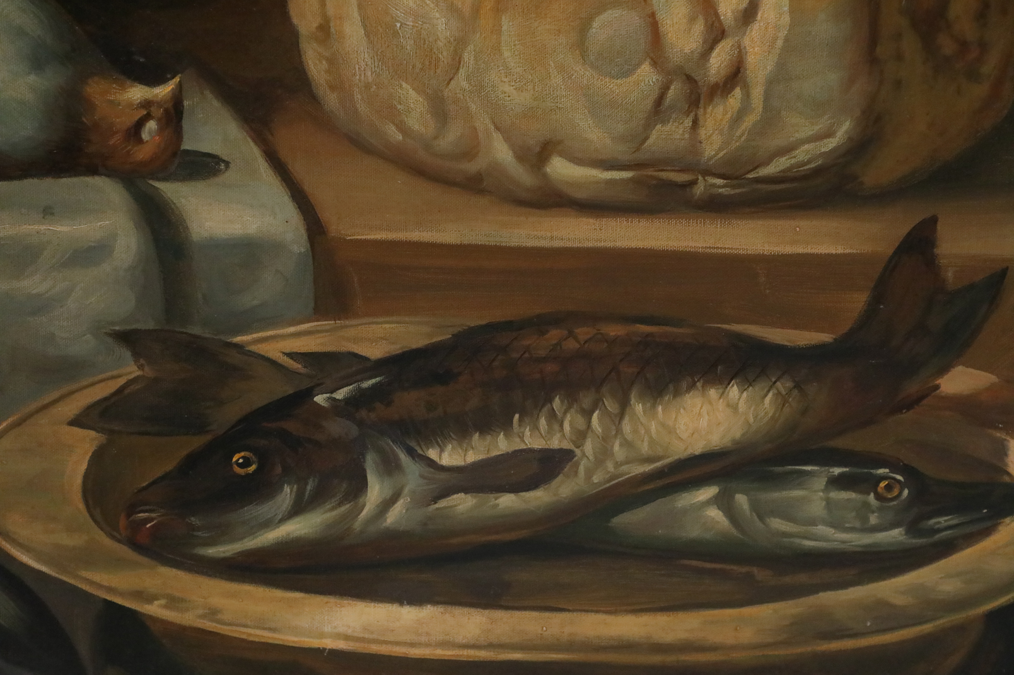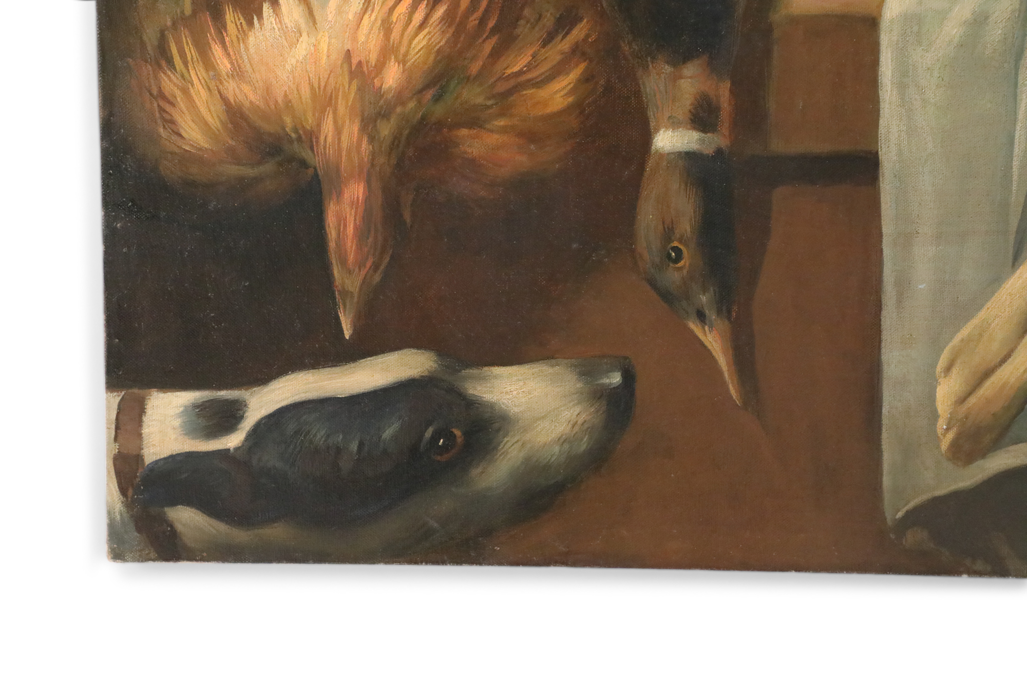 Italian Neo-classic style (20th Century) richly-captured still life of game birds, rabbit and fowl laid out on a butcher block alongside a rounded loaf of bread, fish in a bowl in the foreground across from a sniffing dog, and fowl in a propped-up basket overlooking the scene. Painted on unframed, rectangular canvas..