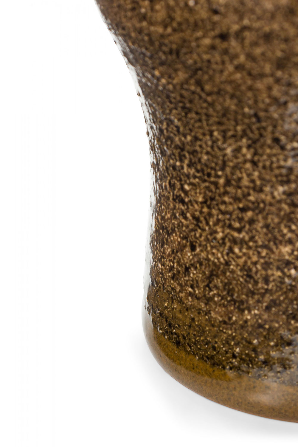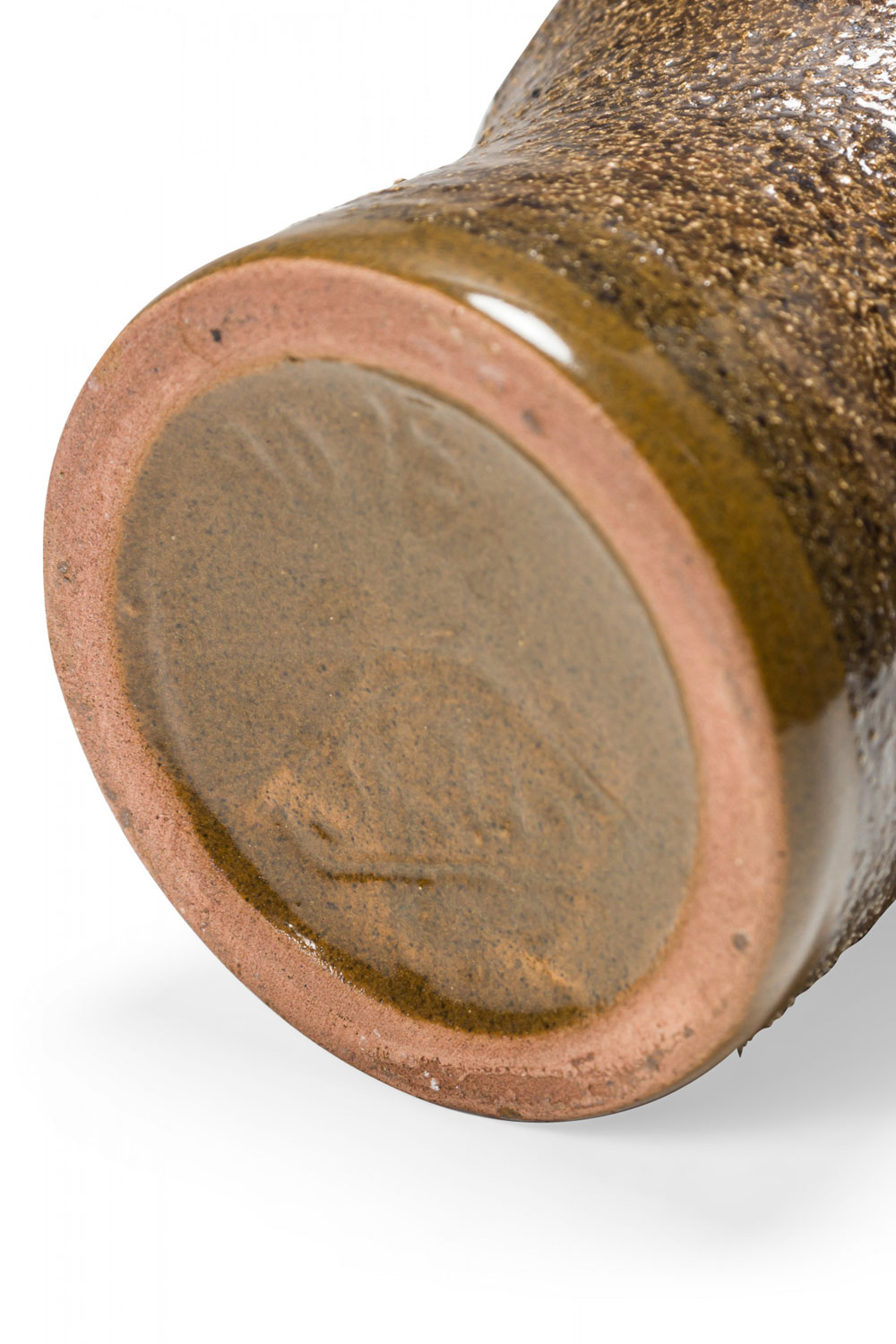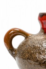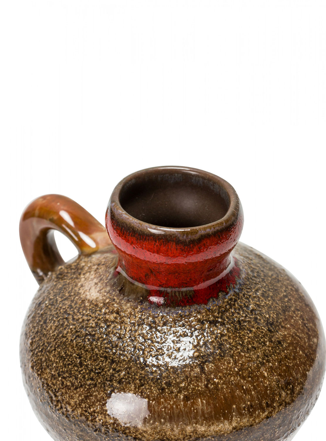 East German Mid-Century ceramic jug with a shaped brown speckled body and handle and a bulbous red glazed neck and opening. (STREHLA KERAMIK mark on bottom, STREHLA GDR 9075)