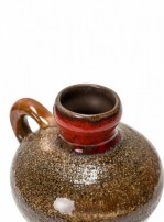 East German Mid-Century ceramic jug with a shaped brown speckled body and handle and a bulbous red glazed neck and opening. (STREHLA KERAMIK mark on bottom, STREHLA GDR 9075).