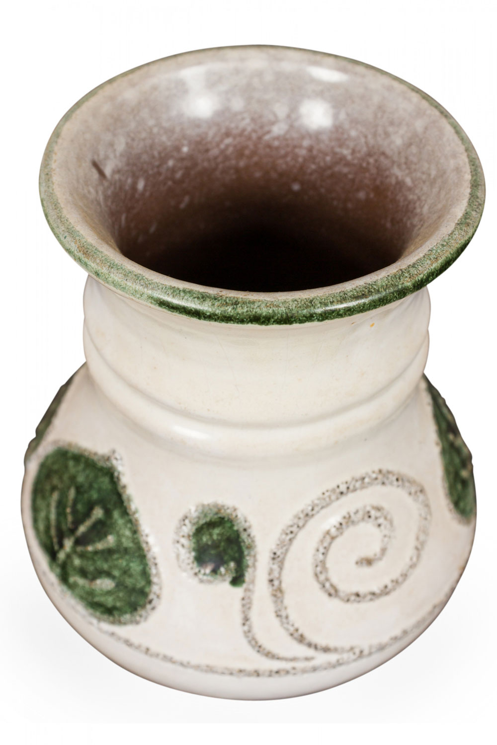 East German Mid-Century ceramic vase with rounded bottom and flared mouth featuring a raised green leaf and vine design against a beige glazed ground. (stamped on bottom, STREHLA GDR, 7467, 53)