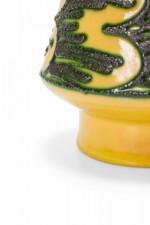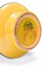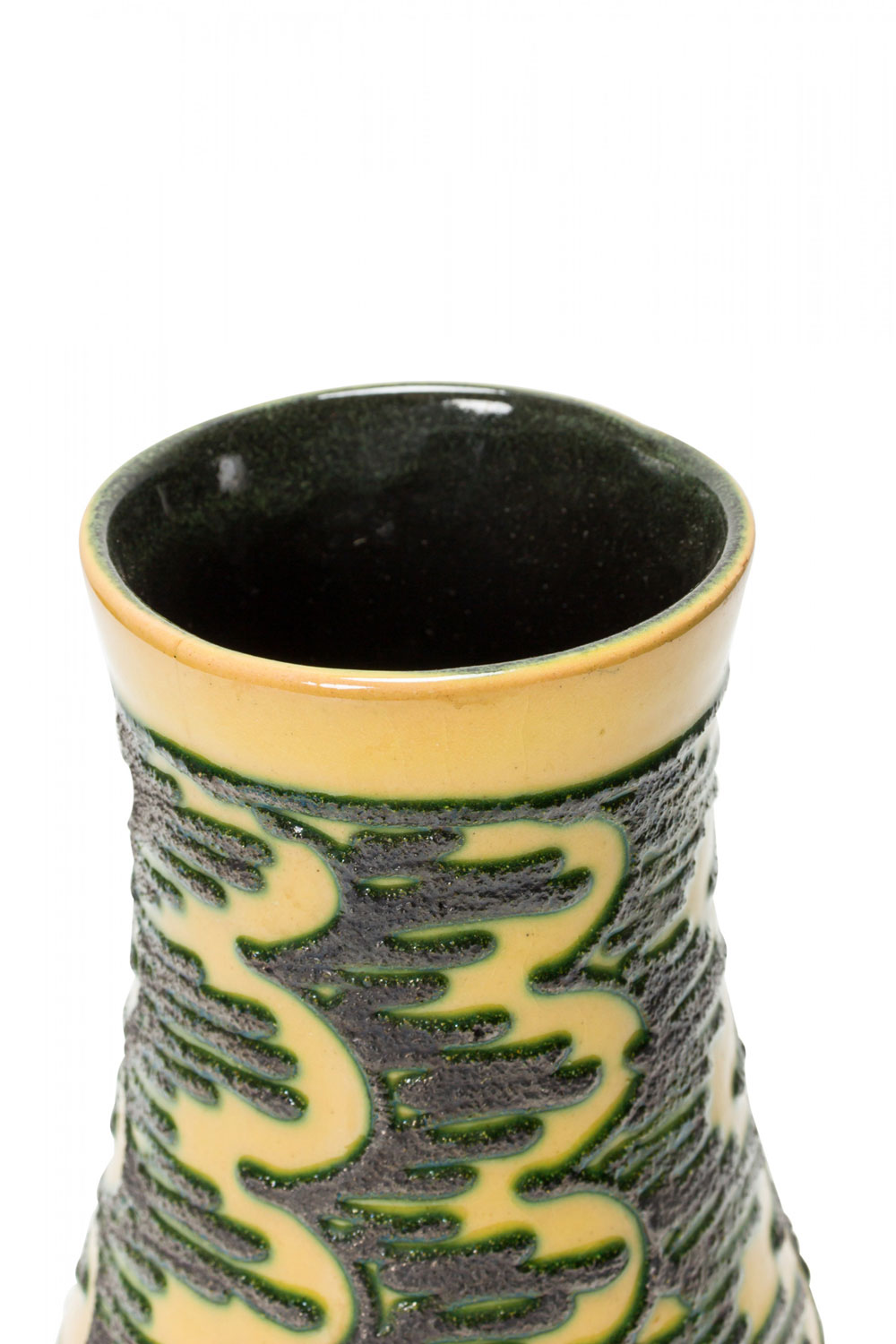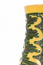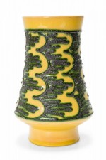 East German Mid-Century cylindrical cermaic vase with a form that tapers inward slightly in the cernter with a raised scallop and line green pattern against a golden yellow glazed ground. (mark on bottom, STREHLA KERAMIK MADE IN GDR).