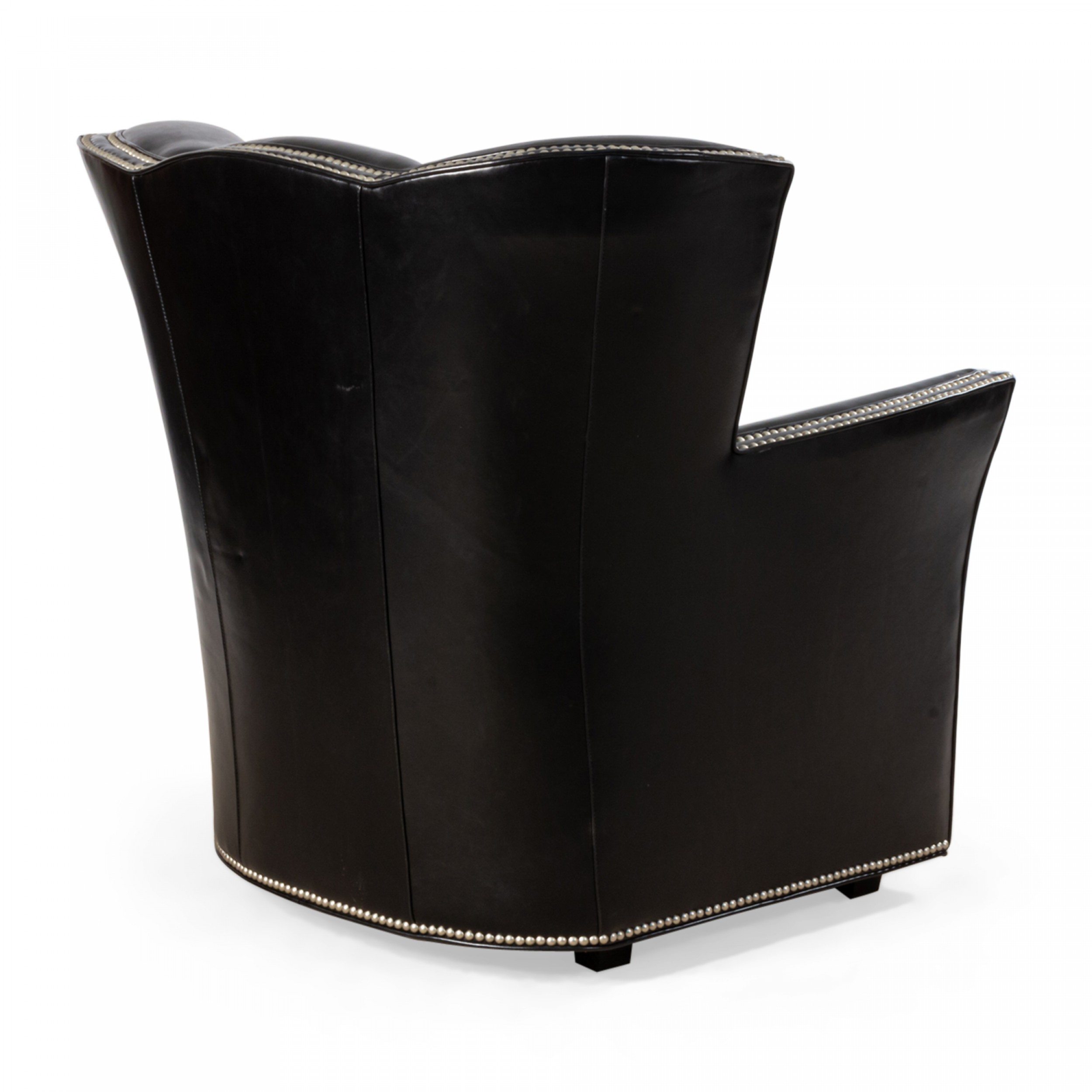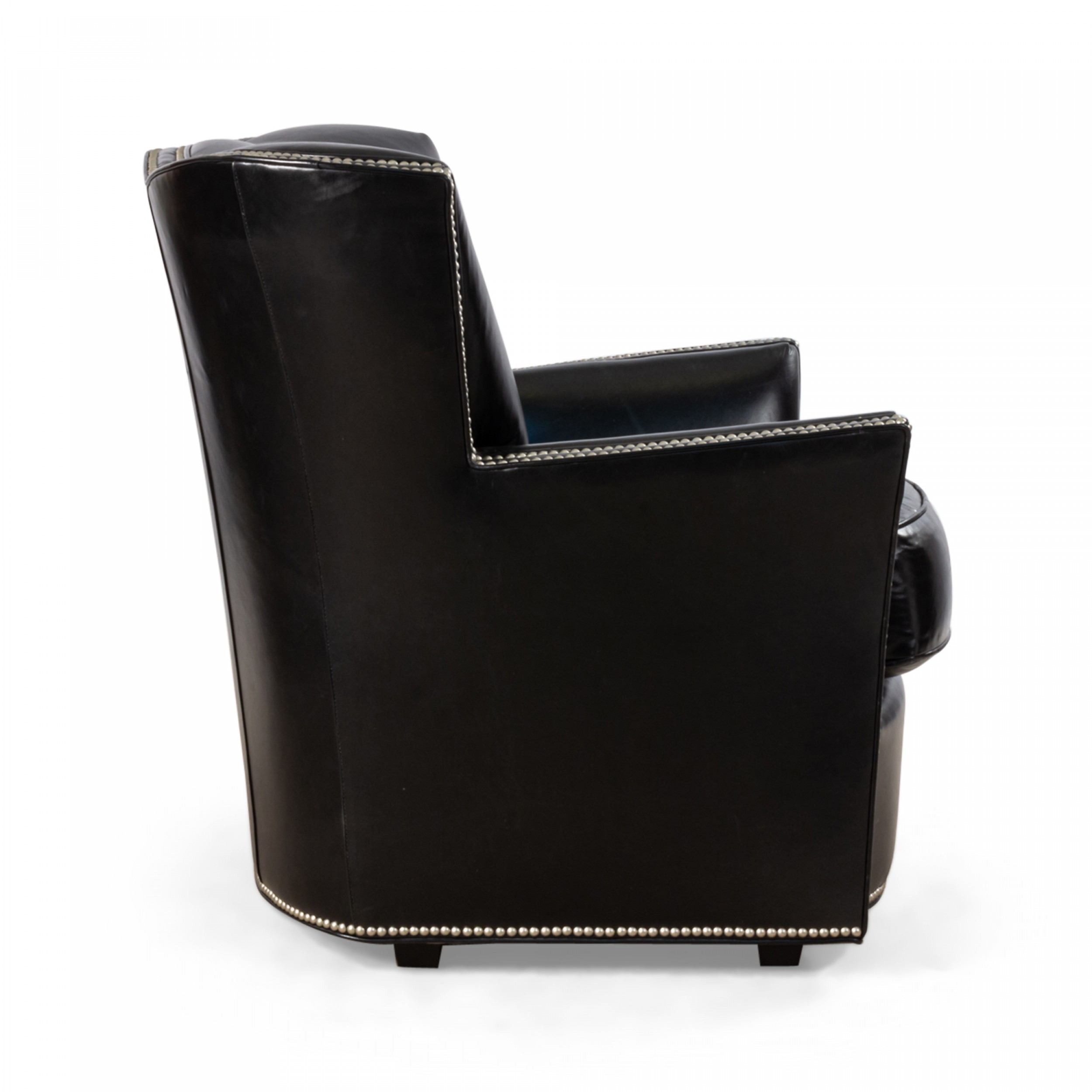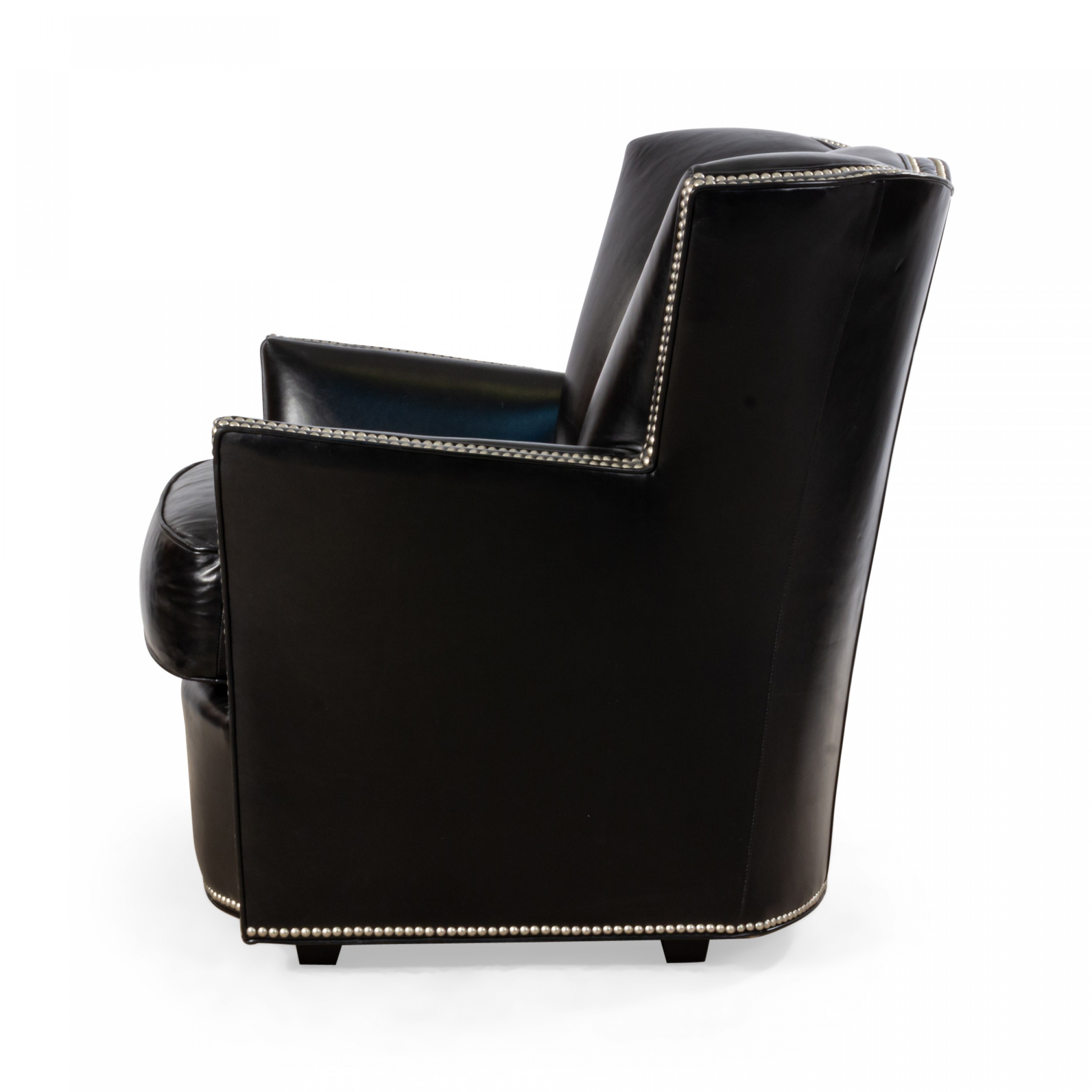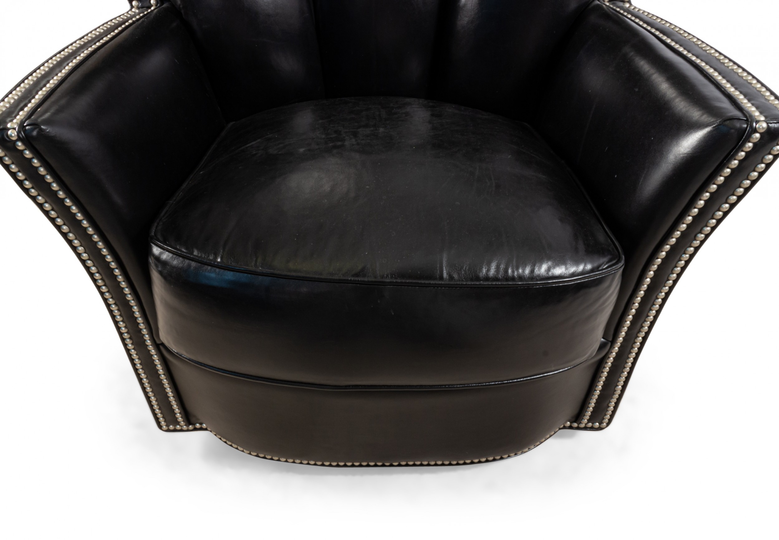 PAIR of Contemporary black leather club chairs with thick seat cushions, tufted backs and studded detail along frame and armrests (SWAIM).