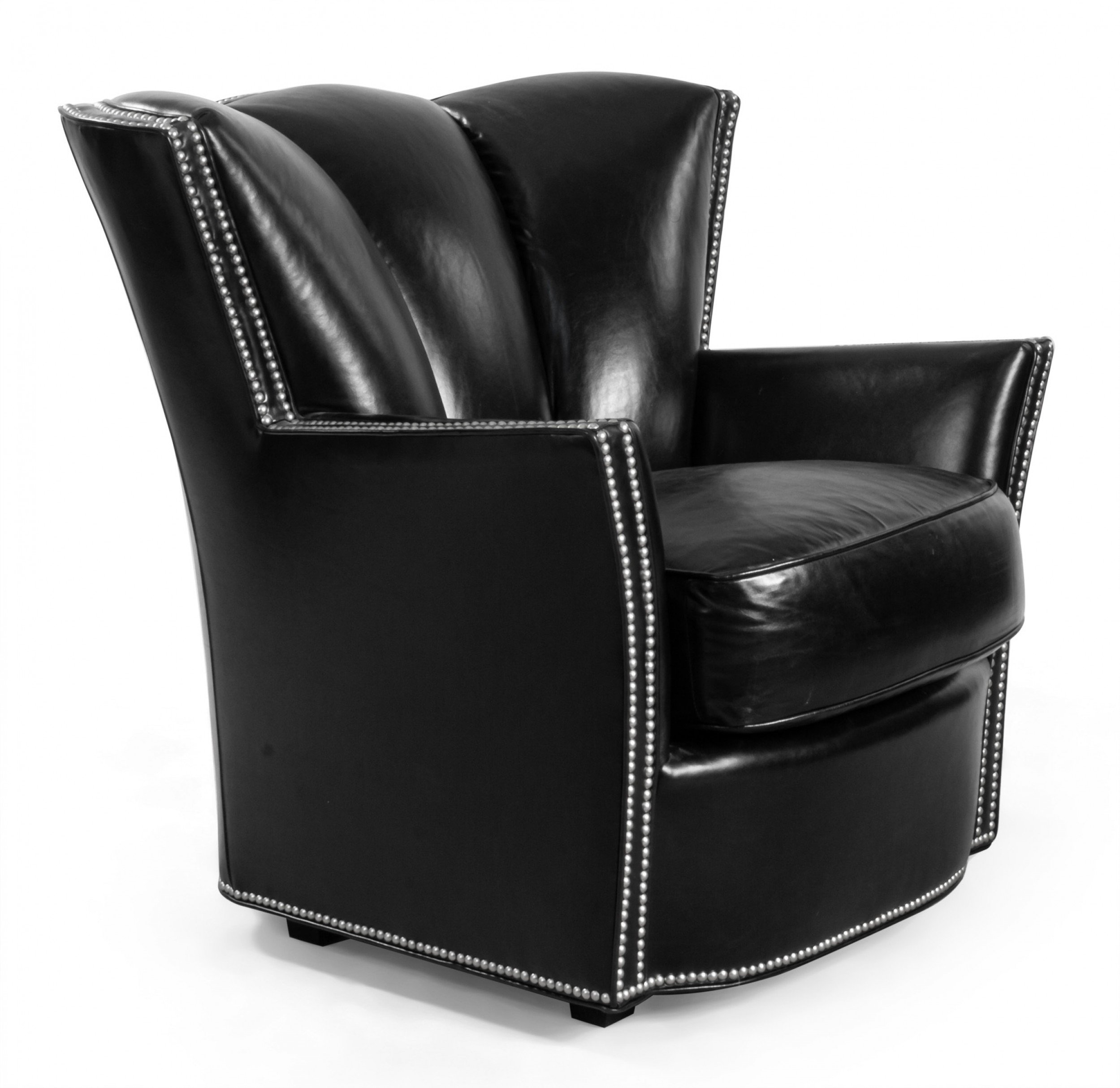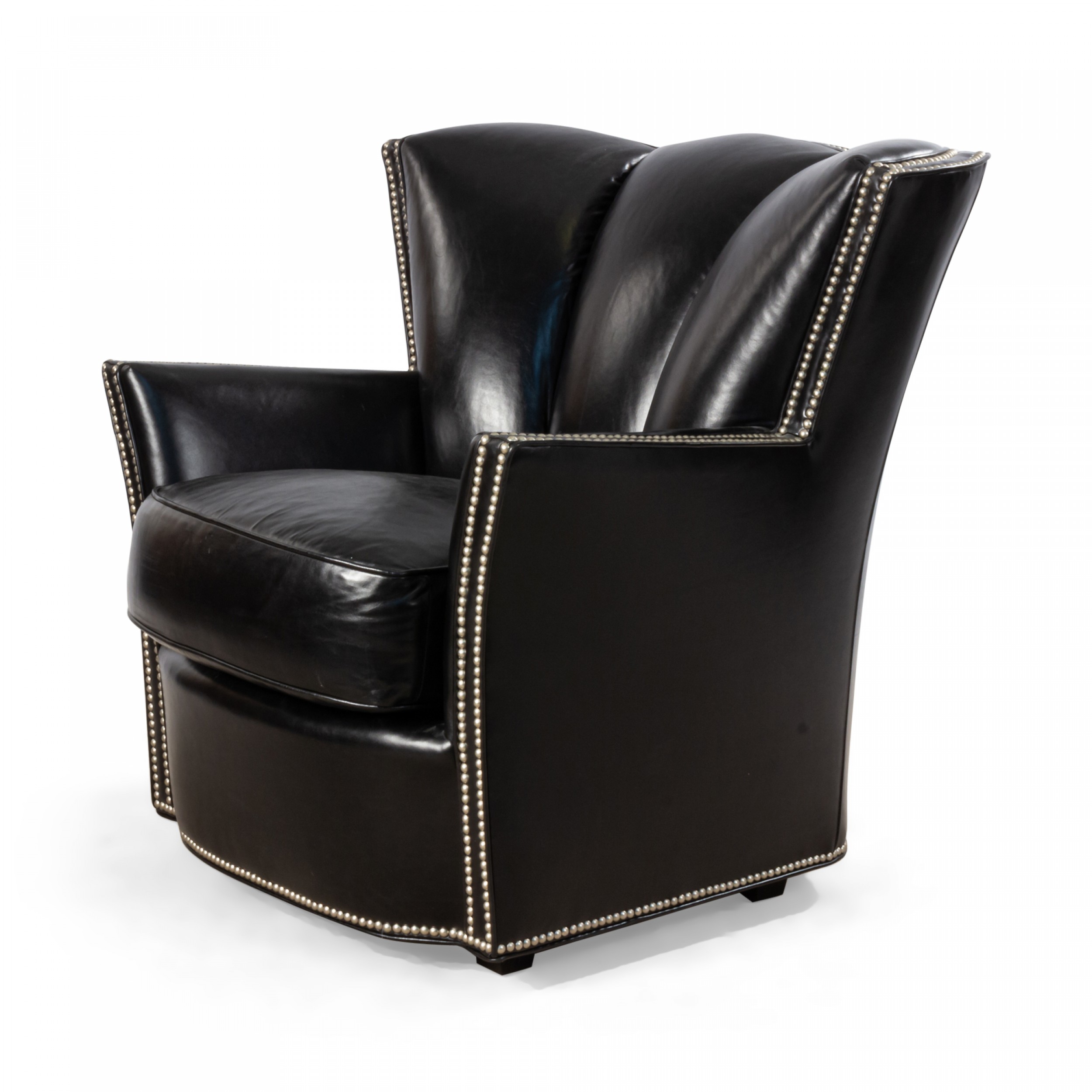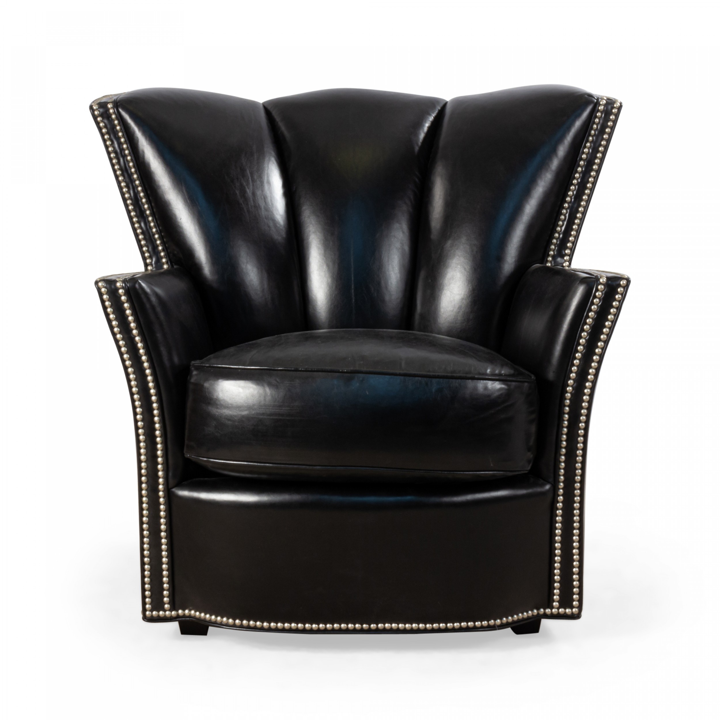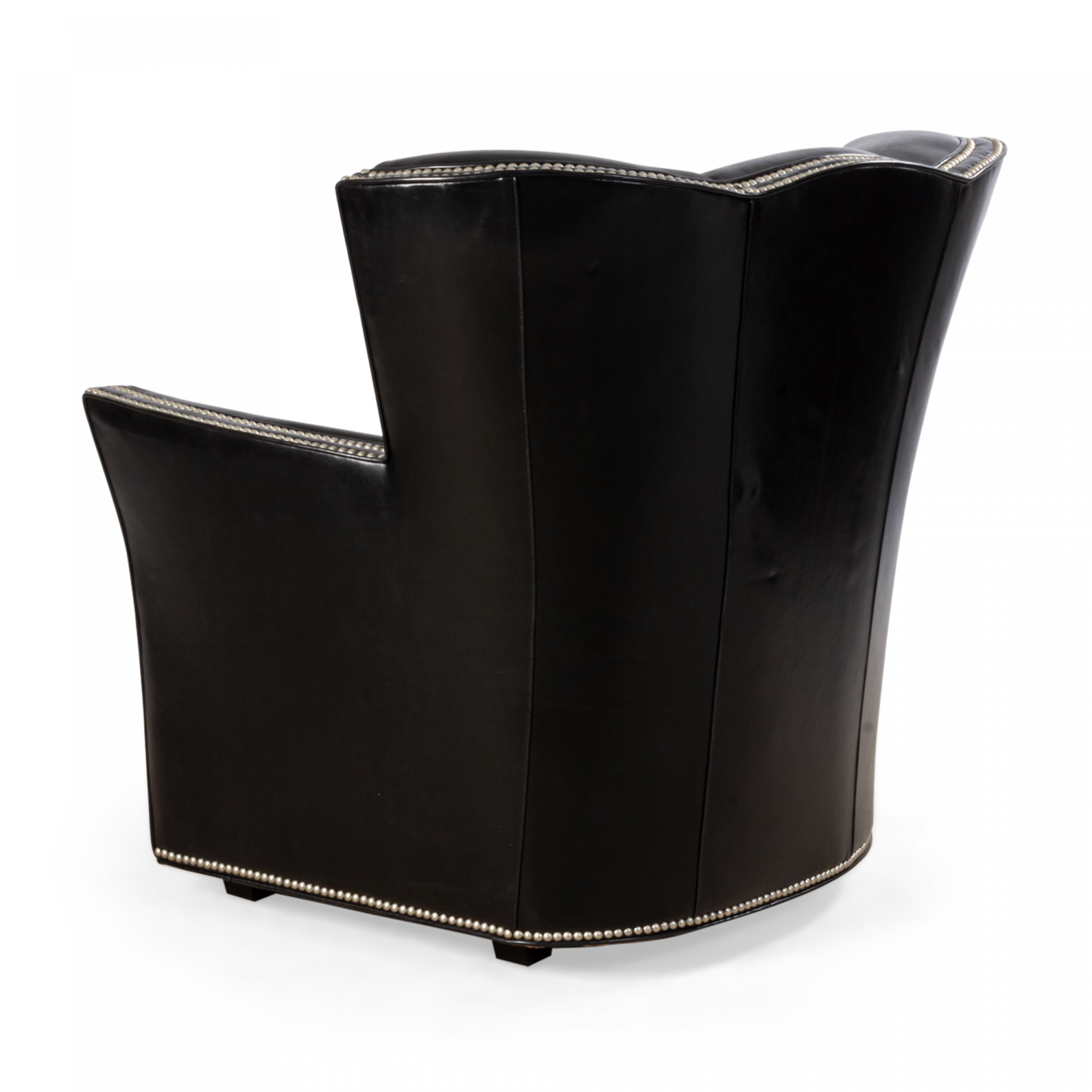 PAIR of Contemporary black leather club chairs with thick seat cushions, tufted backs and studded detail along frame and armrests (SWAIM).