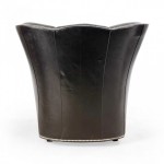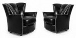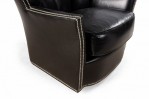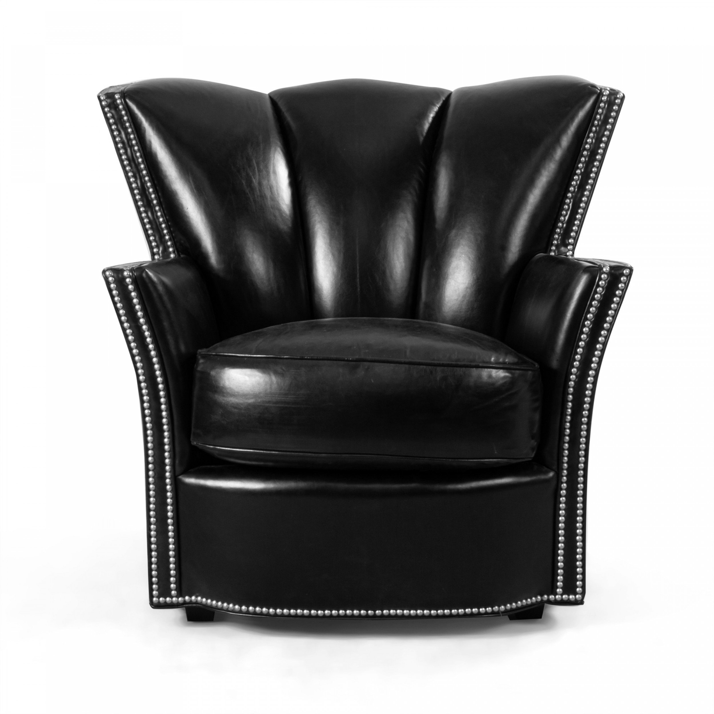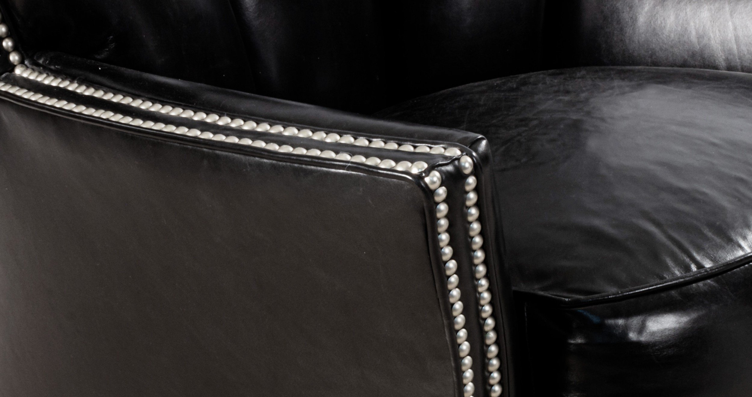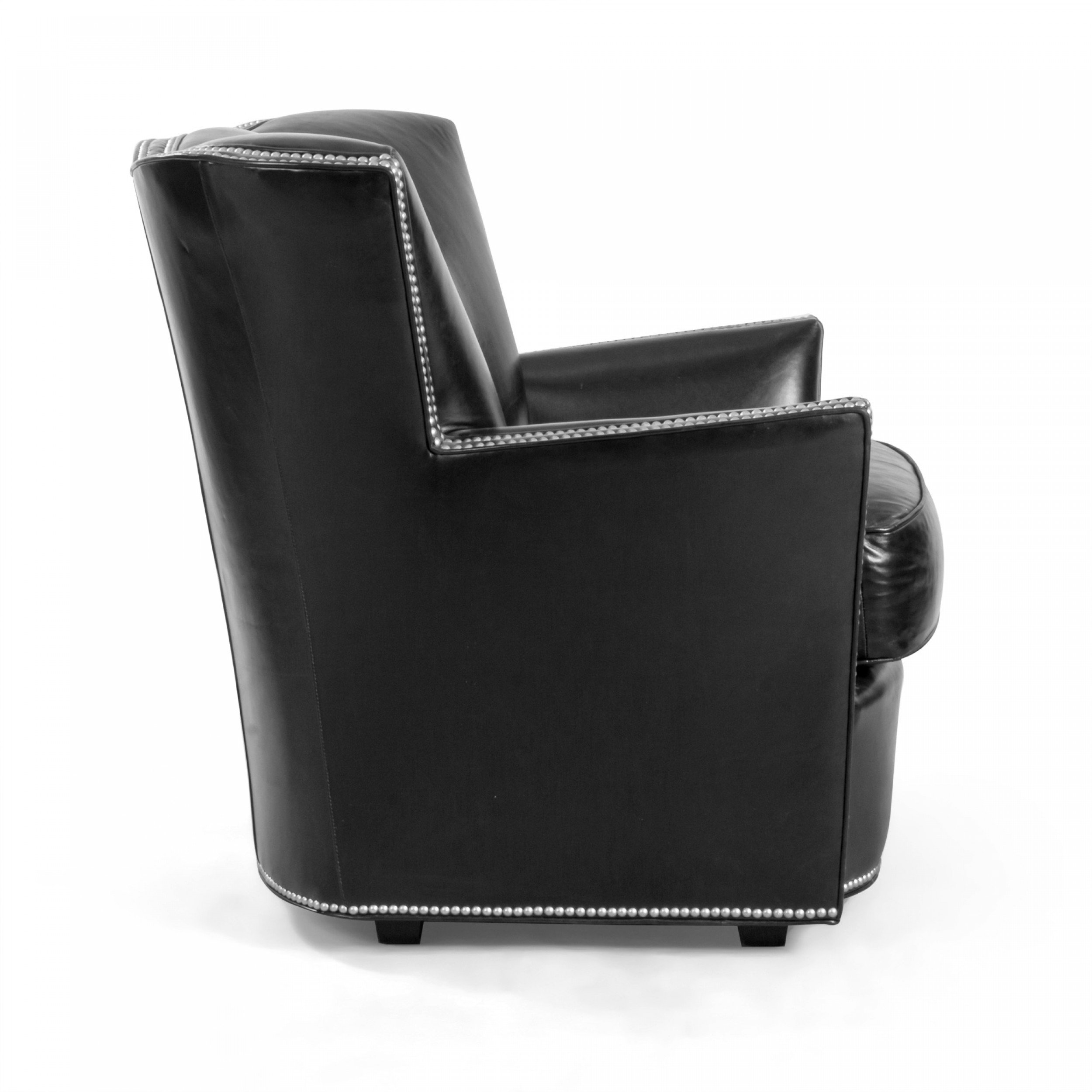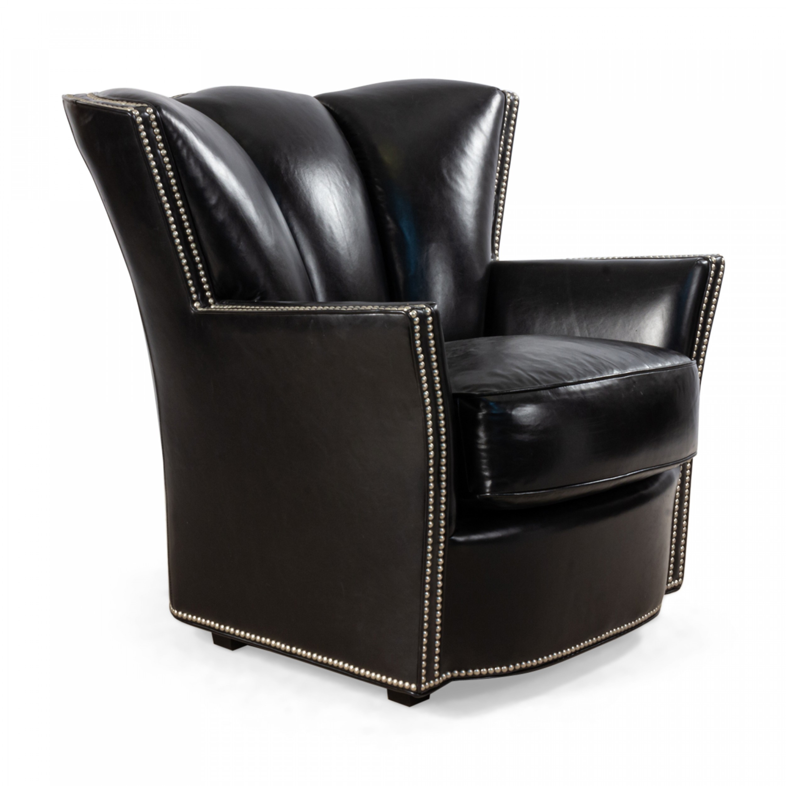 PAIR of Contemporary black leather club chairs with thick seat cushions, tufted backs and studded detail along frame and armrests (SWAIM).