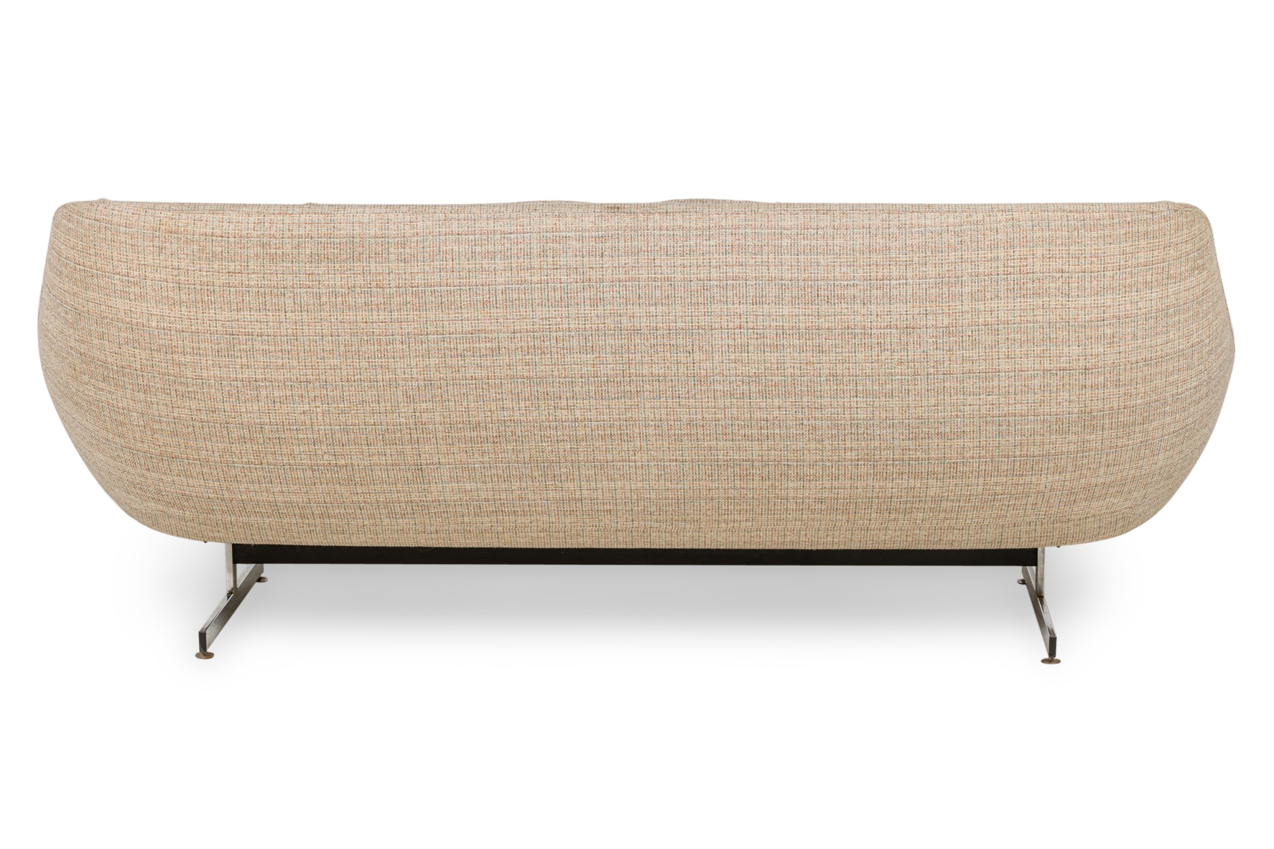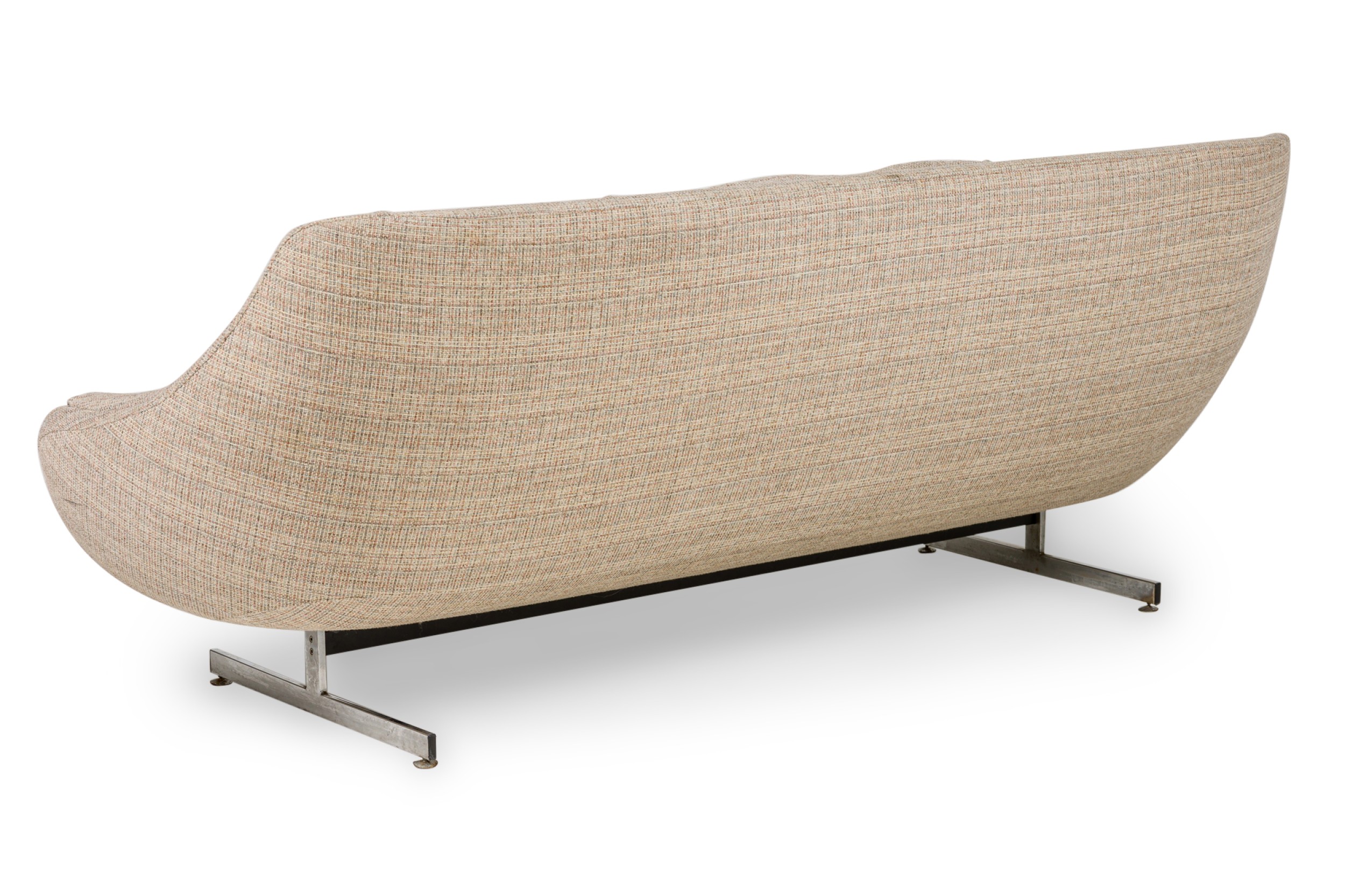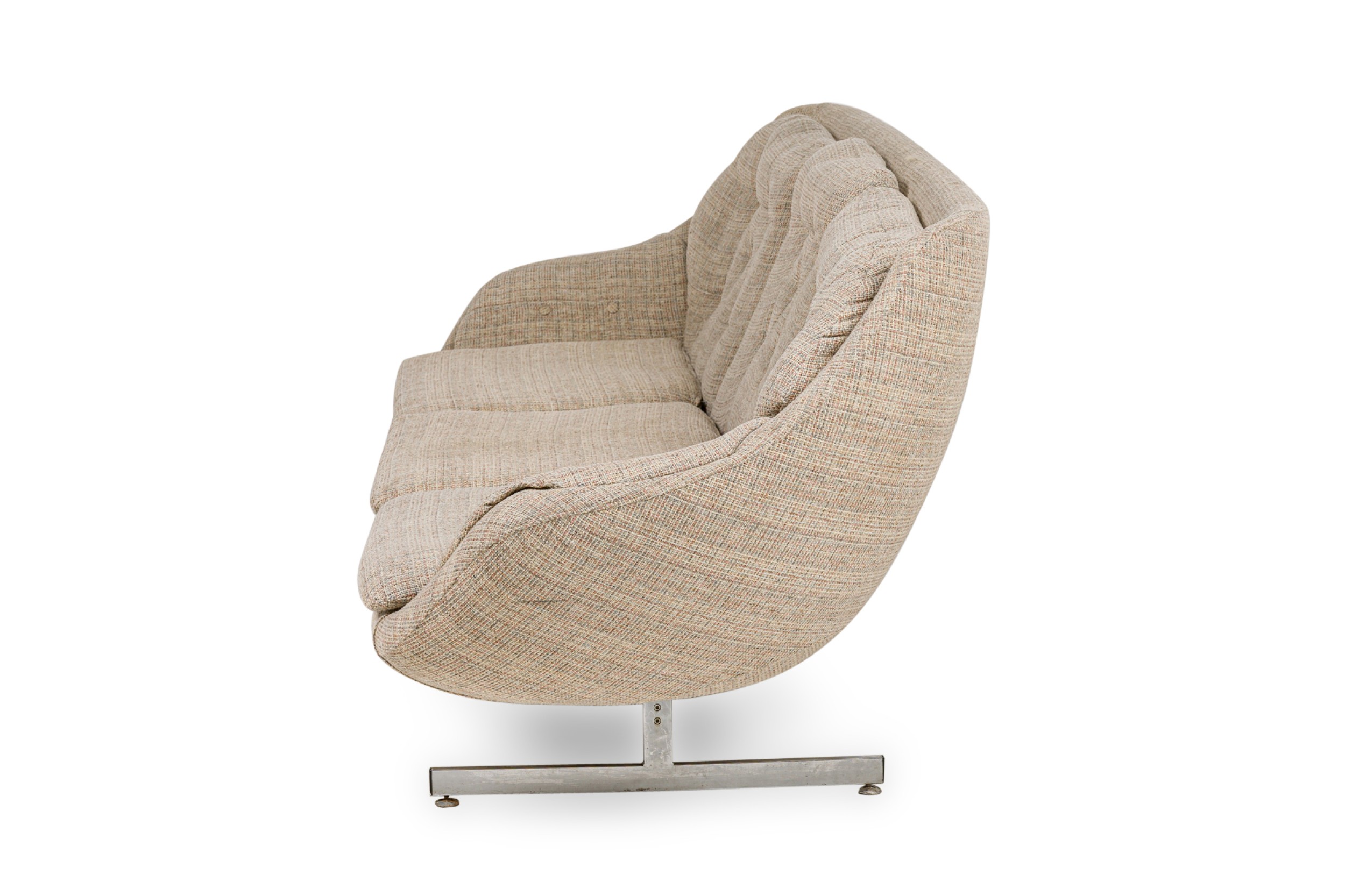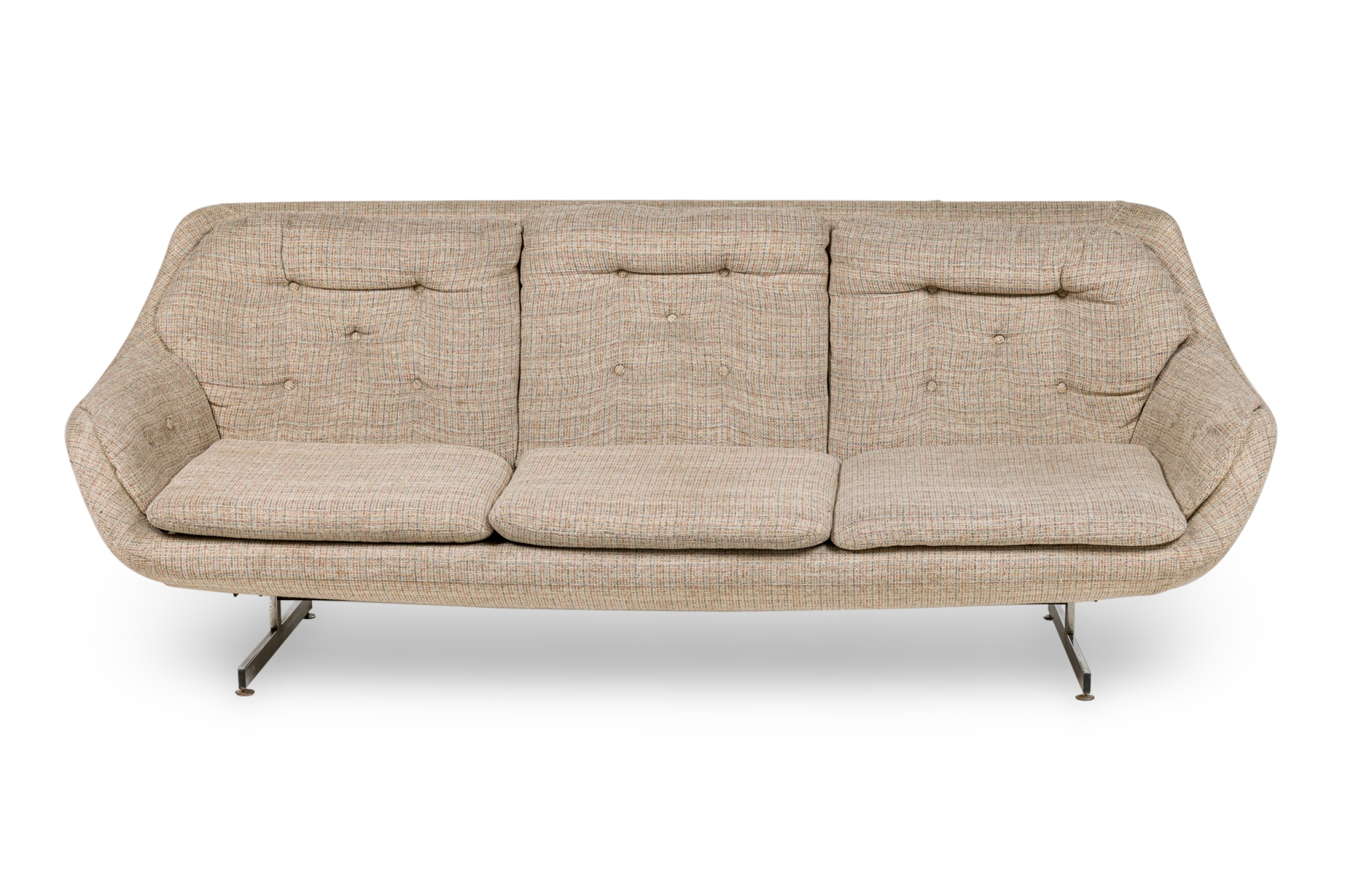 Swedish MCM 3-seat sofa in an off-white tweed blend with sewn-in tufted back and bolster cushions with floating style chrome base