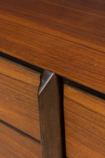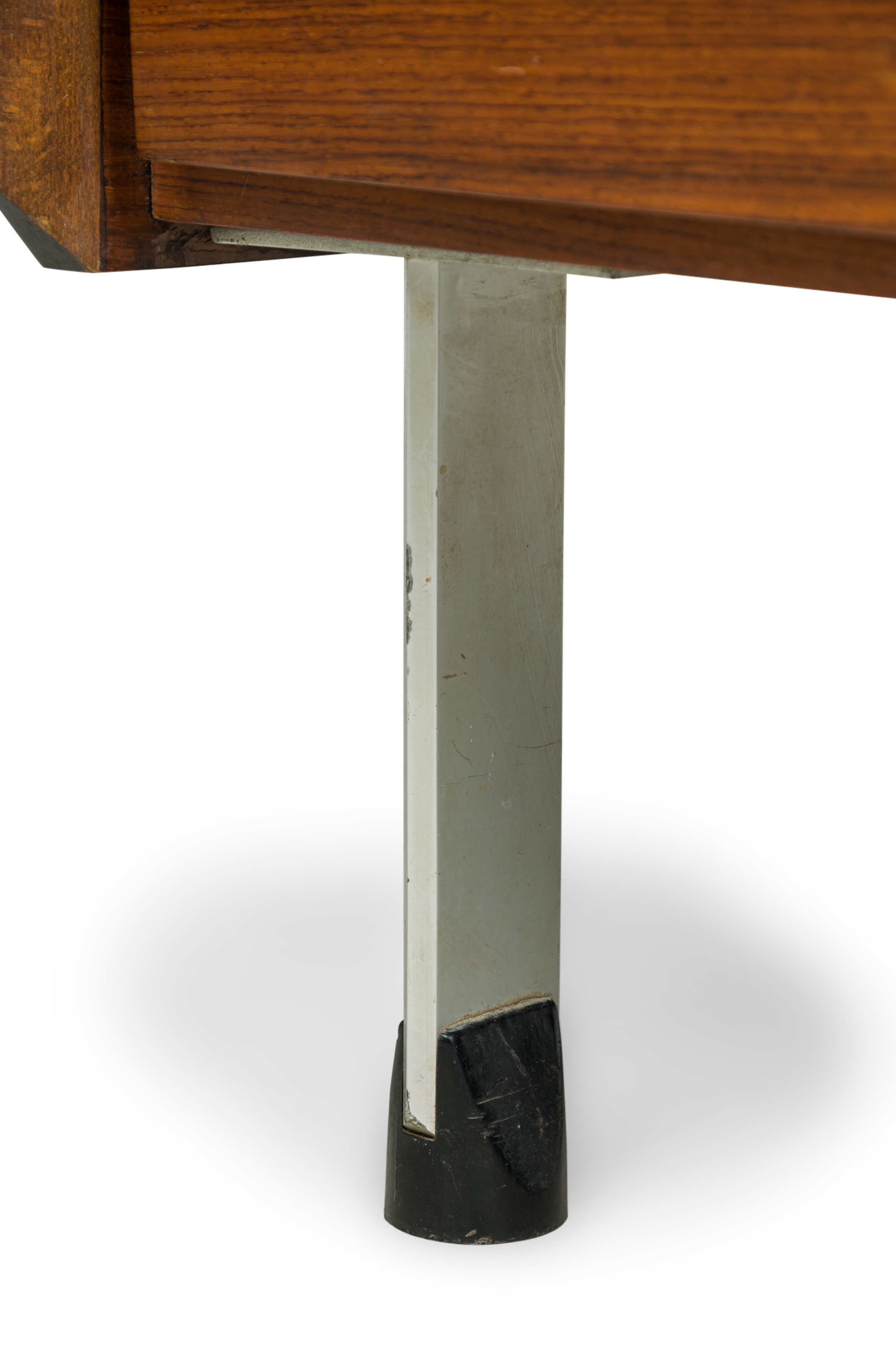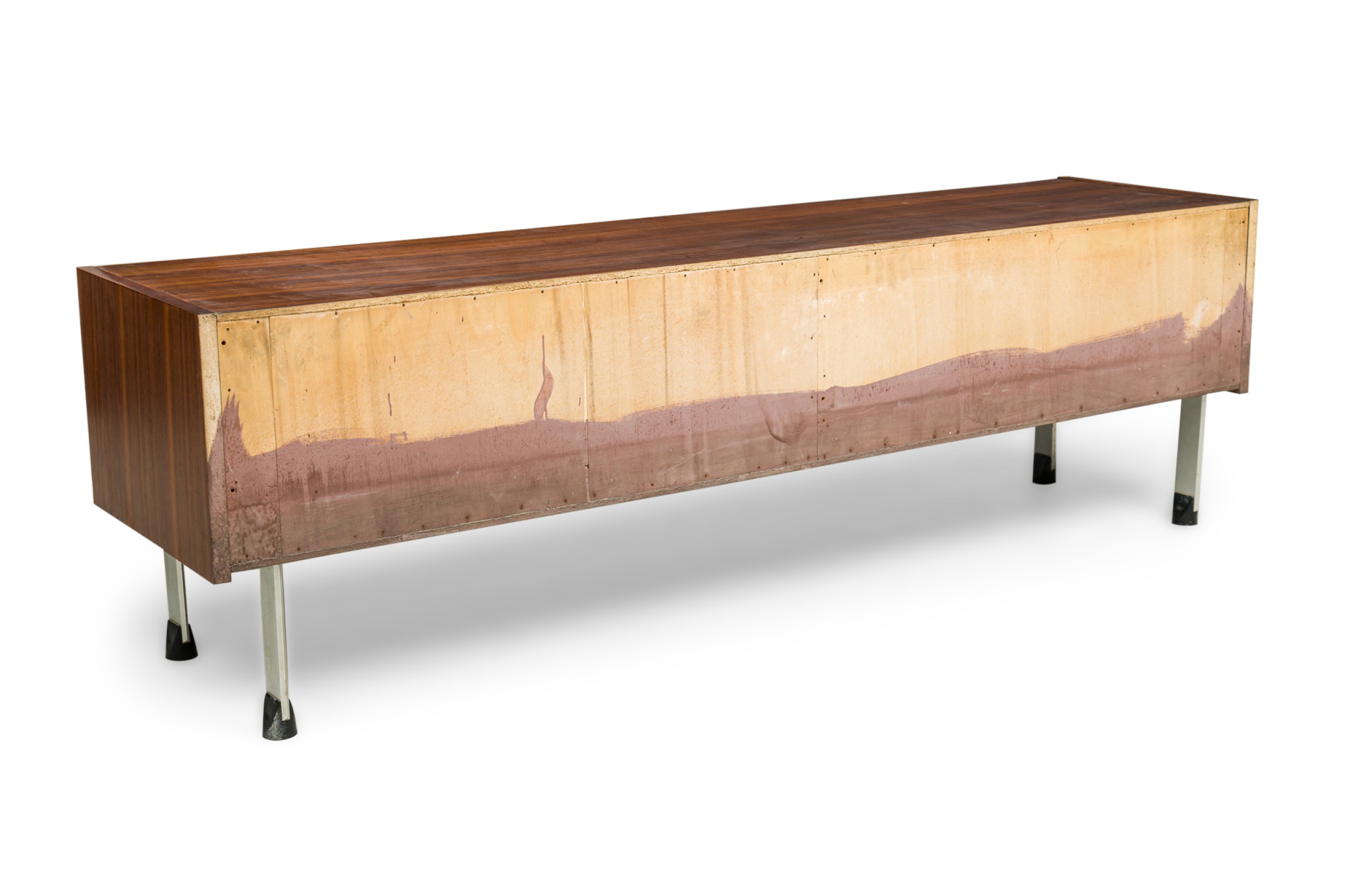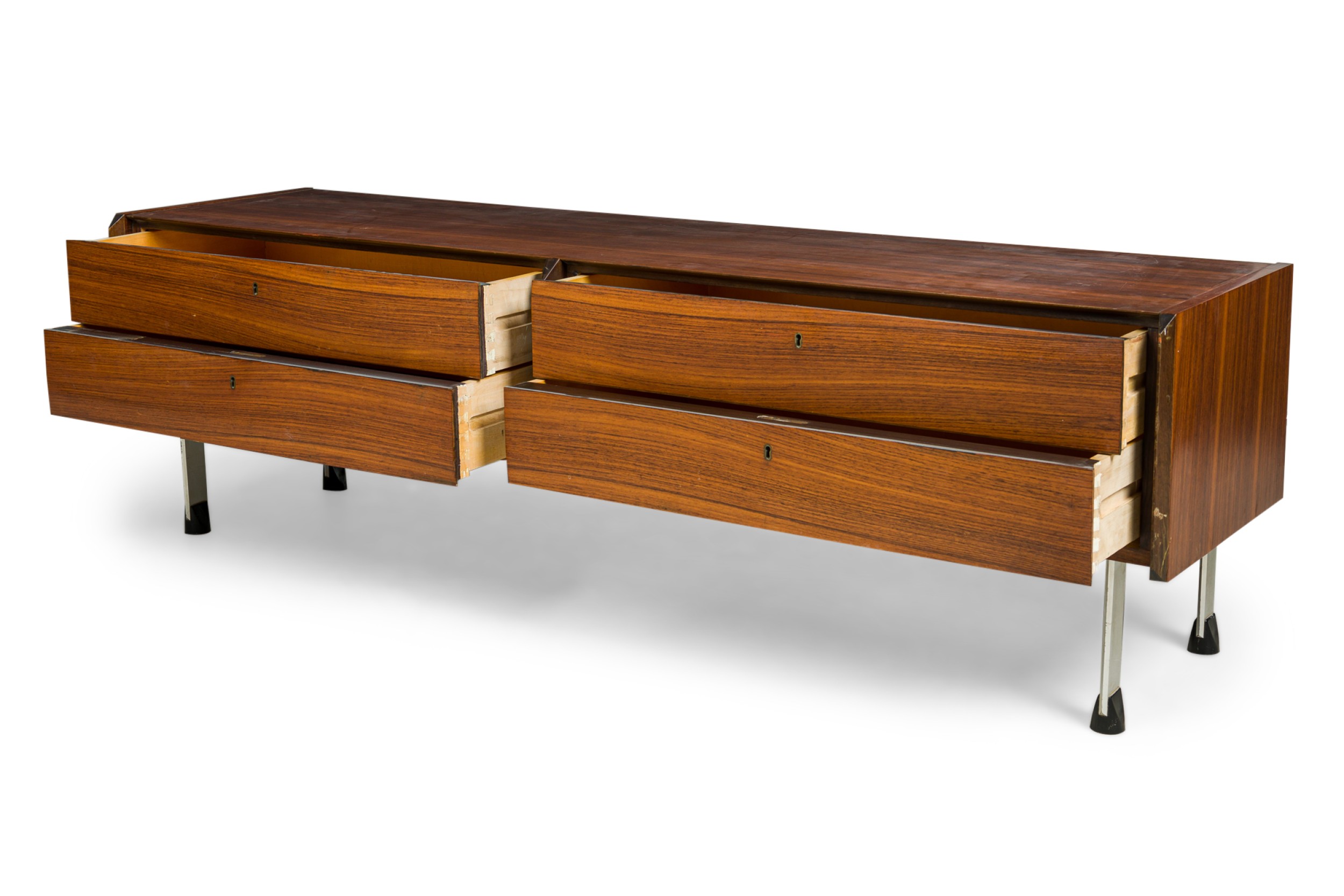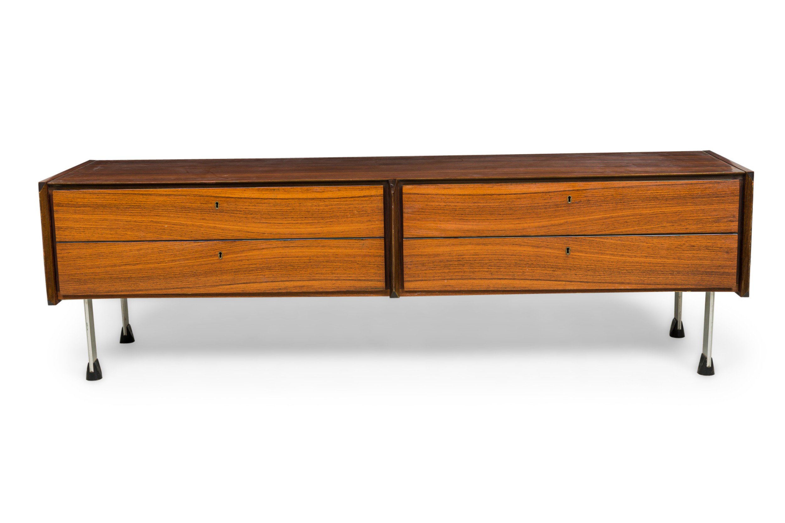 Swedish Mid-Century rosewood low buffet / sideboard with 2 pair of drawers and narrow chrome metal legs ending in a black form sabot