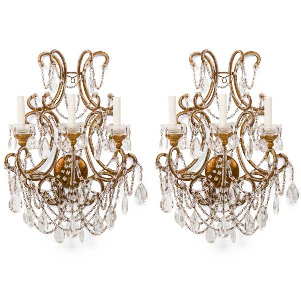 Pair of Italian Venetian Style Crystal and Metal Scroll Arm Sconces