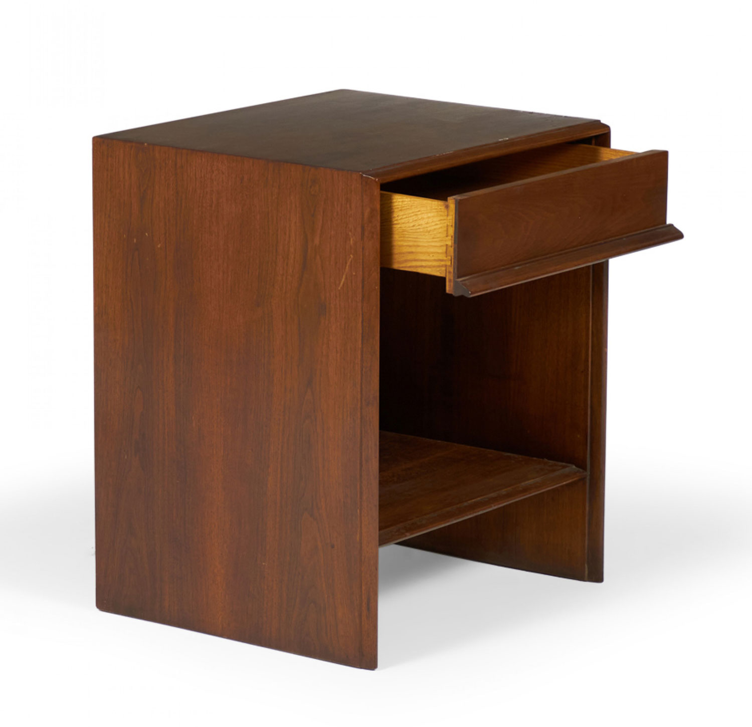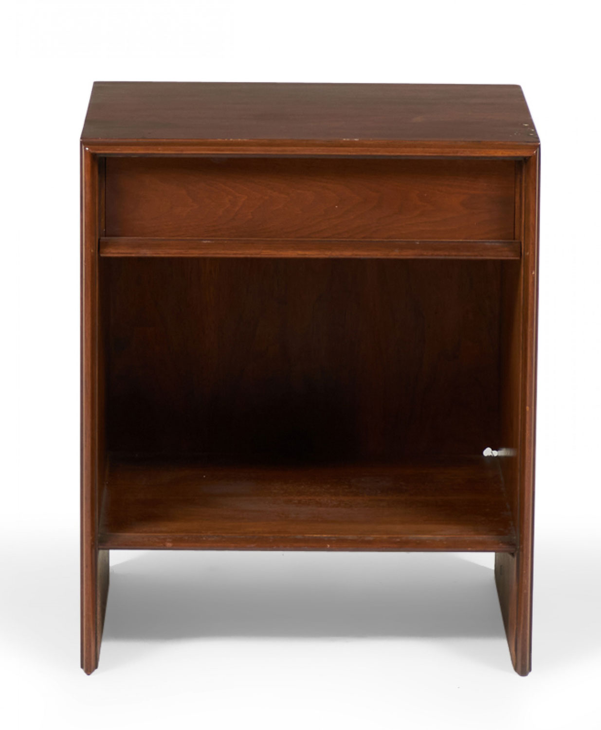 American Mid-Century Modern (circa 1950) nightstand in walnut, comprised of a single recessed top drawer, a lower shelf, and tapered round nose edge detail to the frame. (T.H. ROBSJOHN-GIBBINGS FOR WIDDICOMB, has original Widdicomb label.).