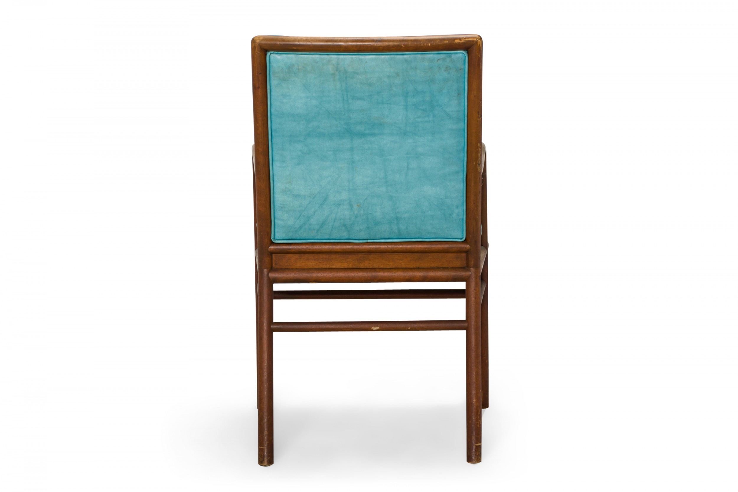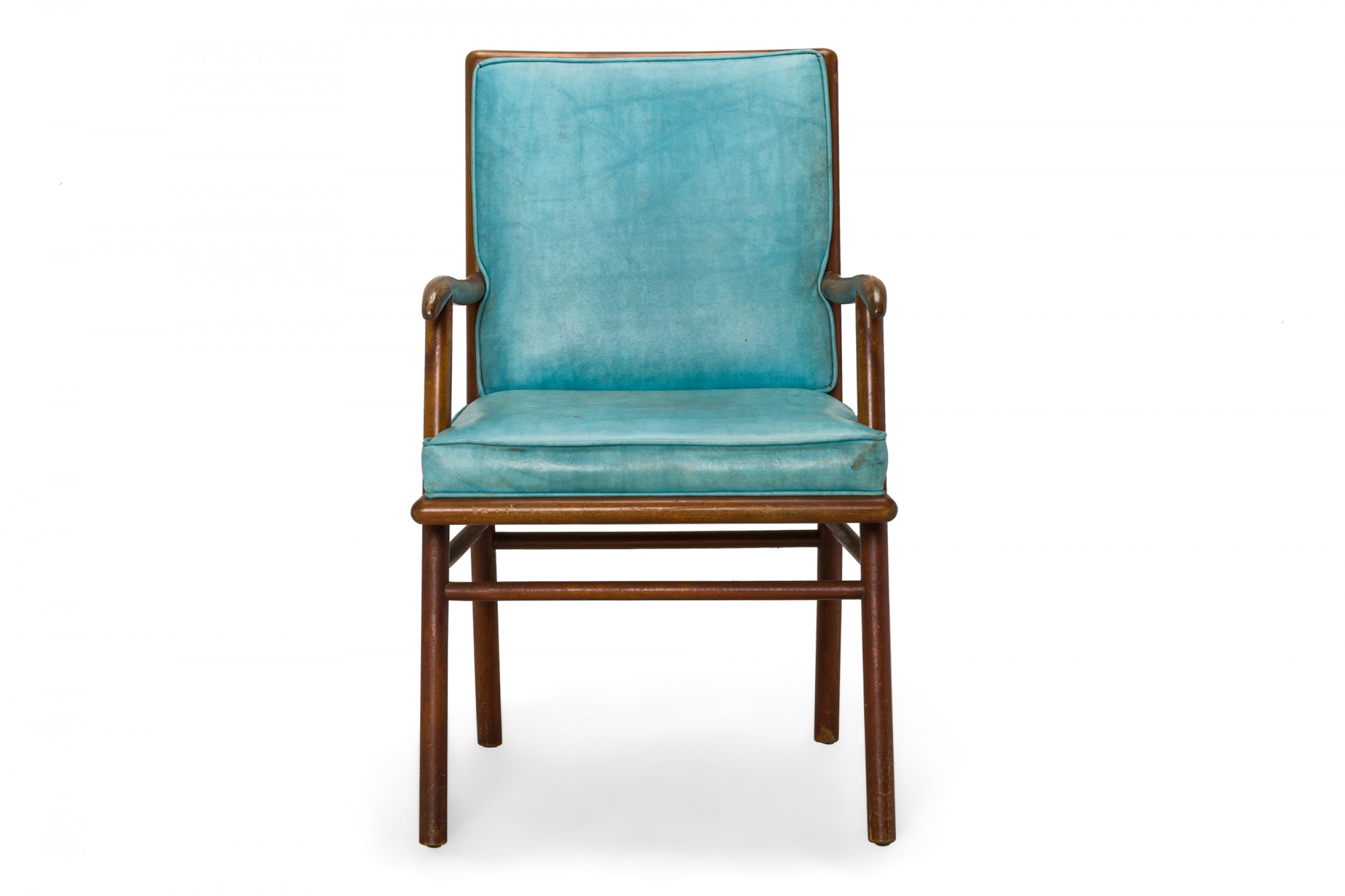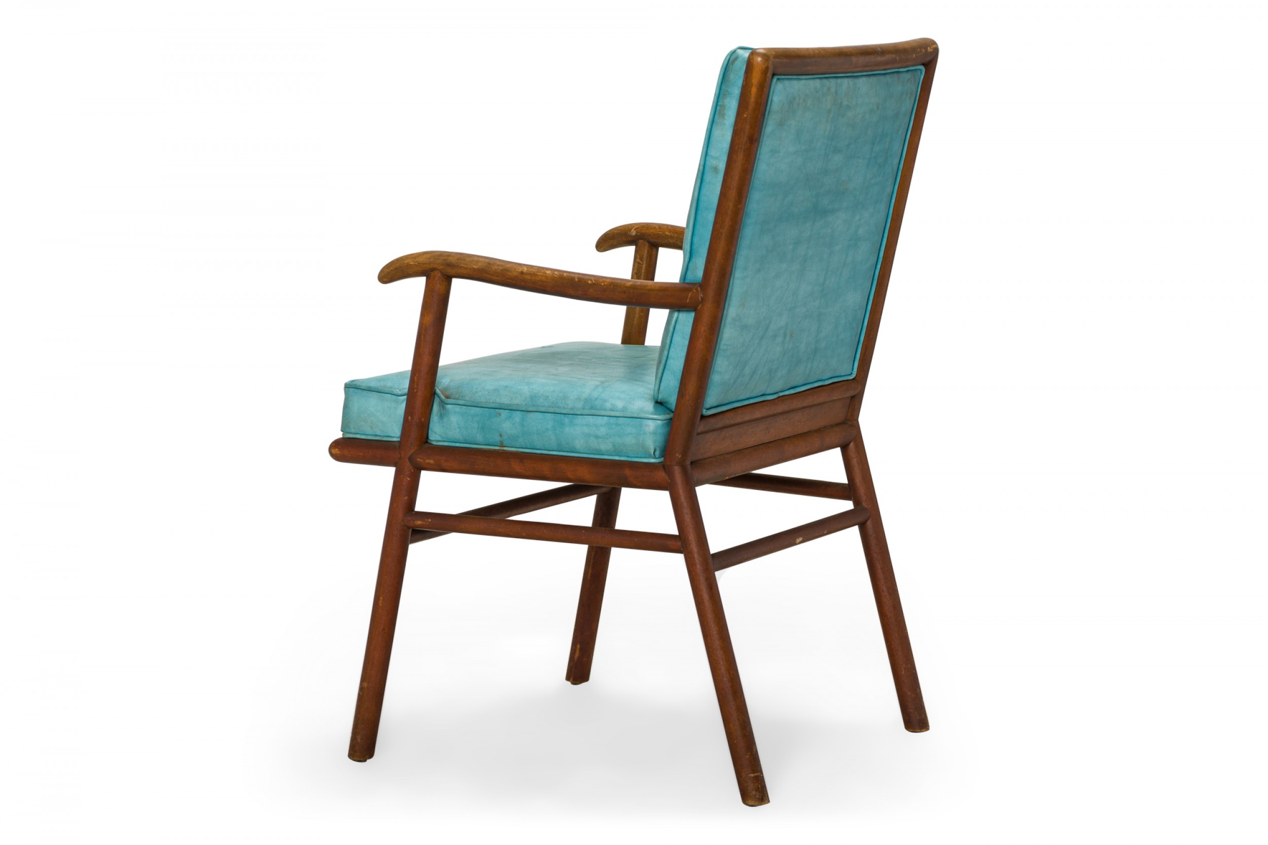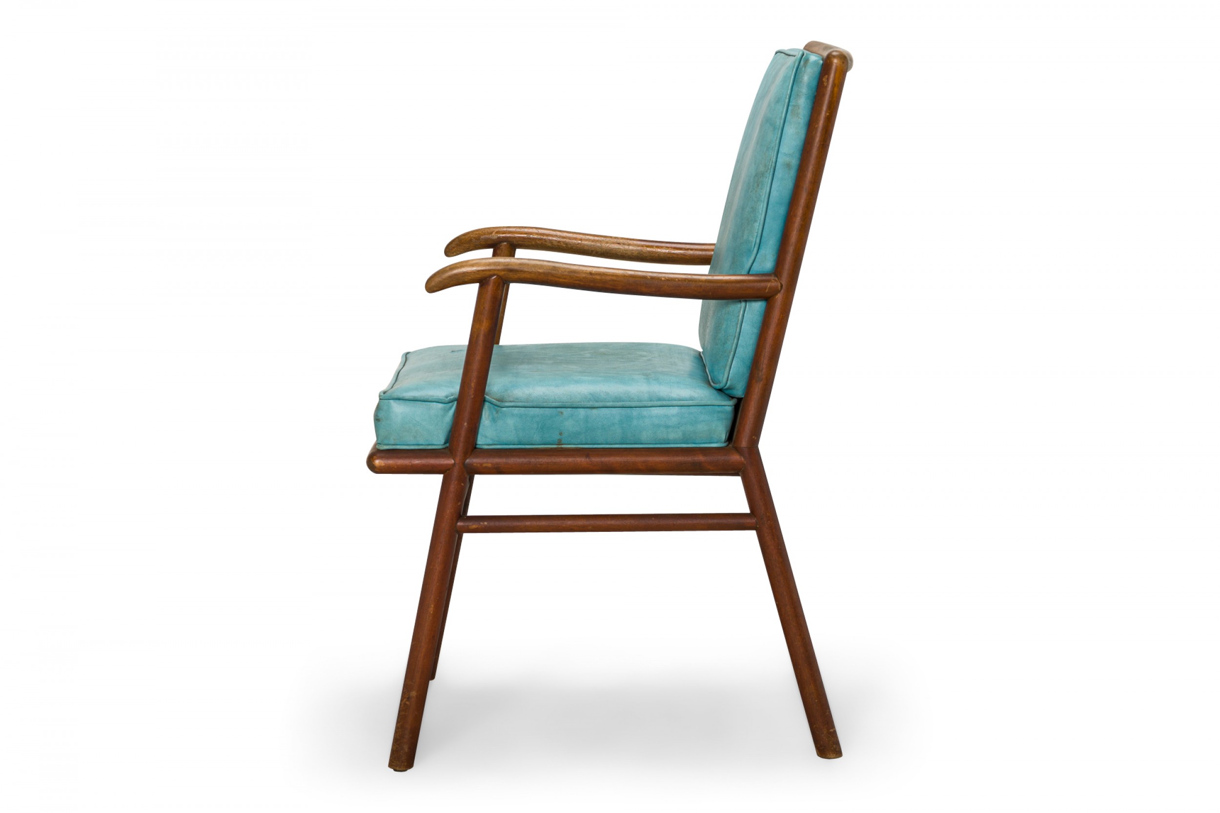 American Mid-Century dining armchair with a shaped walnut frame and bright blue vinyl upholstered seat and back cushions, resting on four angled dowel legs. (T.H. ROBSJOHN-GIBBINGS FOR WIDDICOMB FURNITURE COMPANY)