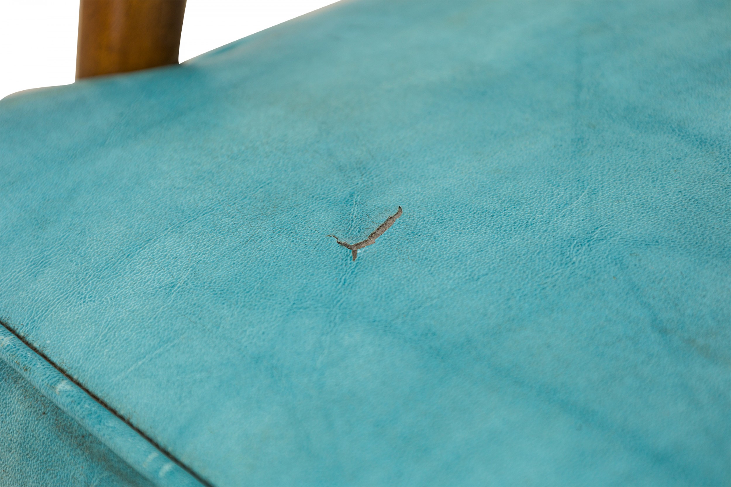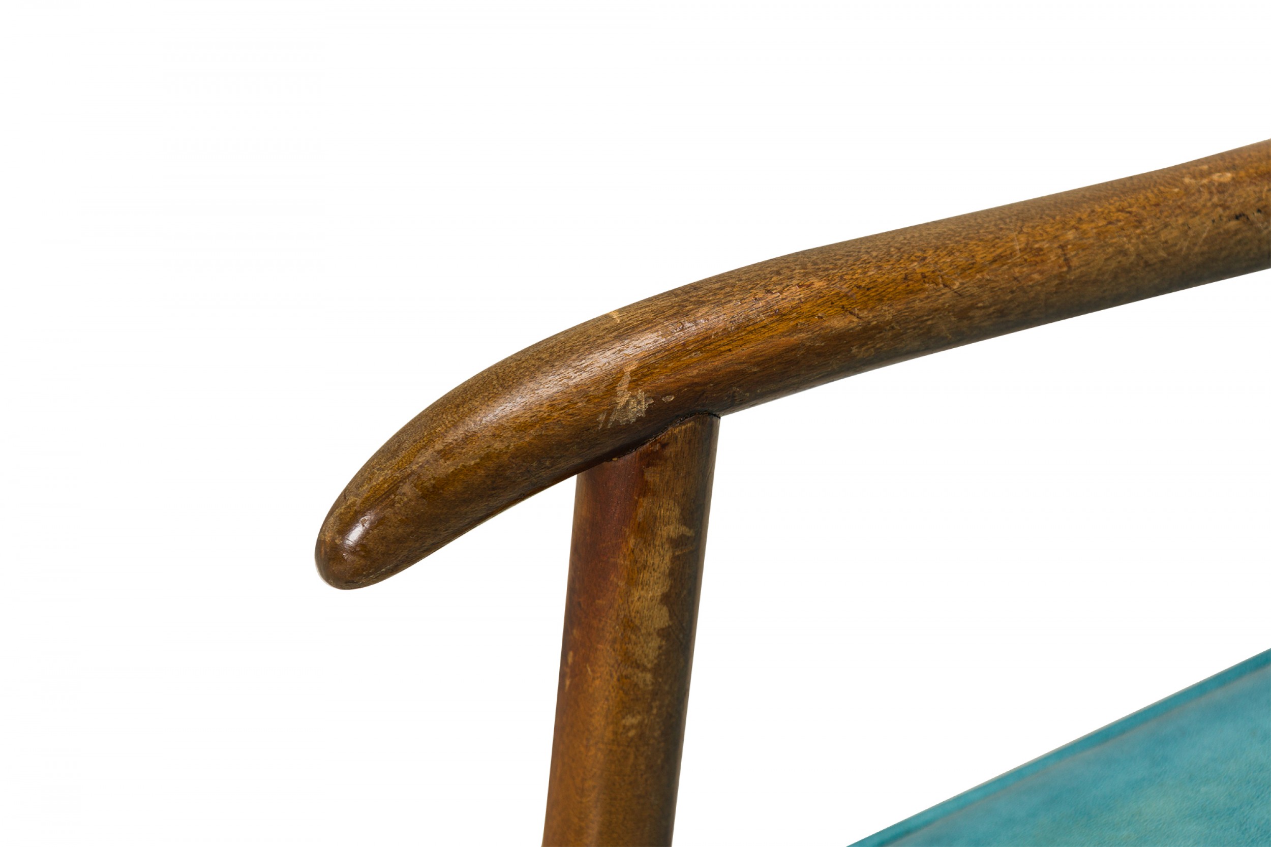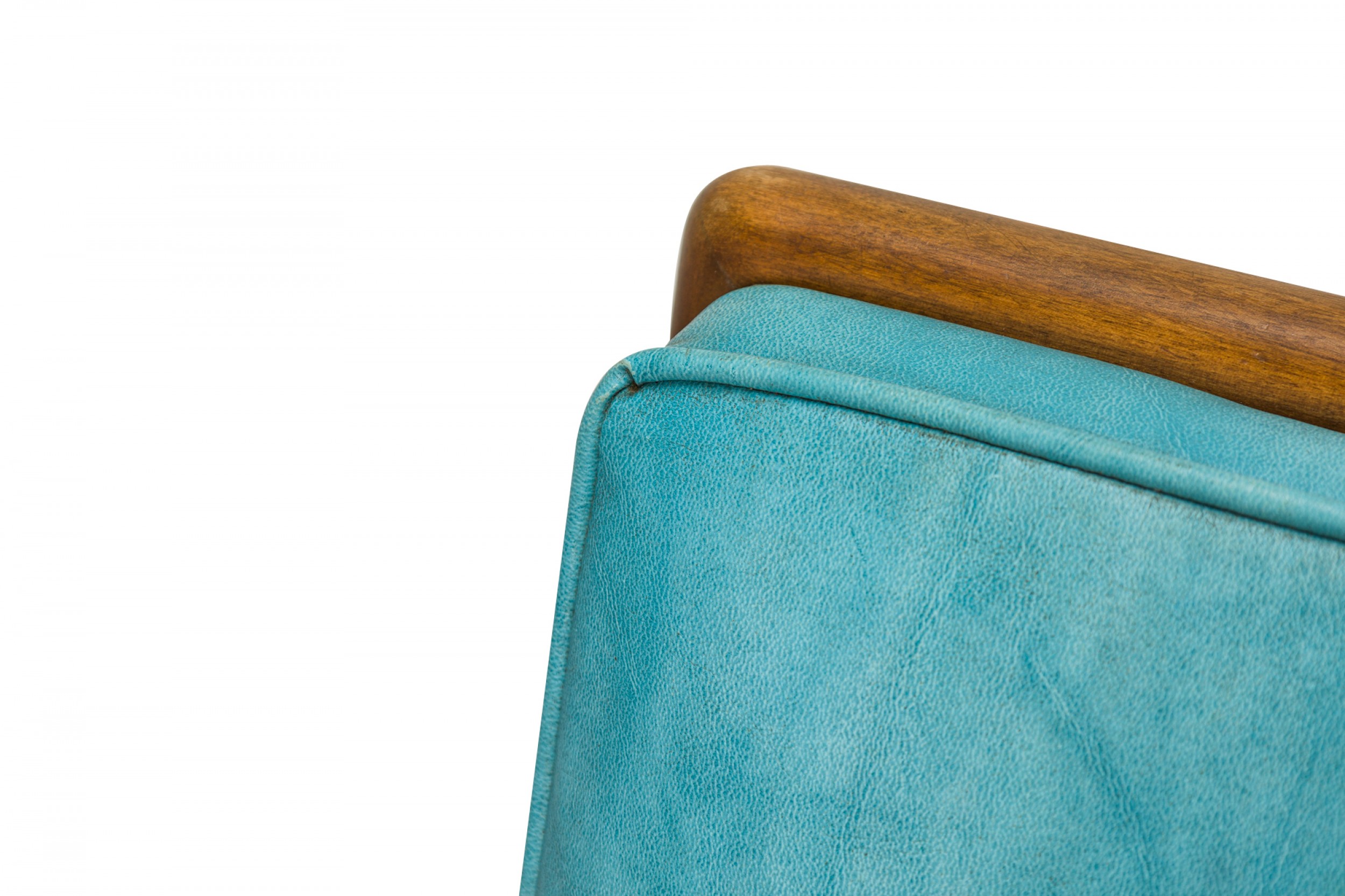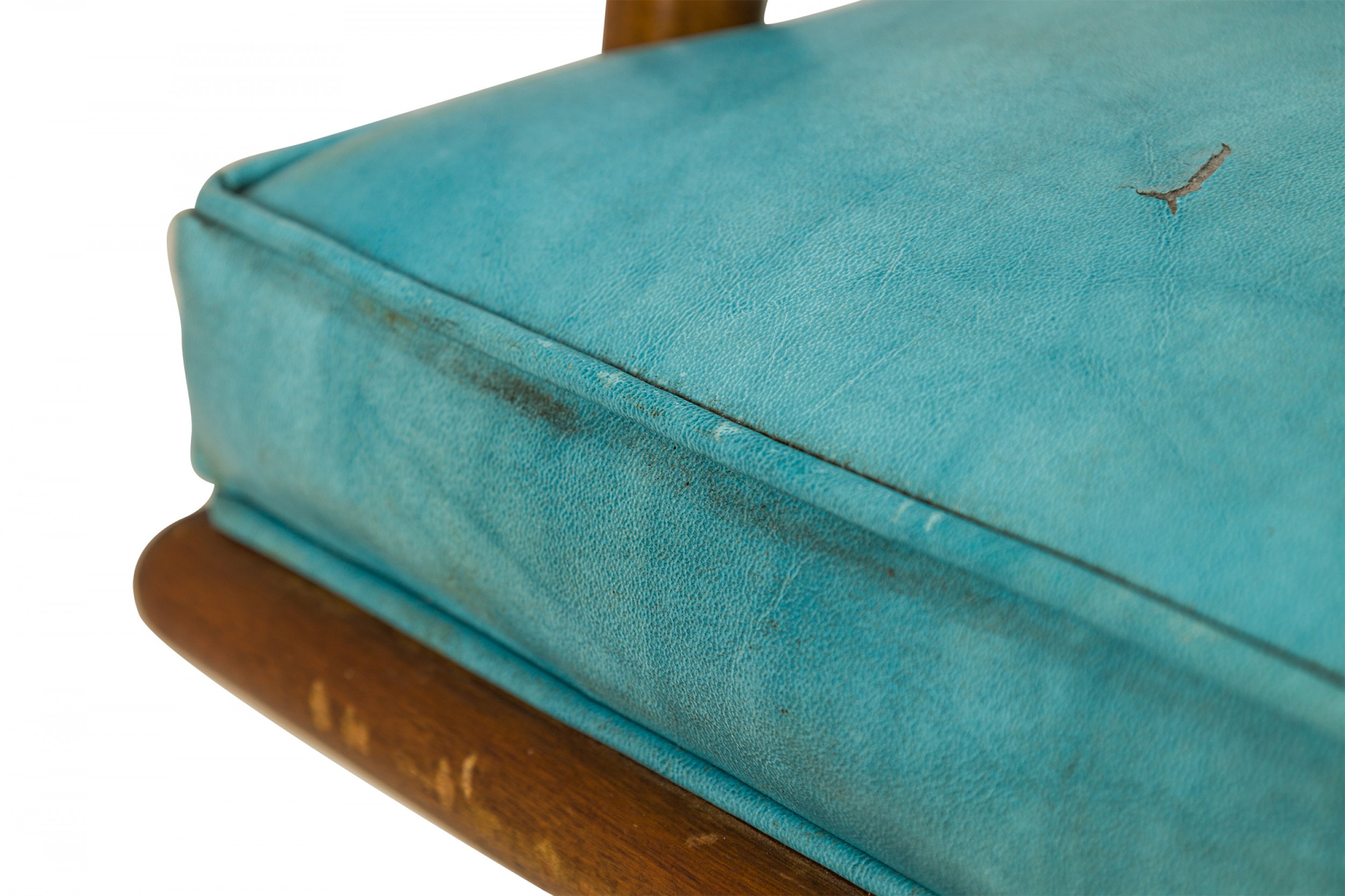 Style: Mid-Century Materials & Techniques: Upholstered, vinyl, walnut, wood Category: Seating Condition: Small puncture in seat upholstery. Good; Wear consistent with age and use