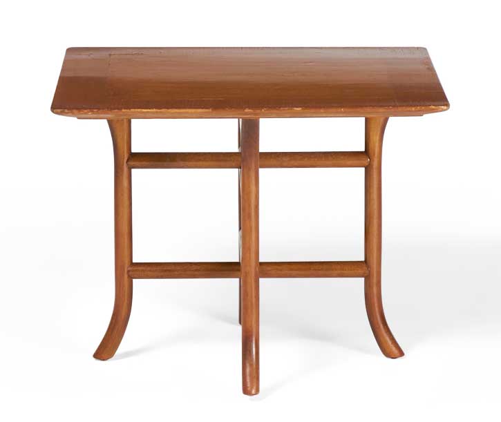 T.H. Robsjohn-Gibbings (1905-1976) was a renowned furniture and decorative arts designer of the mid-20th century. Born Terence Harold Robsjohn-Gibbings on March 17, 1905, in London, England, he later became known for his significant contributions to the field of modern design. Robsjohn-Gibbings initially pursued a career in architecture, studying at the Architectural Association School of Architecture in London. However, his passion for furniture and interior design soon led him to shift his focus. In the early 1930s, he relocated to New York City, where he began working as an interior designer and decorator. During his career, Robsjohn-Gibbings developed a unique design aesthetic characterized by clean lines, simplicity, and a focus on natural materials. He drew inspiration from classical Greek and Egyptian designs, combining elements of antiquity with modern sensibilities. His furniture pieces often featured bold geometric shapes, solid wood construction, and minimal ornamentation. In 1936, Robsjohn-Gibbings gained widespread recognition with the publication of his book "Goodbye, Mr. Chippendale: Being a Series of Occasional Observations on the Manners and Customs of the People Who Make Furniture." This influential work criticized the prevailing taste for ornate and heavily carved furniture, advocating for a more streamlined and contemporary approach. Robsjohn-Gibbings' career flourished in the 1940s and 1950s, during which he collaborated with prestigious clients such as Doris Duke, Elizabeth Arden, and Helena Rubinstein. His designs were sought after by affluent individuals who appreciated his ability to create elegant and functional interiors. In addition to his work as a furniture designer, Robsjohn-Gibbings also ventured into other creative endeavors. He designed textiles, ceramics, and even ventured into the realm of theater and film set design. His versatility and artistic vision allowed him to leave a lasting impact on various aspects of the decorative arts. Throughout his career, Robsjohn-Gibbings received numerous accolades and honors for his contributions to the field of design. His work was exhibited in prestigious museums and galleries, including the Metropolitan Museum of Art in New York City. He also served as the president of the American Institute of Decorators from 1940 to 1942. T.H. Robsjohn-Gibbings passed away on March 6,