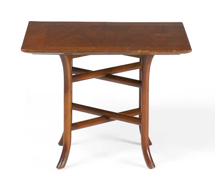 T.H. Robsjohn-Gibbings for Widdicomb Mid-Century Walnut Square Crossed Trestle Occasional Table