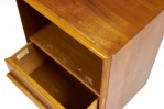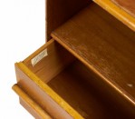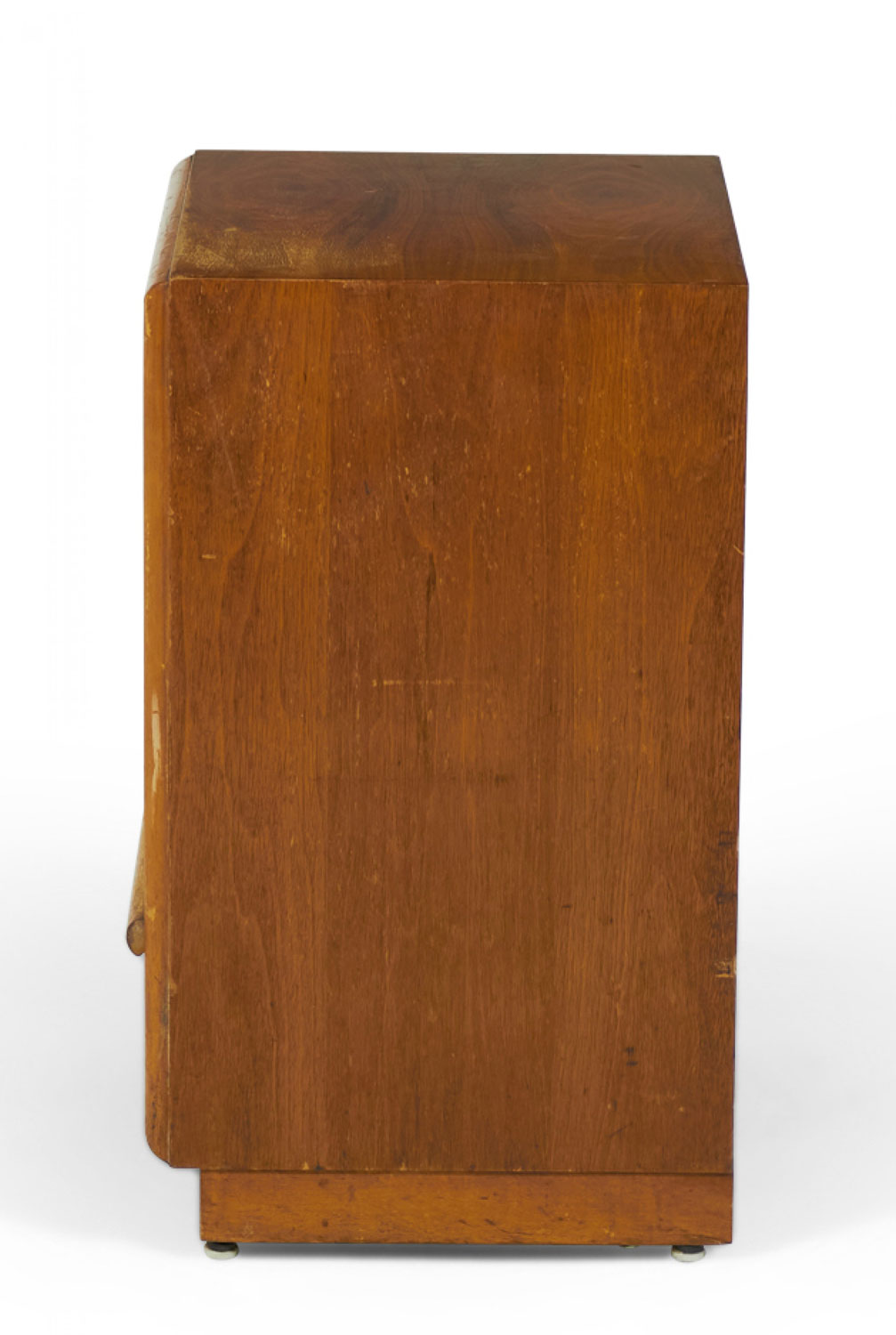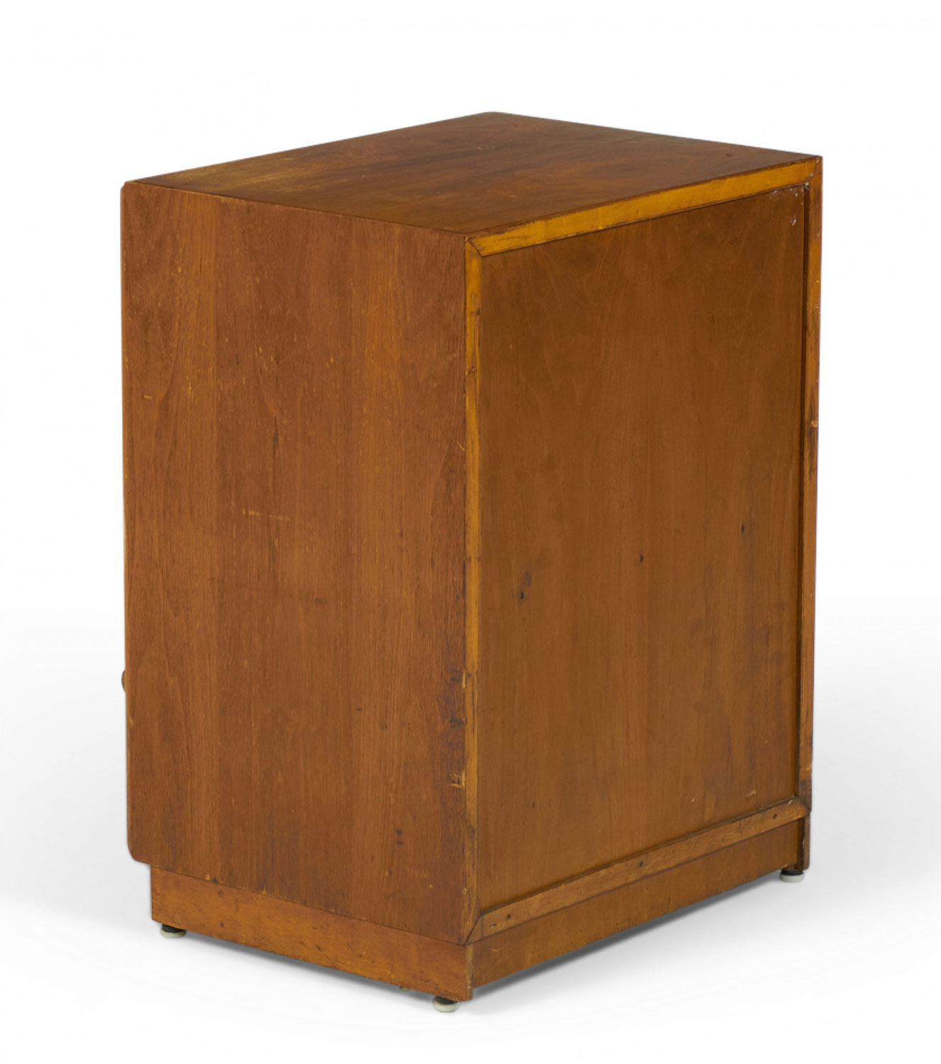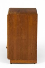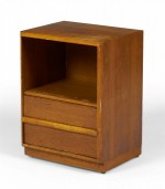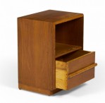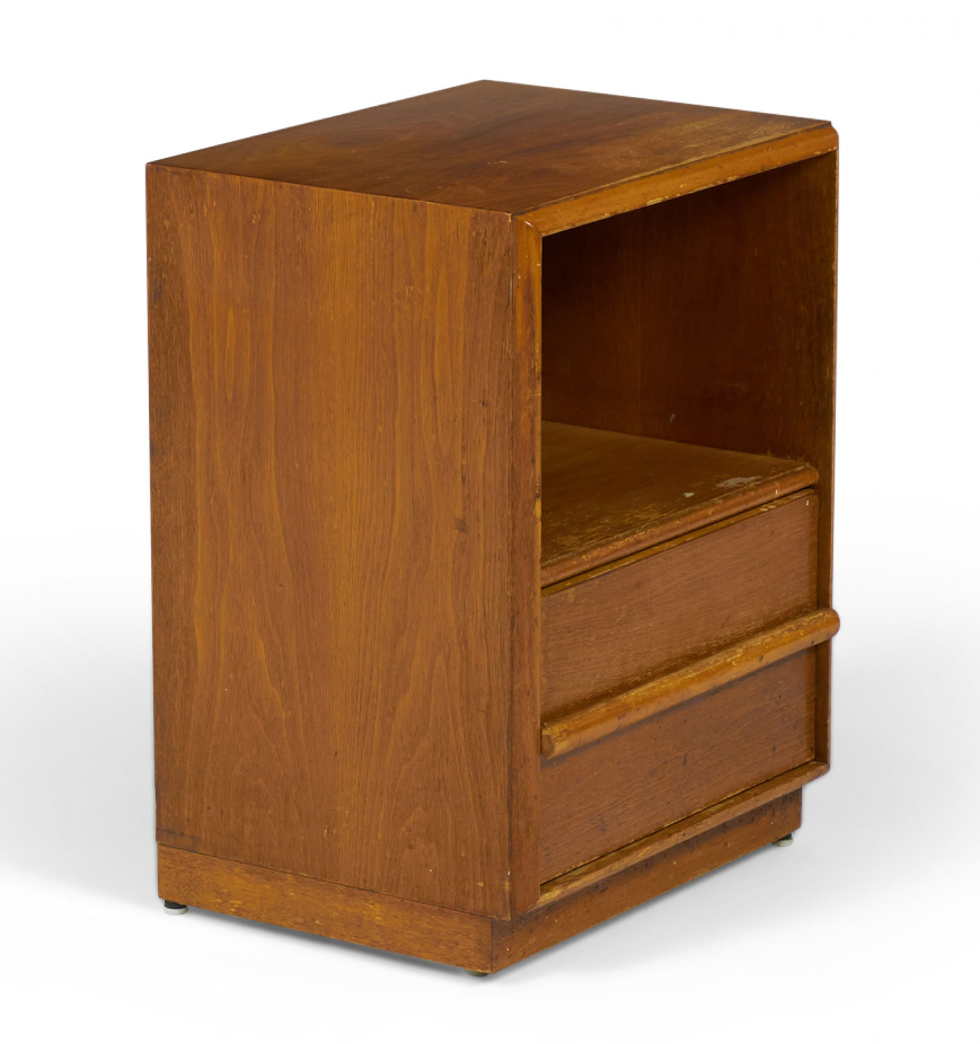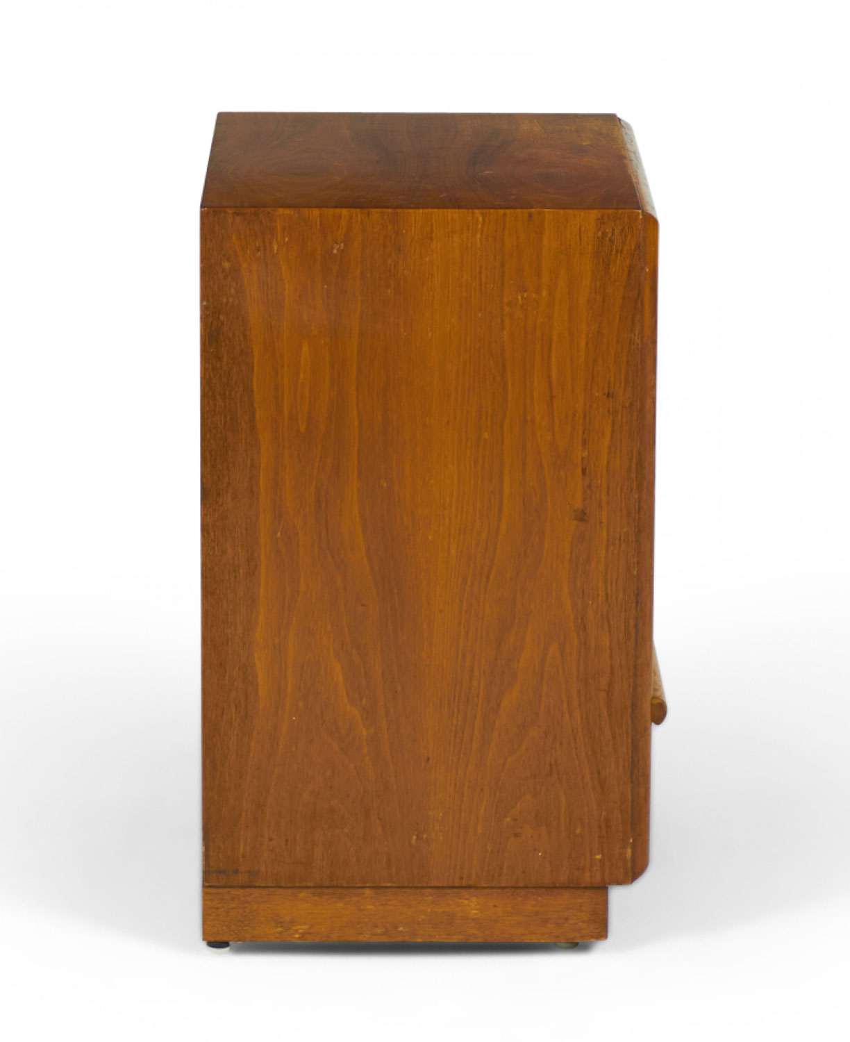American Mid-Century walnut nightstand with an open upper cabinet shelf and a single lower drawer with a horizontal raised wooden drawer pull. (T.H. ROBSJOHN-GIBBINGS FOR WIDDICOMB)(Same piece with different finish: DUF0143B-C).