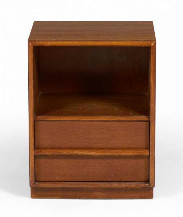 American Mid-Century walnut nightstand with an open upper cabinet shelf and a single lower drawer with a horizontal raised wooden drawer pull. (T.H. ROBSJOHN-GIBBINGS FOR WIDDICOMB)(Same piece with different finish: DUF0143B-C)