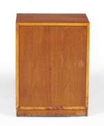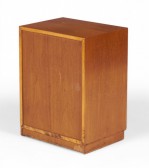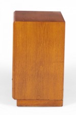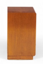 American Mid-Century walnut nightstand with an open upper cabinet shelf and a single lower drawer with a horizontal raised wooden drawer pull. (T.H. ROBSJOHN-GIBBINGS FOR WIDDICOMB)(Same piece with different finish: DUF0143A&C).