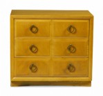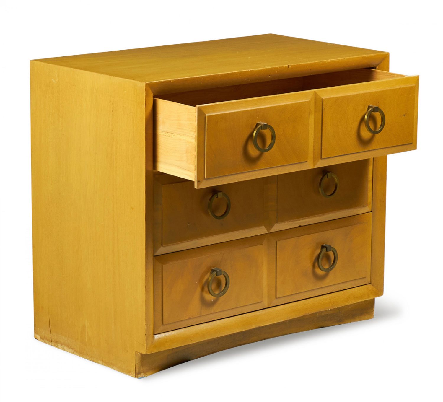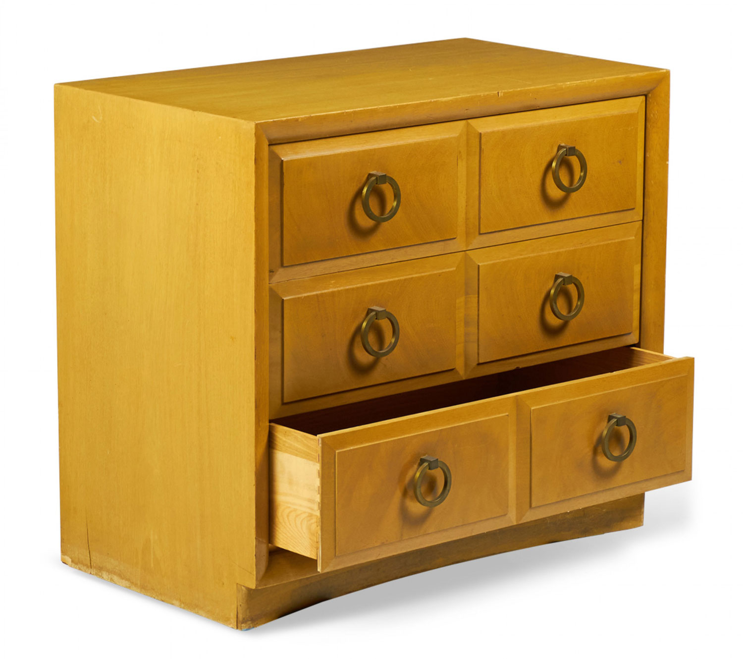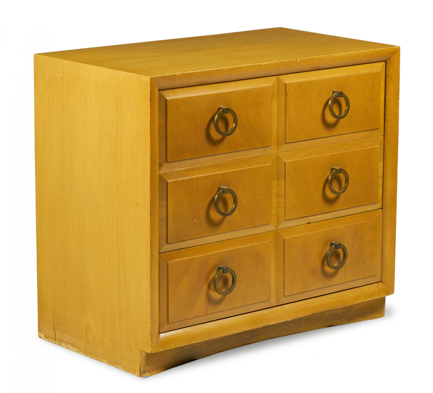 American Mid-Century (1950s) maple three-drawer chest with beveled drawer fronts and six brass ring-shaped drawer pulls. (T.H. ROBSJOHN-GIBBINGS FOR WIDDICOMB MODERN)(Similar Cabinets: DUF0140B, DUF0140C)