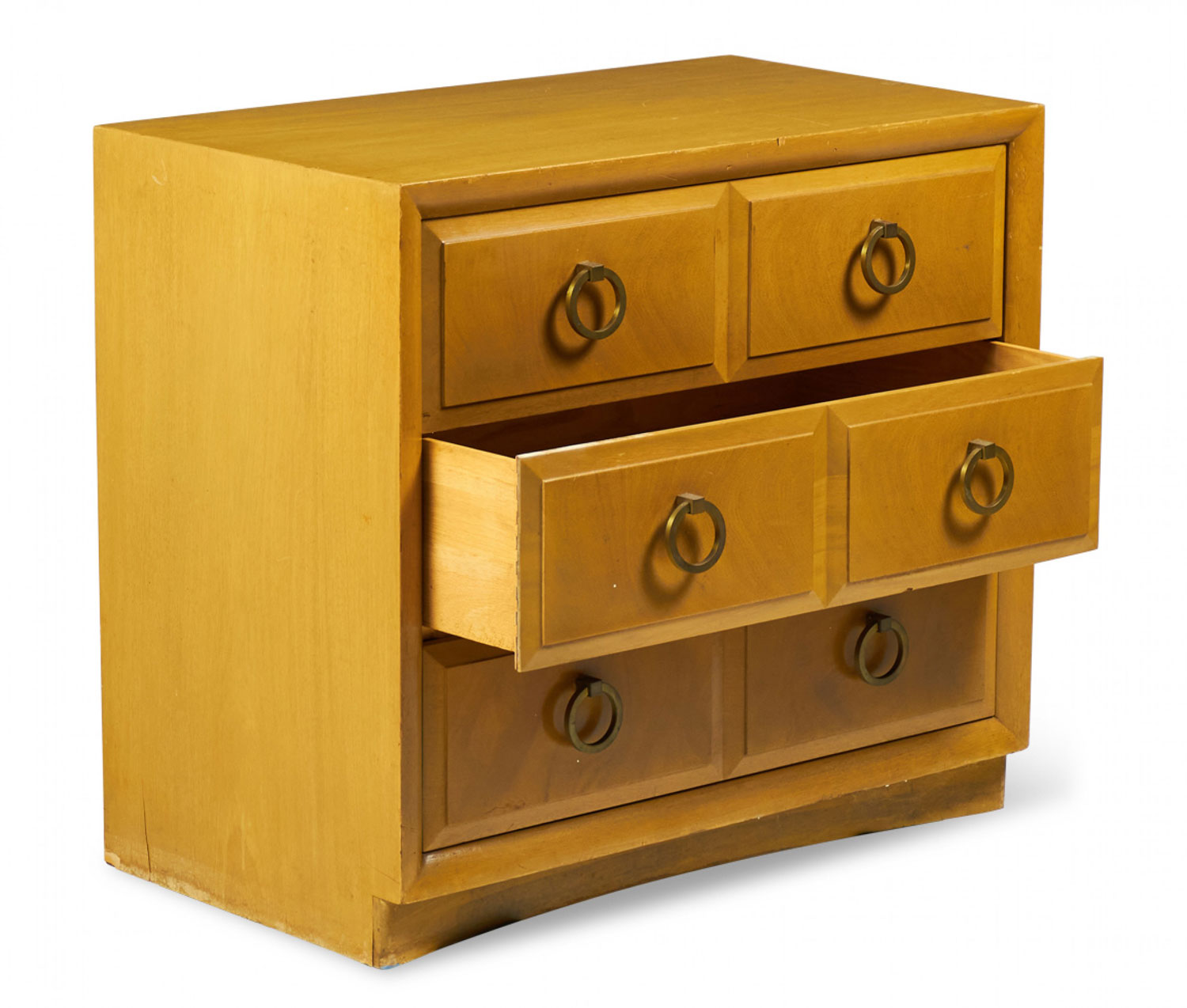American Mid-Century (1950s) maple three-drawer chest with beveled drawer fronts and six brass ring-shaped drawer pulls. (T.H. ROBSJOHN-GIBBINGS FOR WIDDICOMB MODERN)(Similar Cabinets: DUF0140B, DUF0140C).