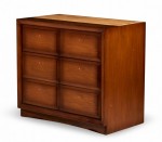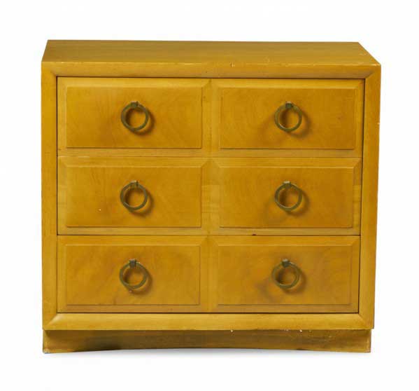 Style: Mid-Century Materials & Techniques: Beveled, maple, wood Category: Cabinets & Case Goods, Bedroom Condition: Missing drawer pull hardware. Good; Wear consistent with age and use
