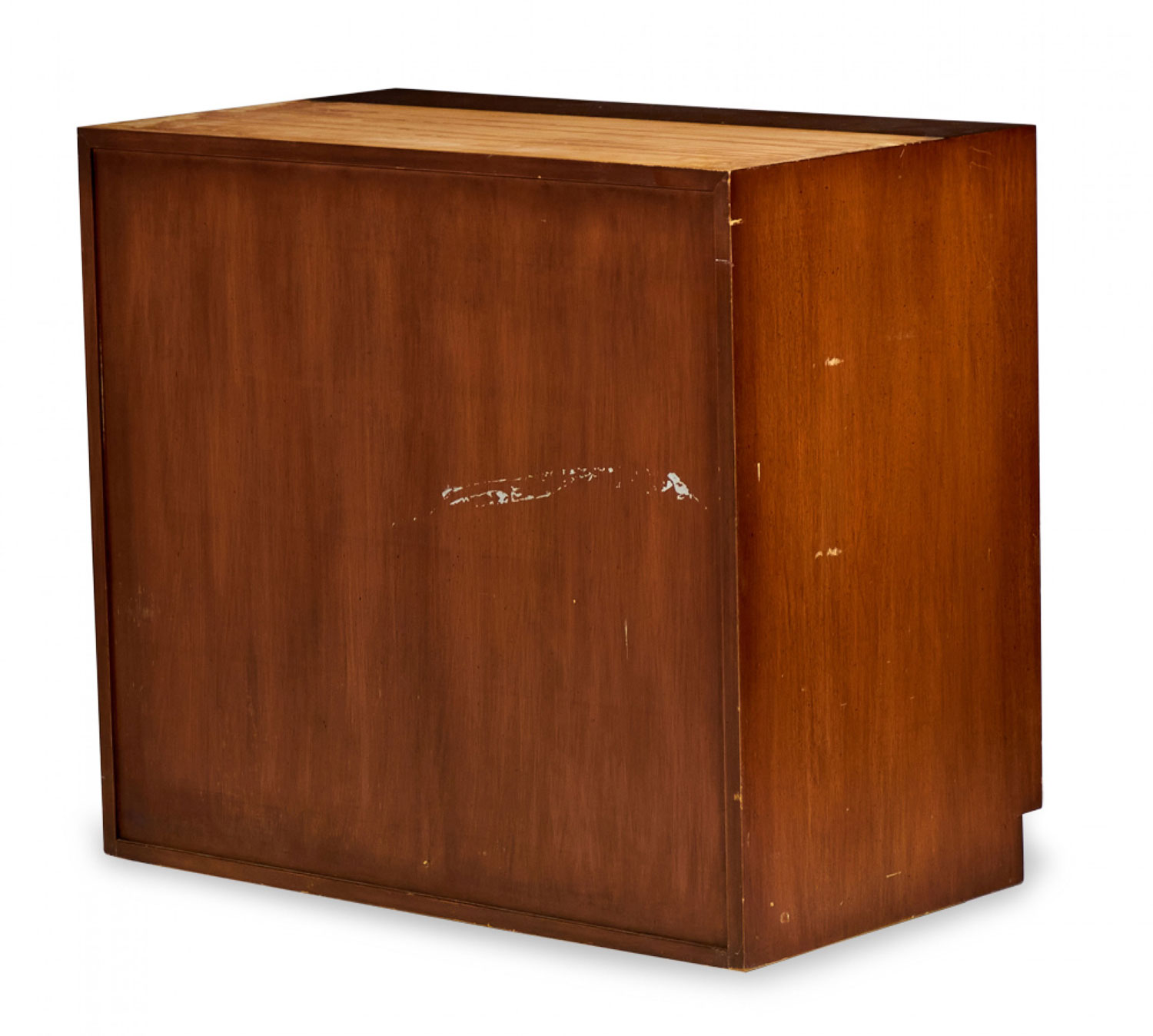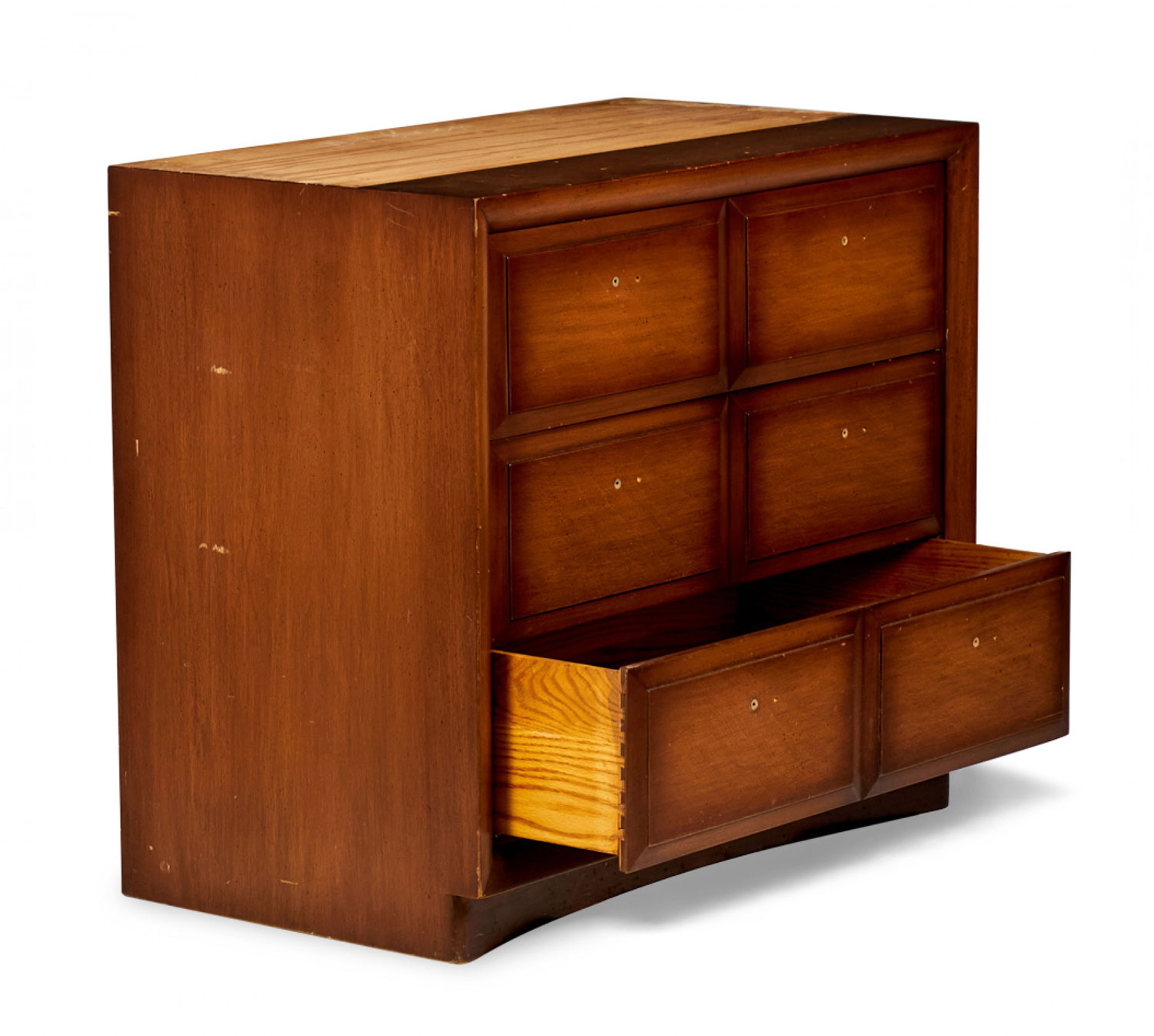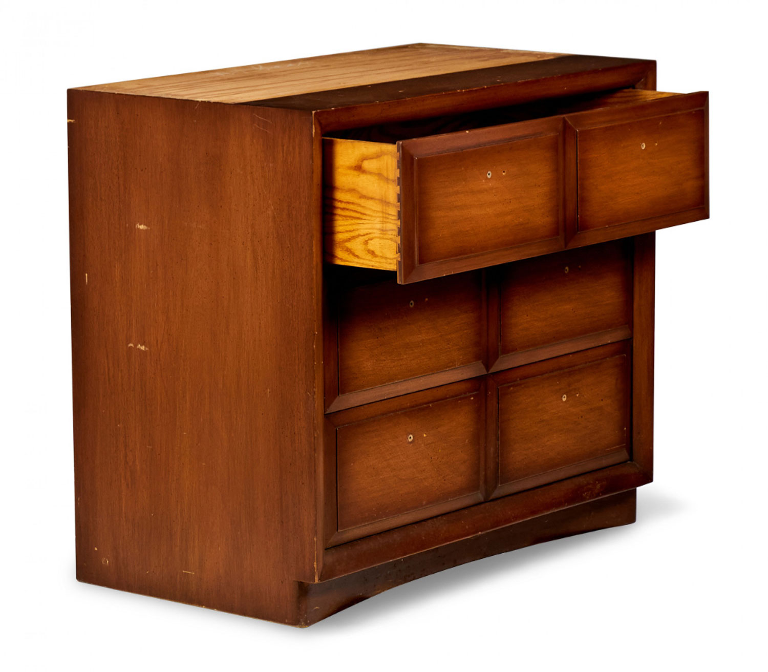 American Mid-Century (1950s) dark stained maple wooden three-drawer chest with beveled drawer fronts. (T.H. ROBSJOHN-GIBBINGS FOR WIDDICOMB MODERN)(Similar Cabinets: DUF0140A, DUF0140B).