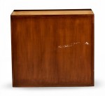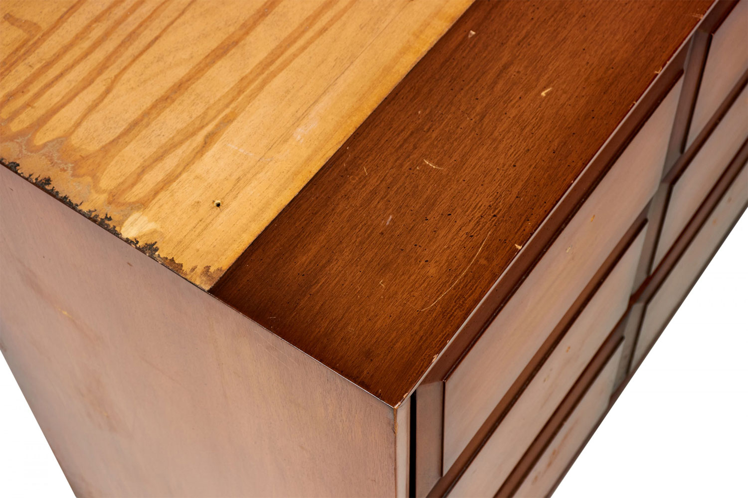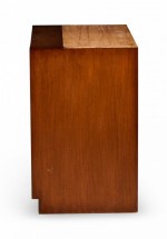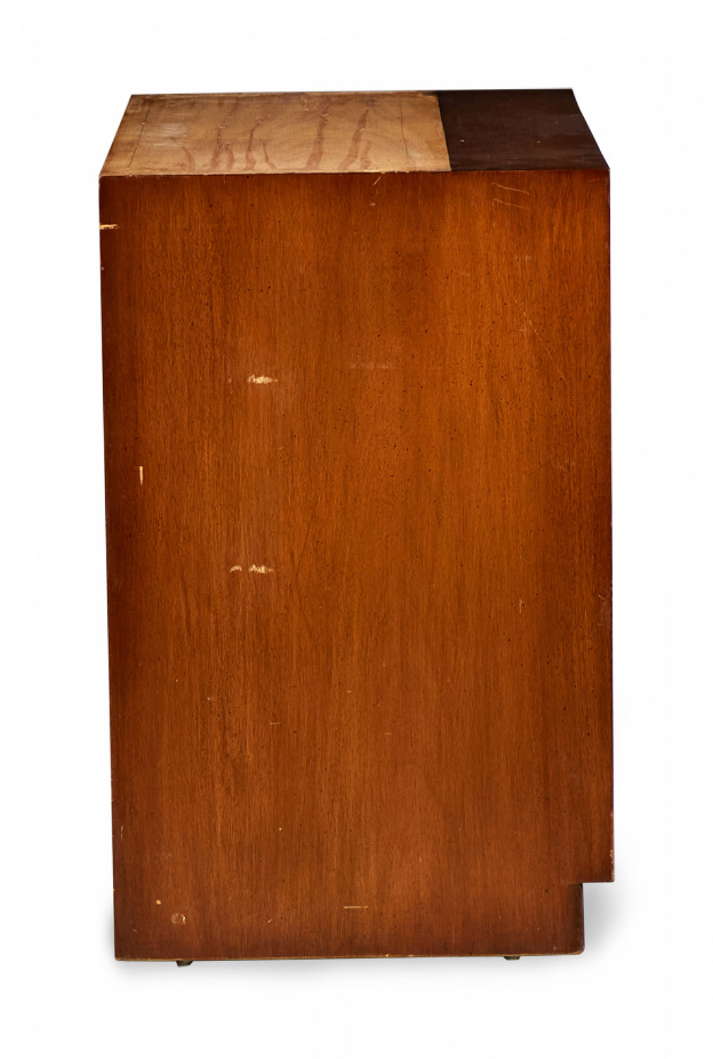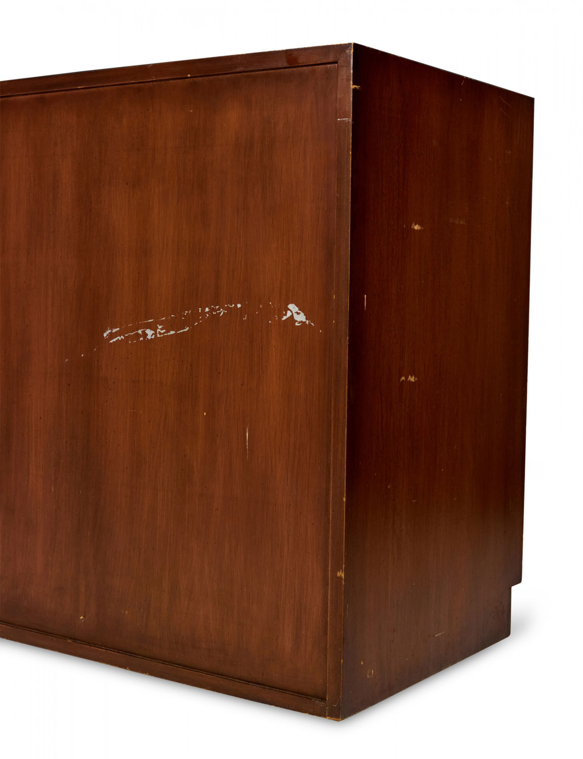 American Mid-Century (1950s) dark stained maple wooden three-drawer chest with beveled drawer fronts. (T.H. ROBSJOHN-GIBBINGS FOR WIDDICOMB MODERN)(Similar Cabinets: DUF0140A, DUF0140B).