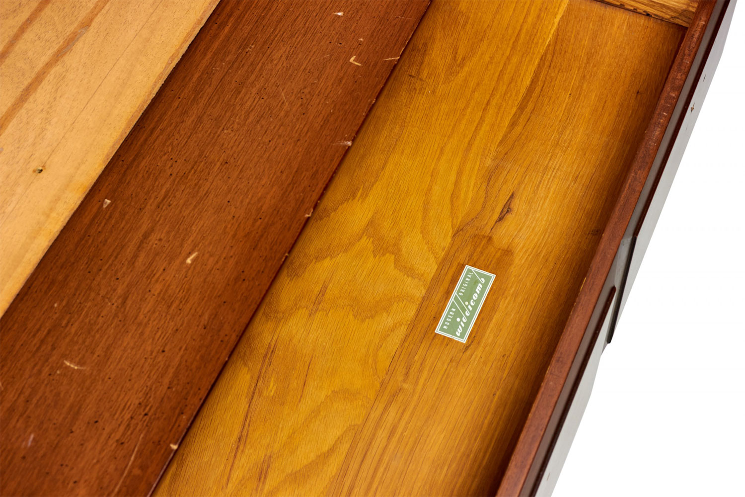 American Mid-Century (1950s) dark stained maple wooden three-drawer chest with beveled drawer fronts. (T.H. ROBSJOHN-GIBBINGS FOR WIDDICOMB MODERN)(Similar Cabinets: DUF0140A, DUF0140B)