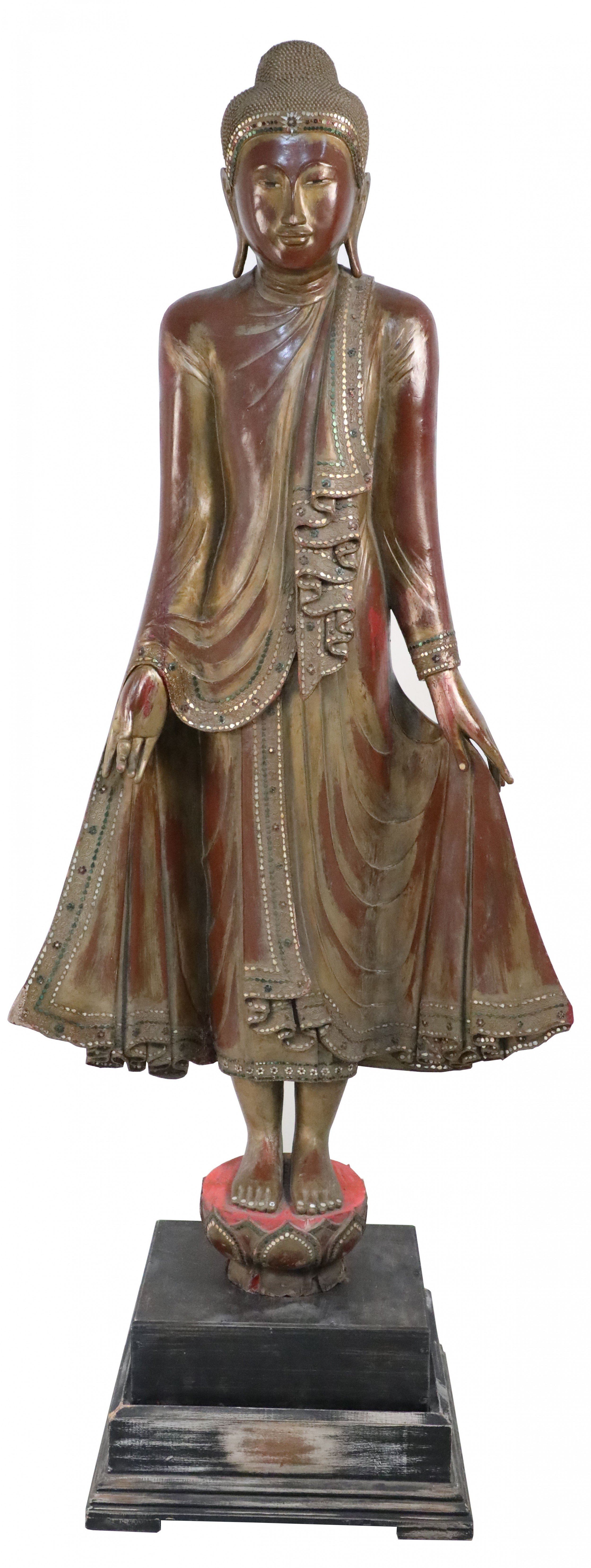 4 Thai-style gold and red carved wooden Bodhisattva statues wearing and holding robes, and standing on plinths (PRICED EACH).
