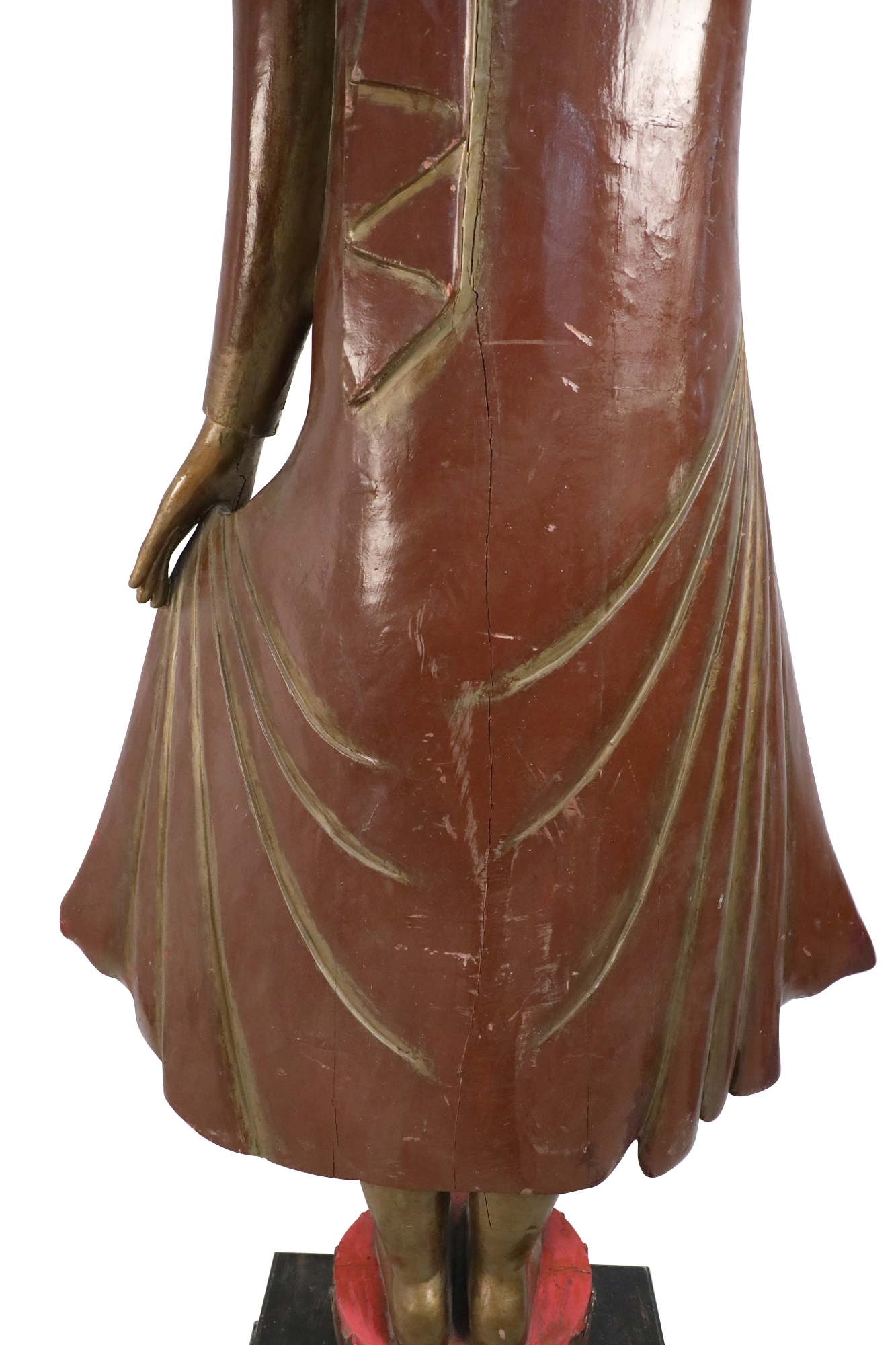 4 Thai-style gold and red carved wooden Bodhisattva statues wearing and holding robes, and standing on plinths (PRICED EACH)..