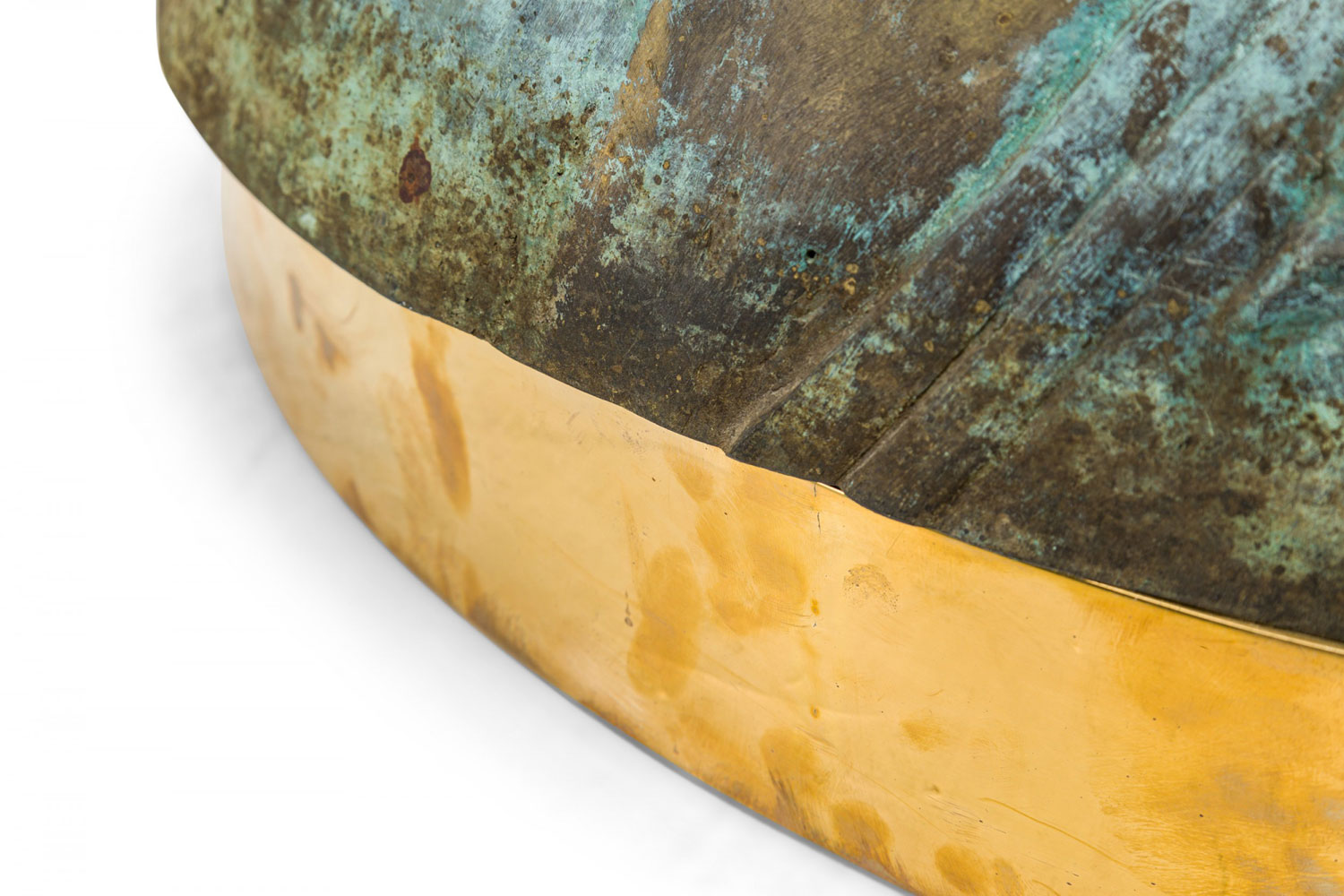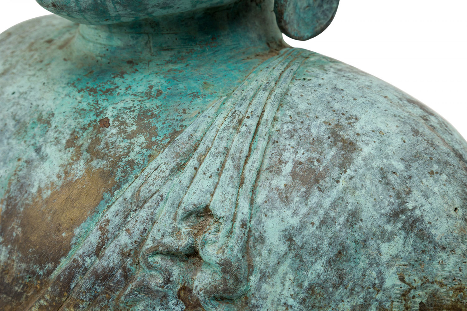 Vintage Tibetan bronze figural bust of the Buddha with a natural green patina, resting on an oval polished brass plinth..