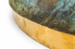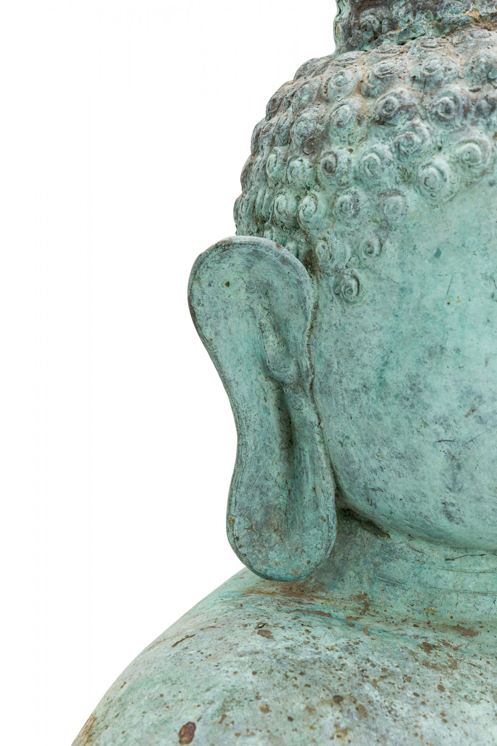 Vintage Tibetan bronze figural bust of the Buddha with a natural green patina, resting on an oval polished brass plinth.