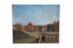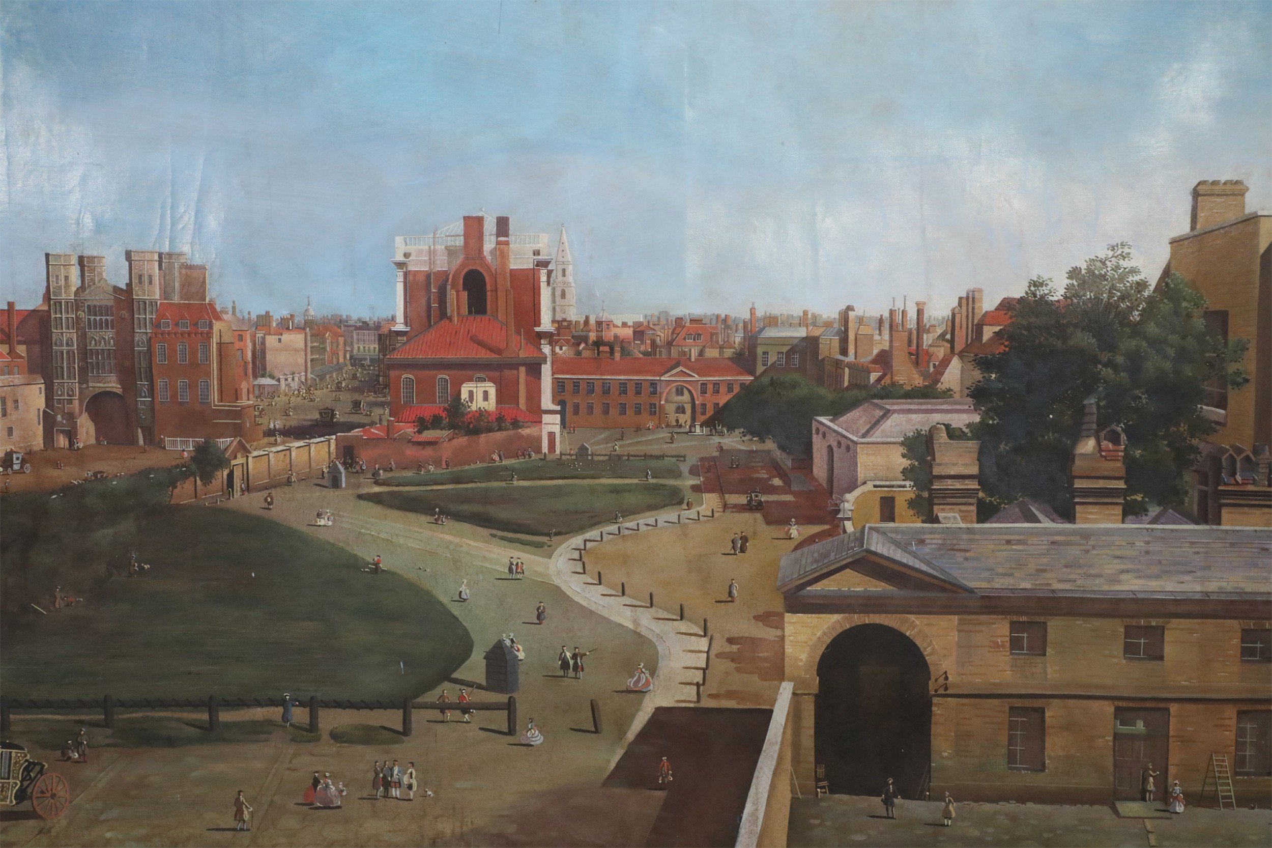 English Victorian style (20th Century) painting of an 18th century town square captured from above, depicting figures moving throughout, greenery and lanes in the center, and buildings far into the distance, under a large light blue sky. Painted on unframed, rectangular canvas..
