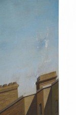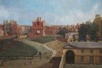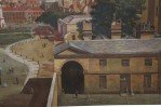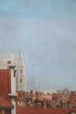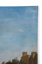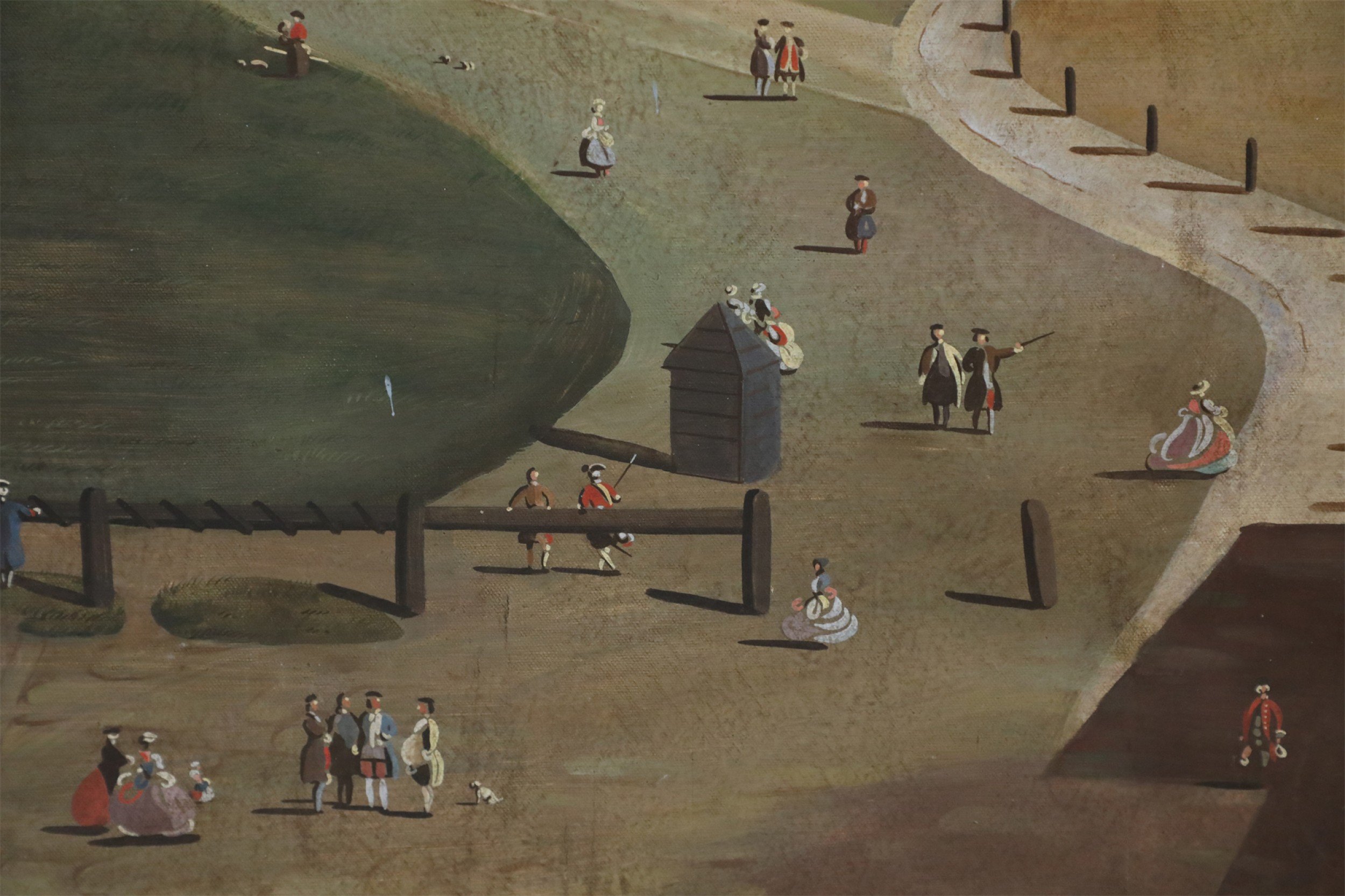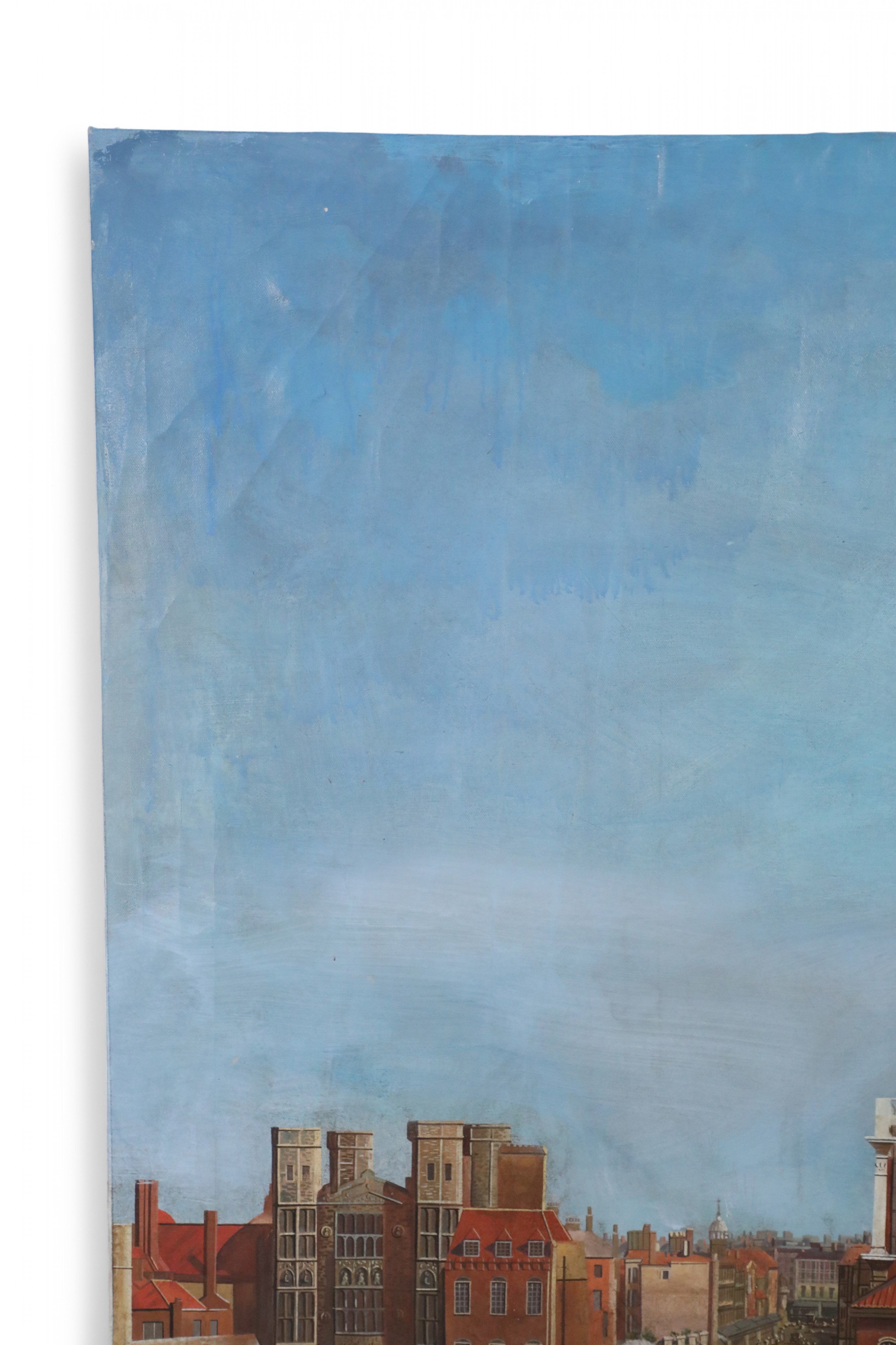 English Victorian style (20th Century) painting of an 18th century town square captured from above, depicting figures moving throughout, greenery and lanes in the center, and buildings far into the distance, under a large light blue sky. Painted on unframed, rectangular canvas.