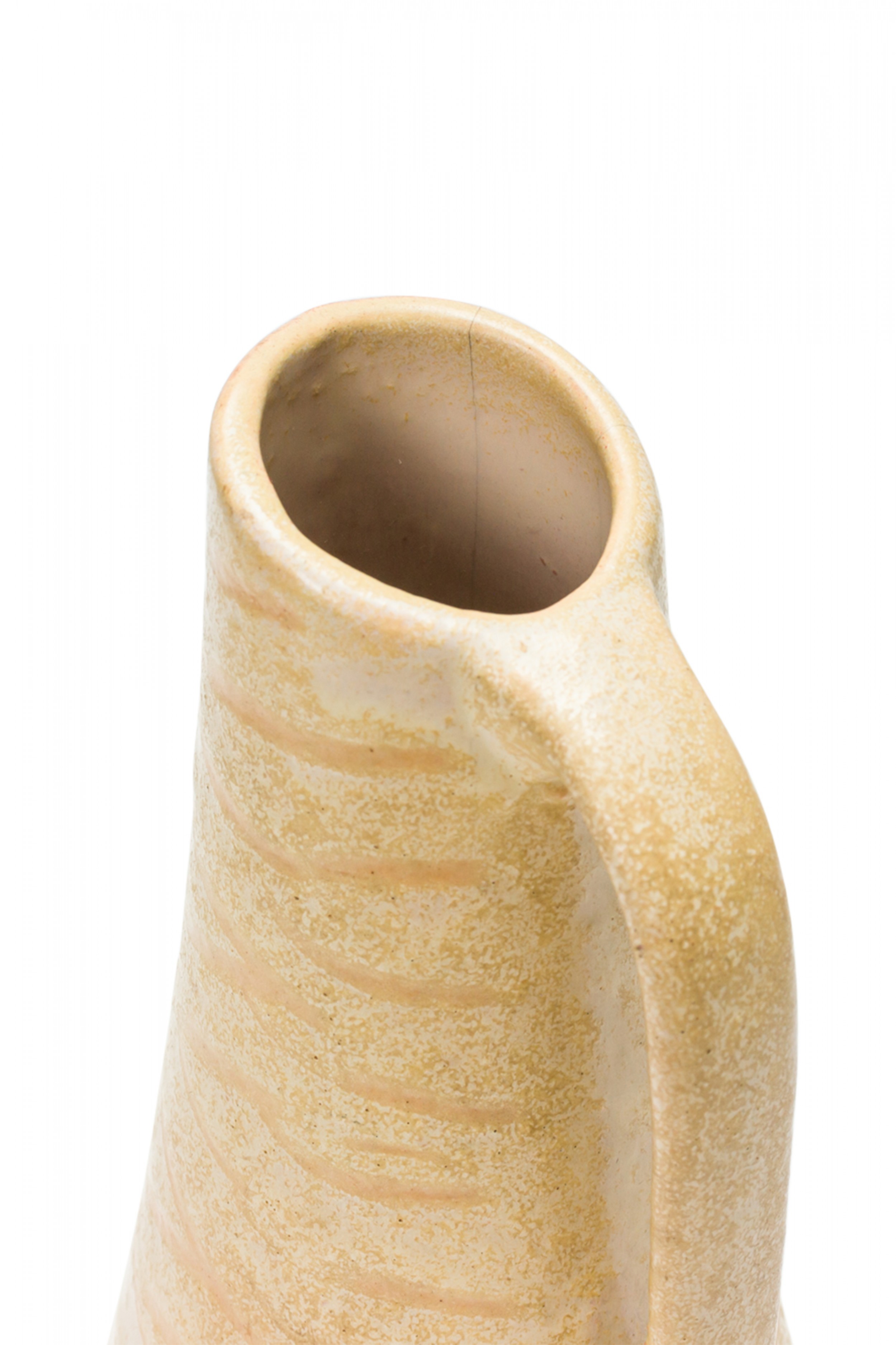 West German Mid-Century ceramic pitcher with a hand painted yellow stripe patterned glaze and a slanted spout. (mark on bottom "GERA" denoting model name from VEB Gräfenroda).
